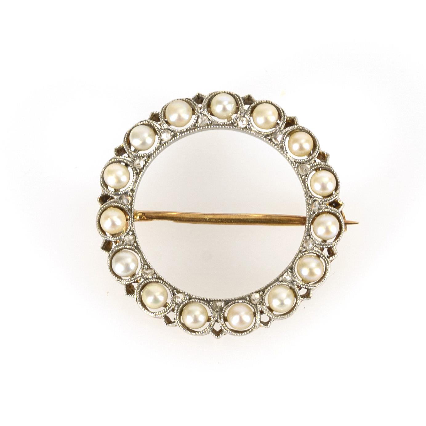 Kleine, runde Brosche aus der Zeit der Jahrhundertwende mit einem Besatz aus kleinen Perlen und Diamantsplittern. Zweifarbige Arbeit, zeittypisch schauseitig in Weißgold, und rückseitig in Gelbgold gestaltet.