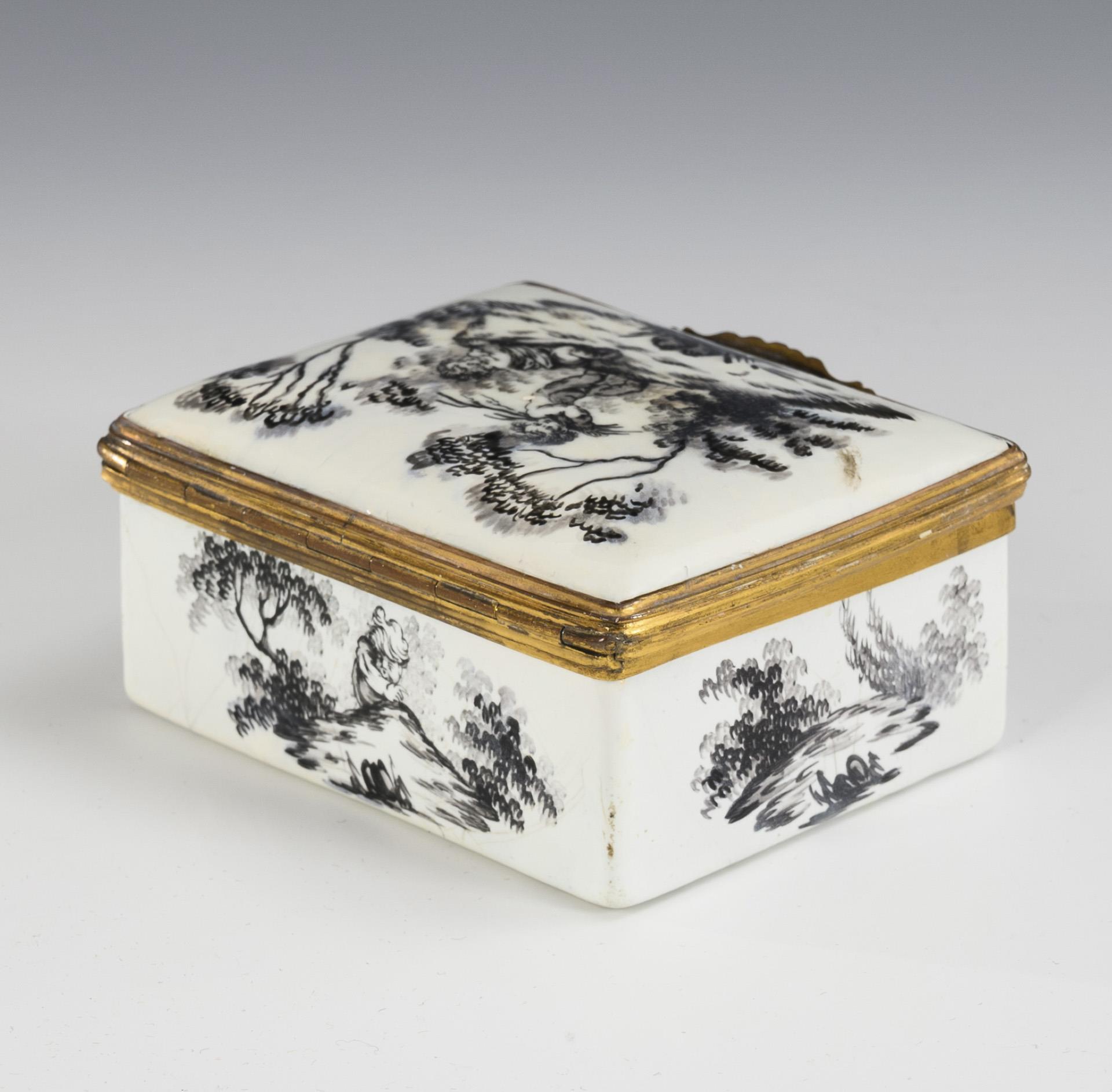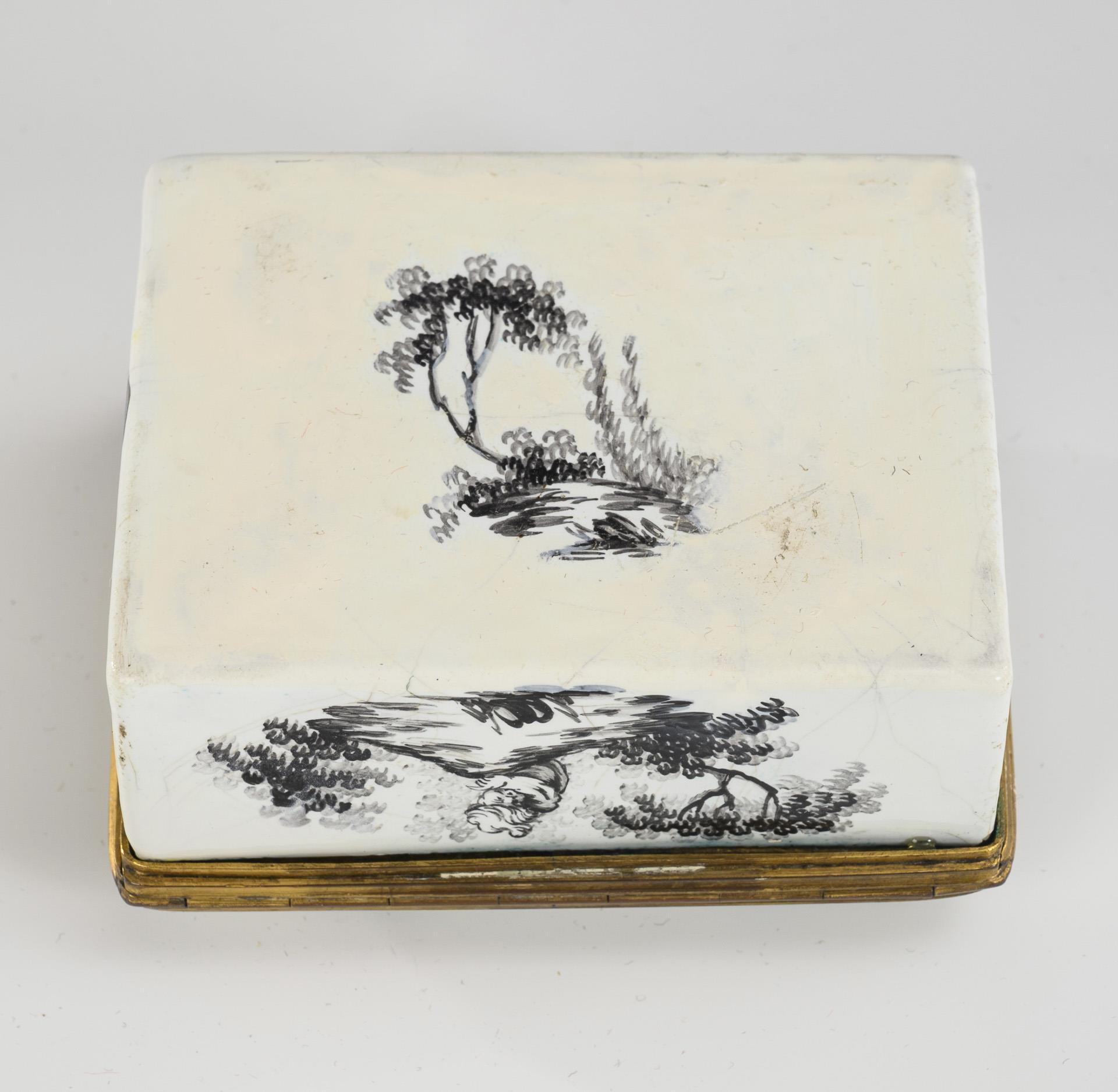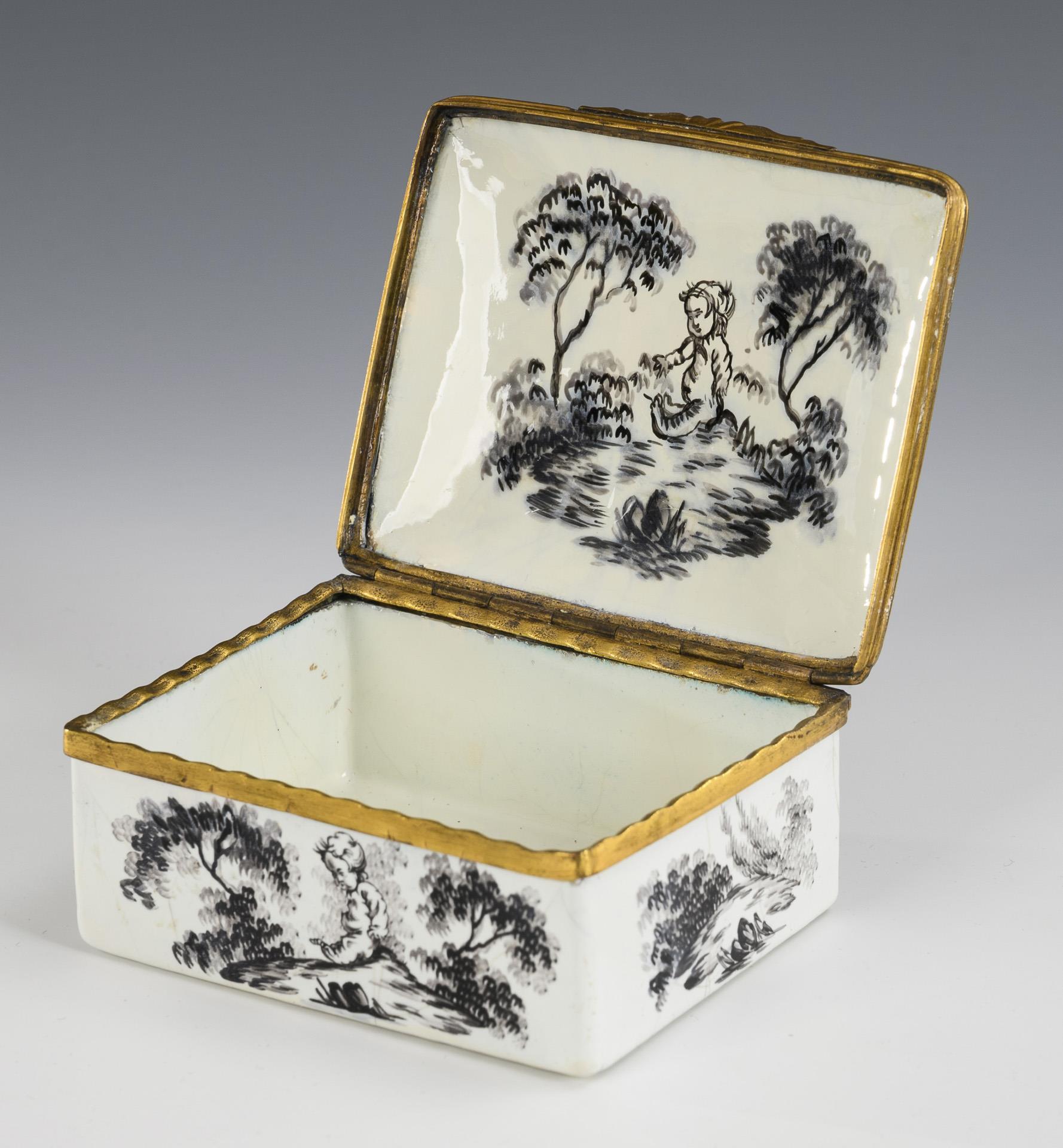 Weißes Email wohl auf Kupfer, Kupfermontierung goldbronziert, Grisaillemalerei. 4 x 8 x 6,5 cm. 122 g.