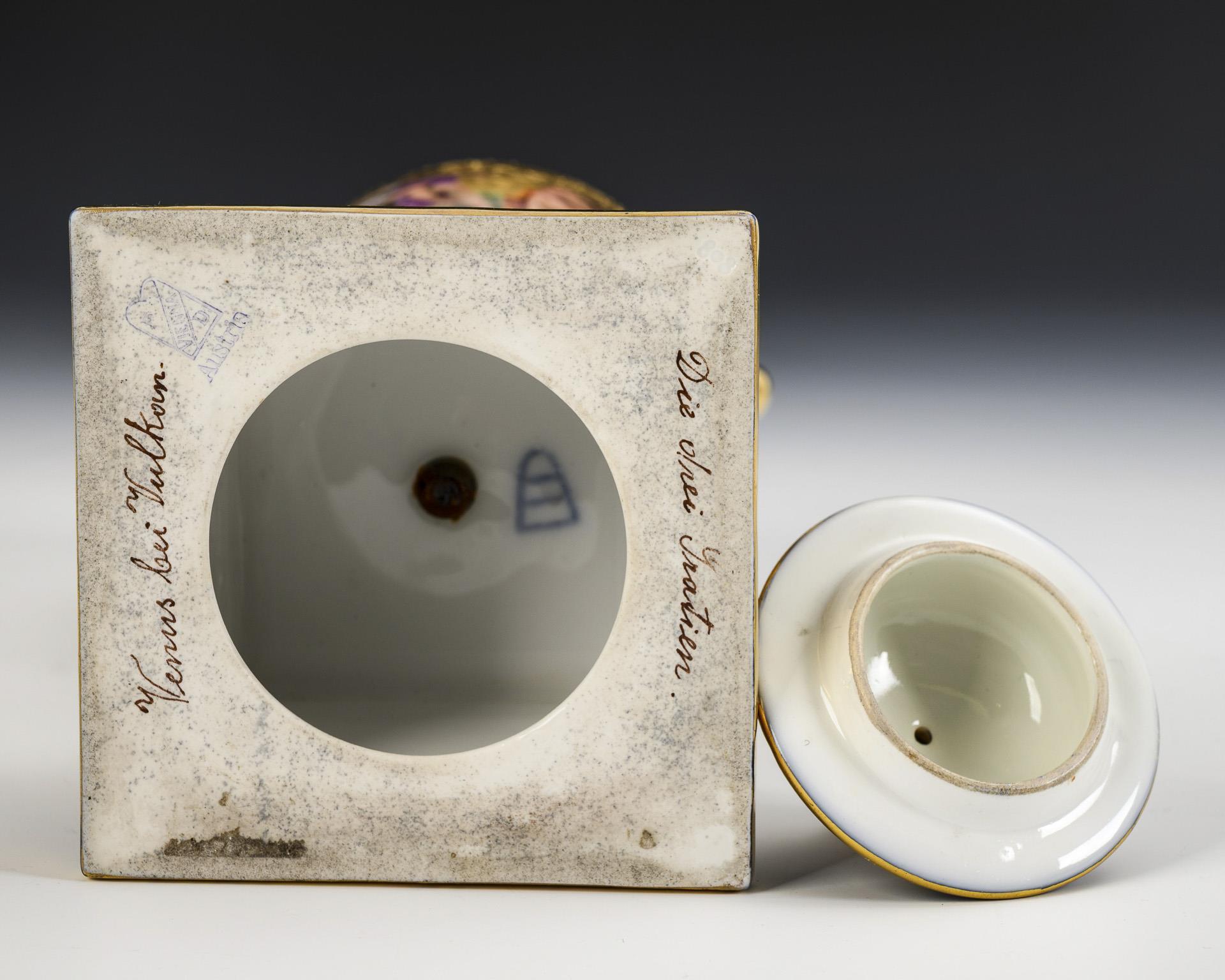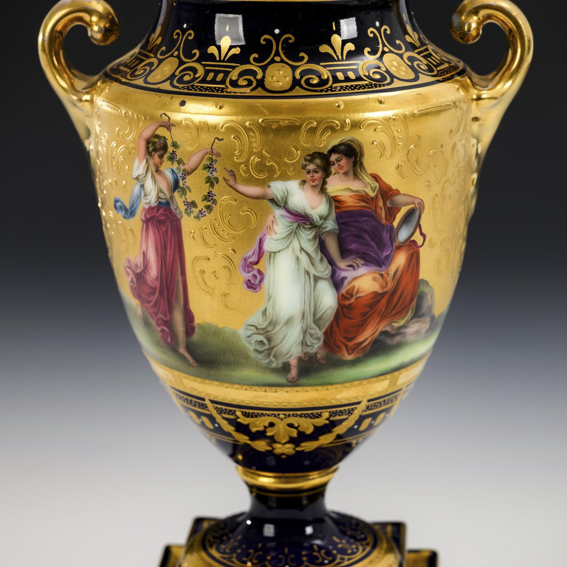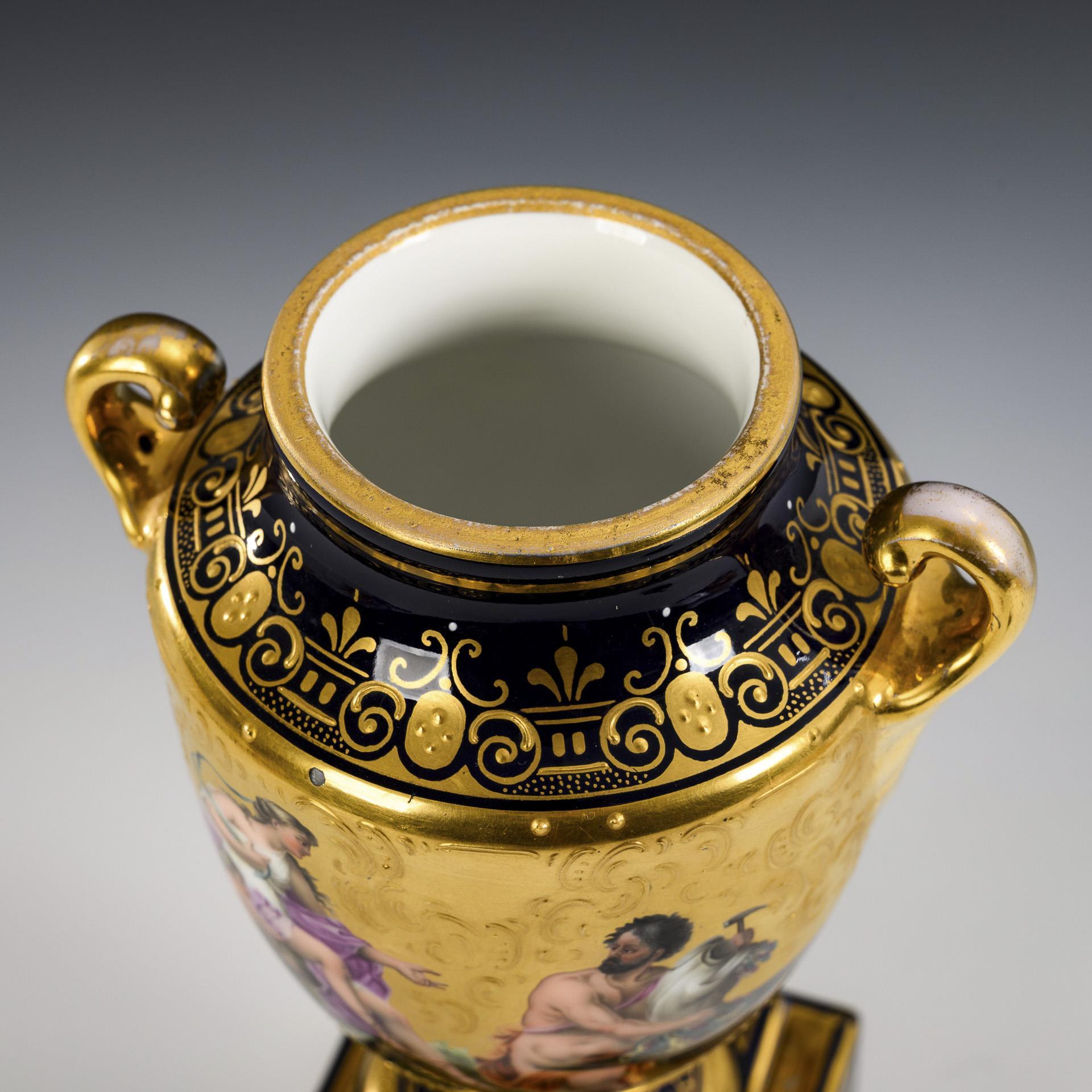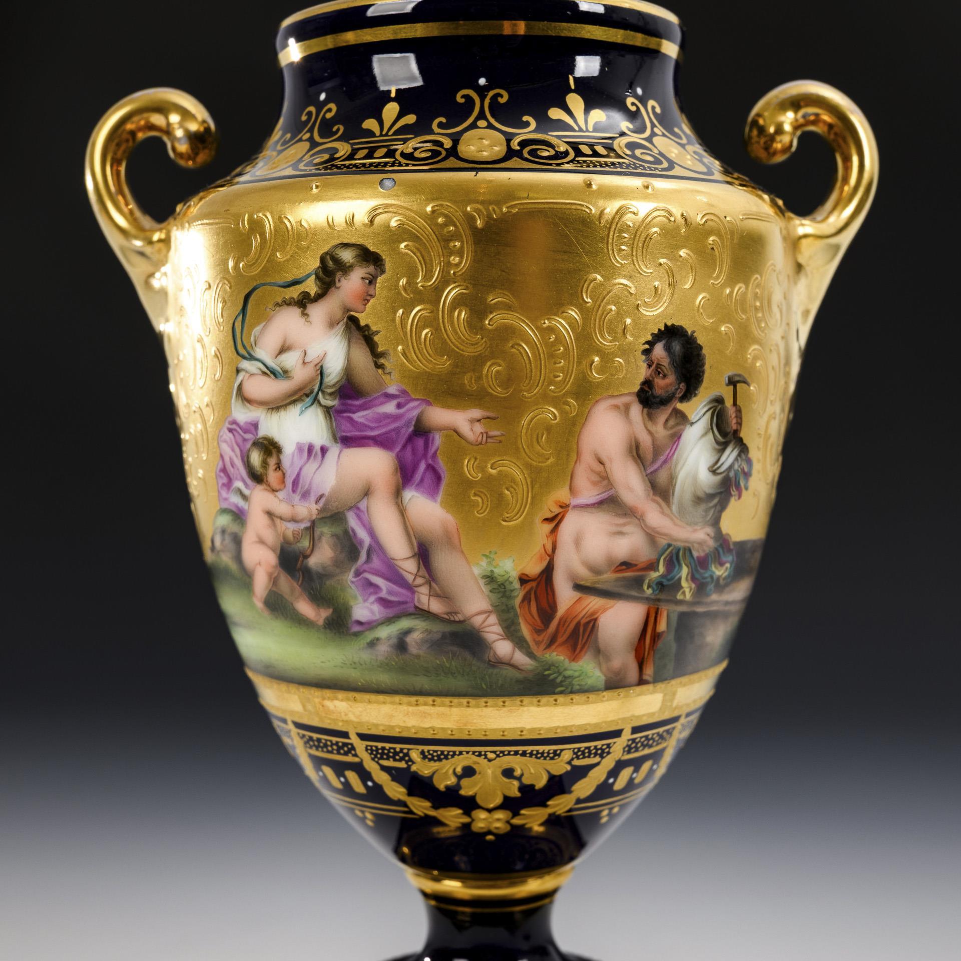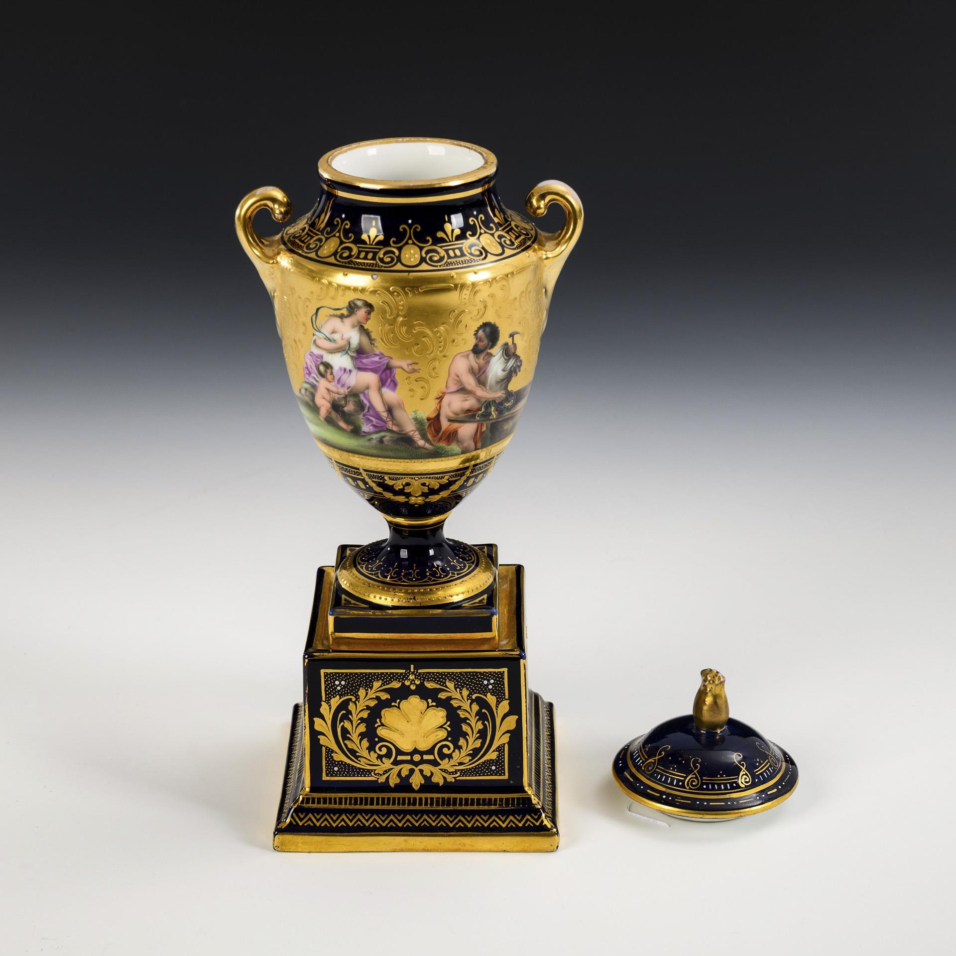 Ovoider Korpus mit zwei gerollten Henkeln, Knaufdeckel und Rundfuß, auf Quadratsockel. Kobaltblauer Fond mit reicher ornamental-vegetabiler, teils reliefierter Goldmalerei. Auf dem Korpus vor goldenem Fond mythologische Motive, unterseitig bezeichnet "Venus bei Vulkan" und "Die drei Gratien". Deckel restauriert.