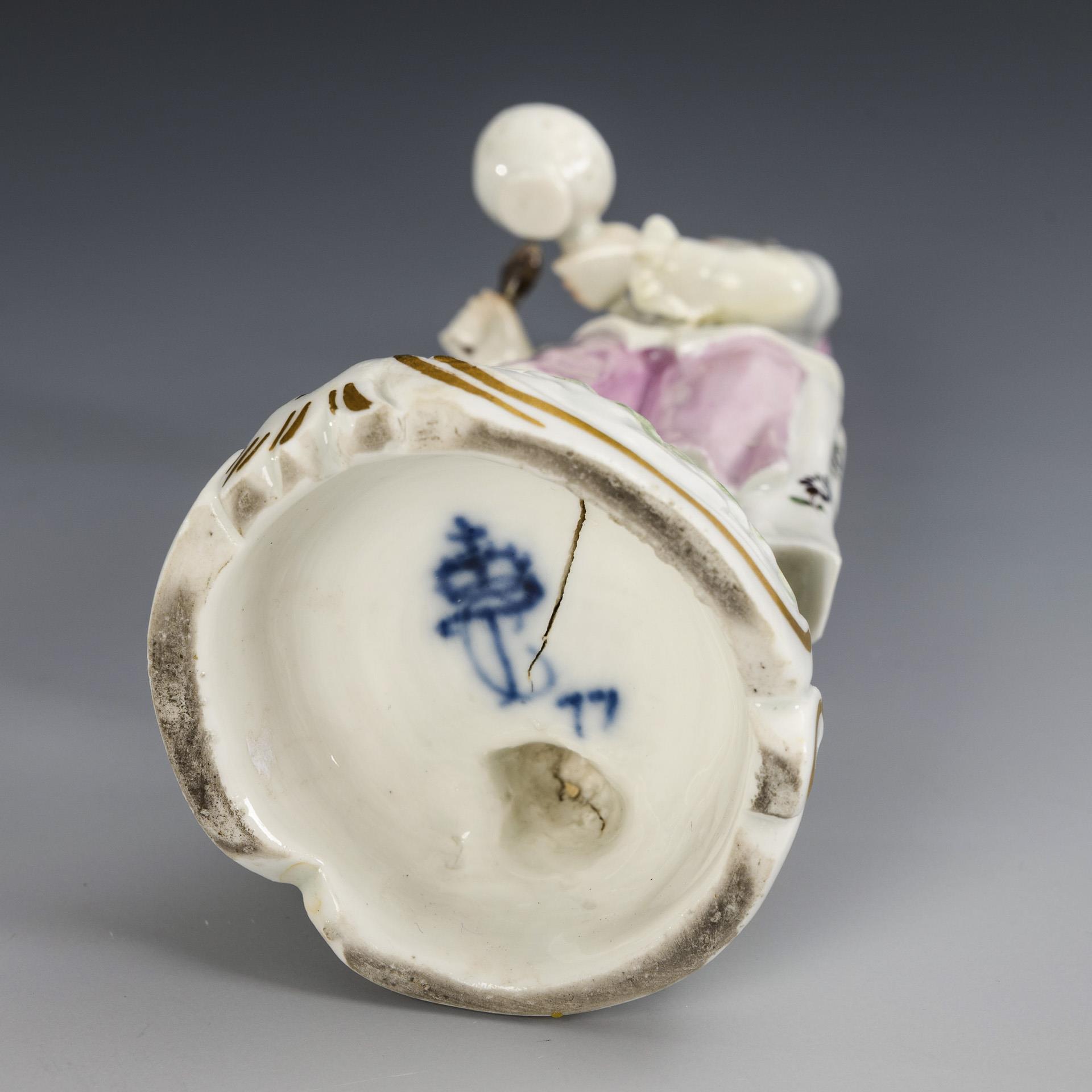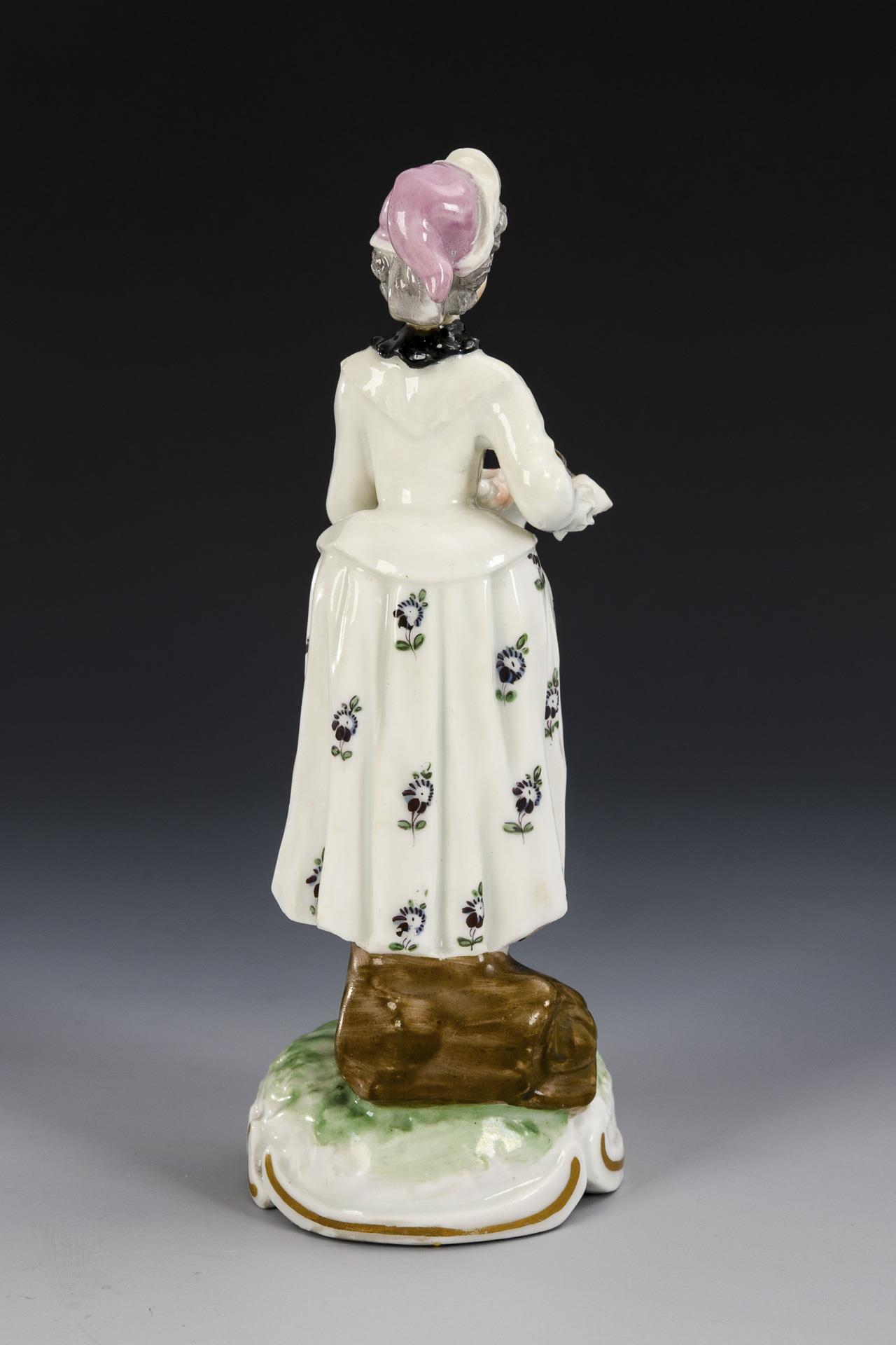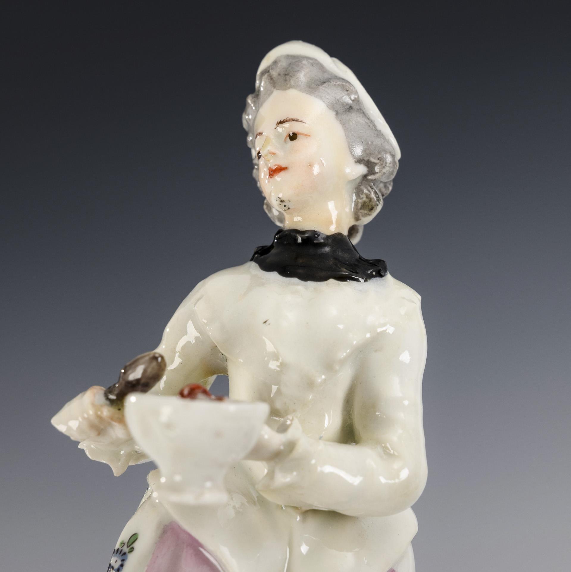 Auf einem hohen Natursockel stehende Verkäuferin mit Schale und Löffel. Unterseitig Brandriss im Sockel, Oberkörper, Arme und Haube restauriert.