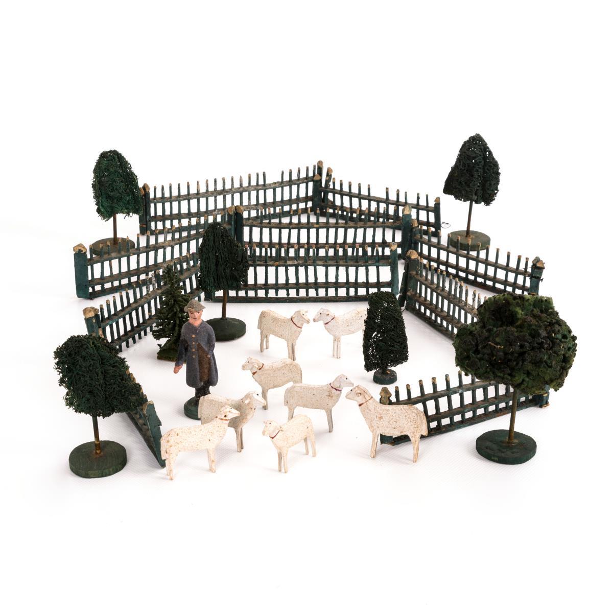 Schäfer aus Papiermaché, 8 Schafe (Reifentiere), 10 Zaunelemente und 7 Luffa-Bäume. Teils mit Defekten.