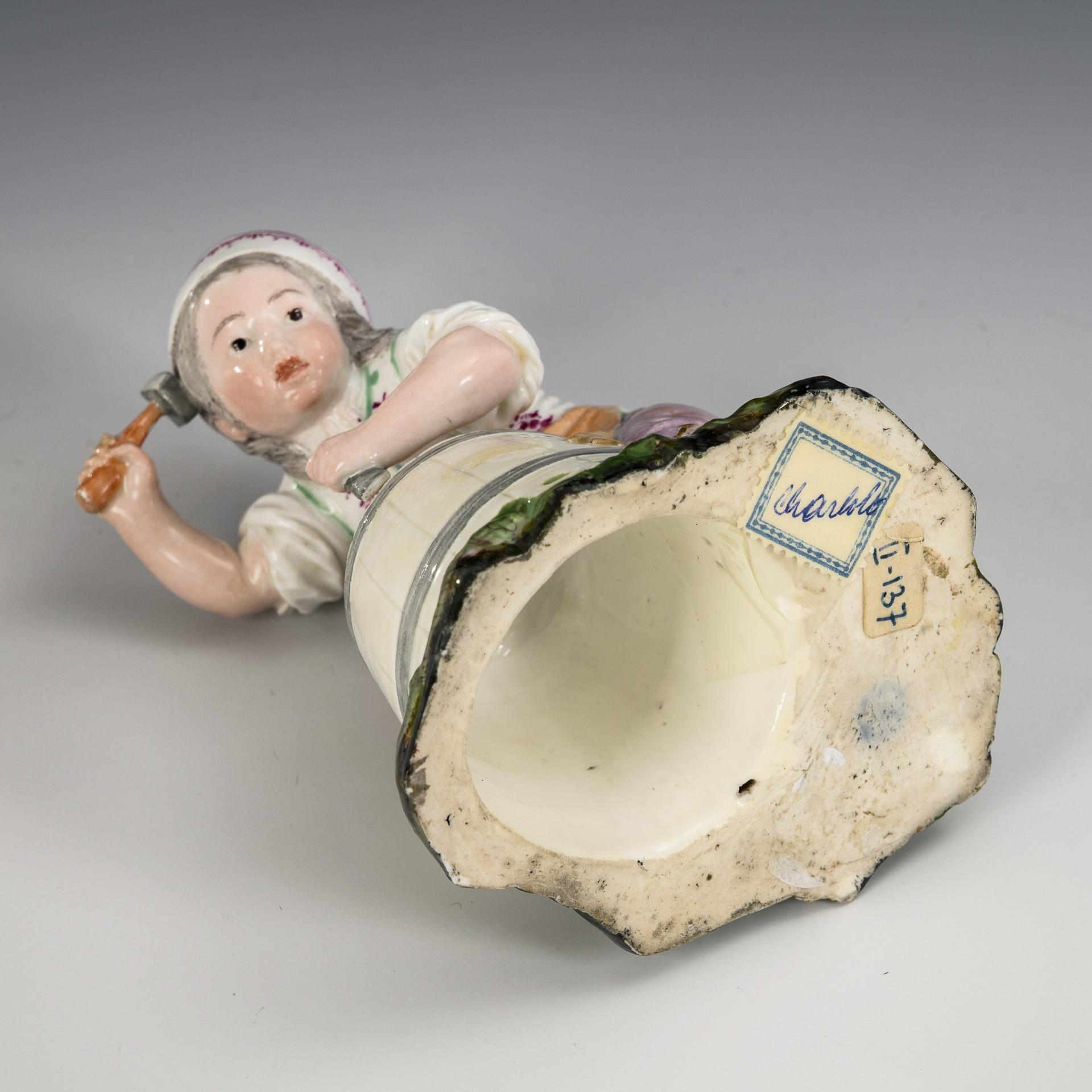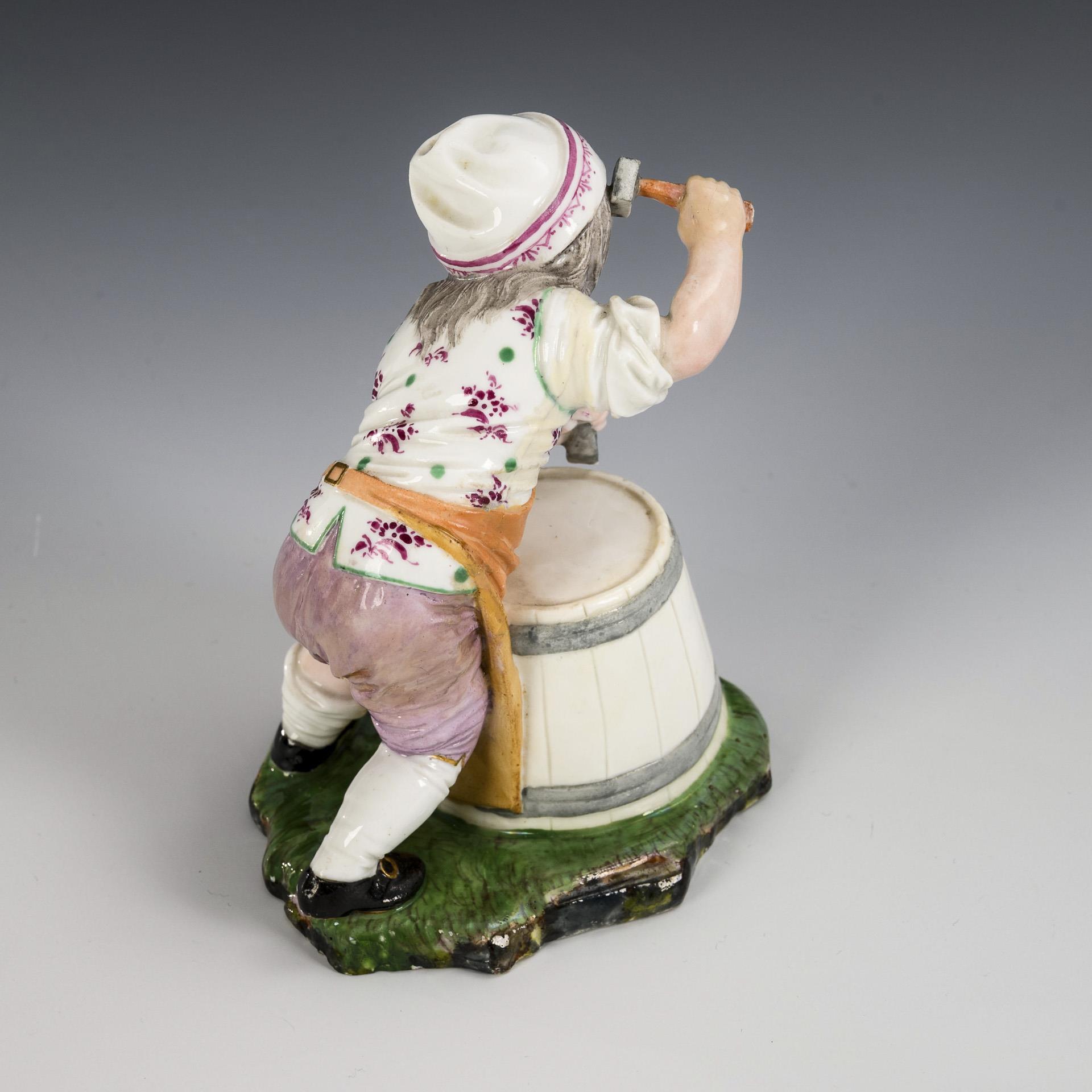 An einer Holzbutte arbeitender Büttner-Knabe, auf Grassockel. Restaurierung an den Beinen, reche Hand restauriert.