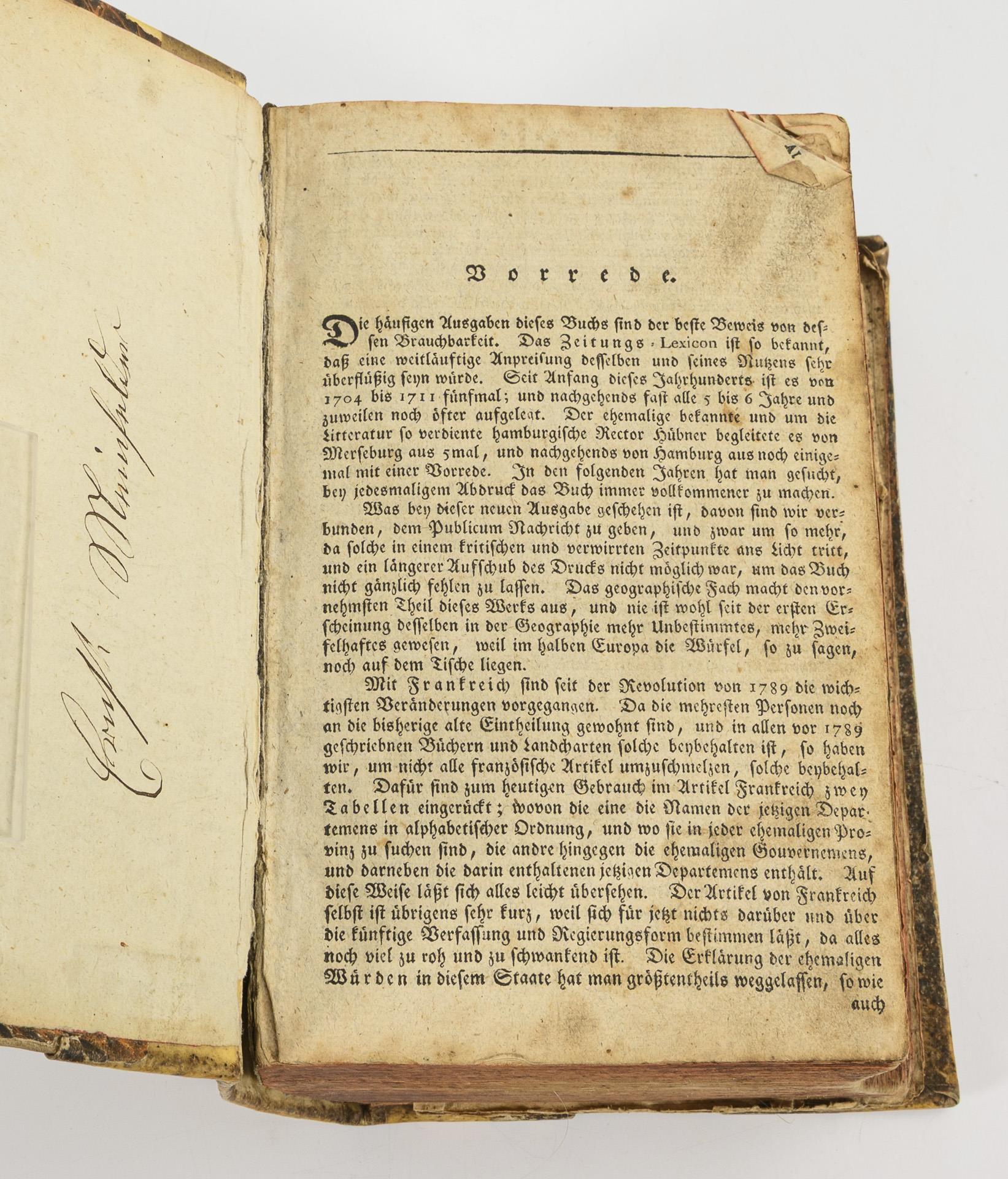 Ohne Titelblatt, 2819 Seiten und 8 Tafeln im Halbpergamenteinband. Im Vorwort wird auf die vielen geopolitischen Änderungen Bezug genommen (Französische Revolution, Polnische Teilung, Niederlande, ... die im Nachschlagewerk ihre Spiegelung finden. Das Werk ist zweispaltig gedruckt, die Tafeln sind vollständig, aber sehr verknittert und leicht beschädigt.