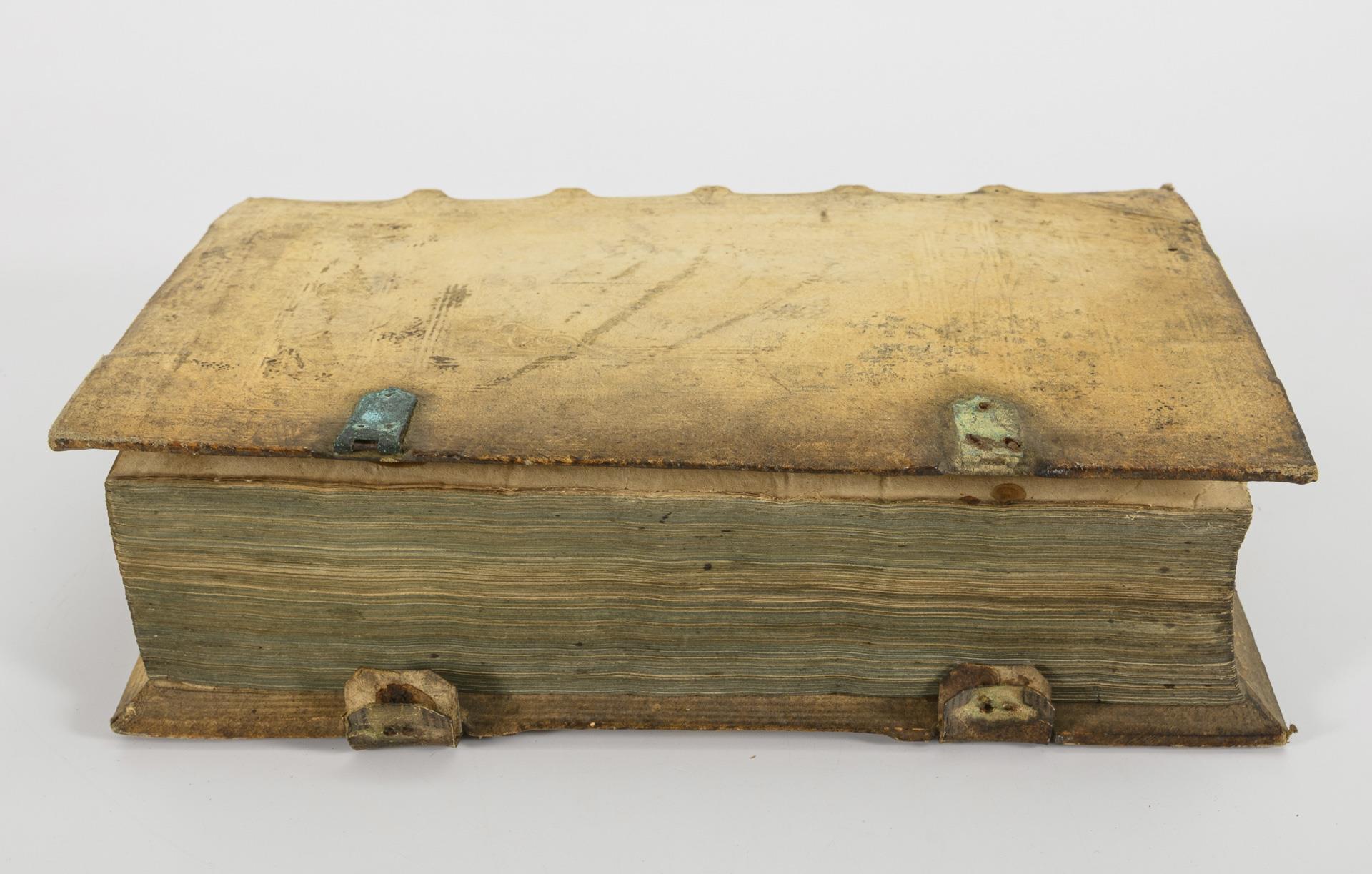 Titelkupfer, (22), 848, (90) Seiten im geprägten Pergamenteinband. Schließen defekt, sonst altersgemäß guter Zustand mit einigen handschriftlichen Bemerkungen und Flecken im Vorsatz.