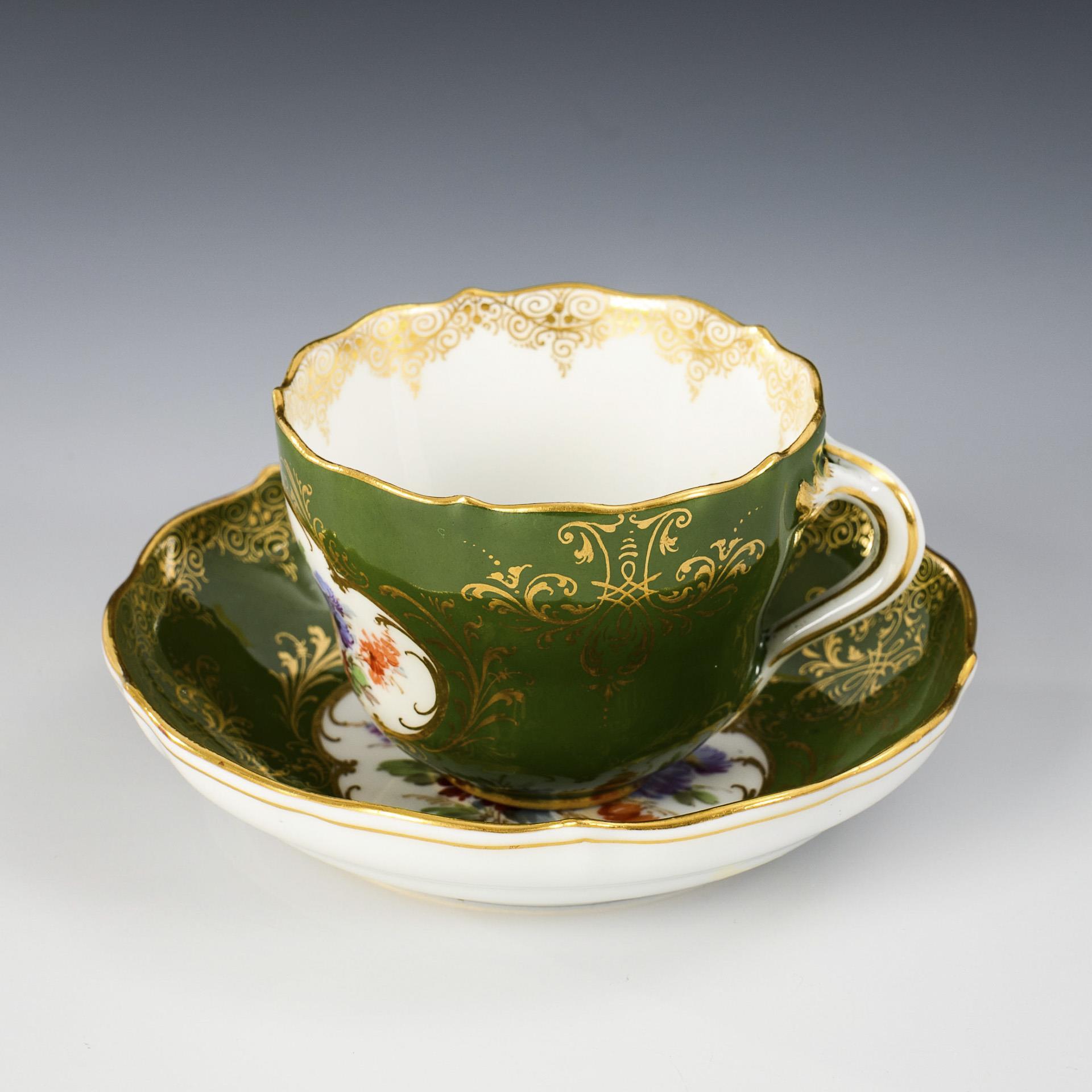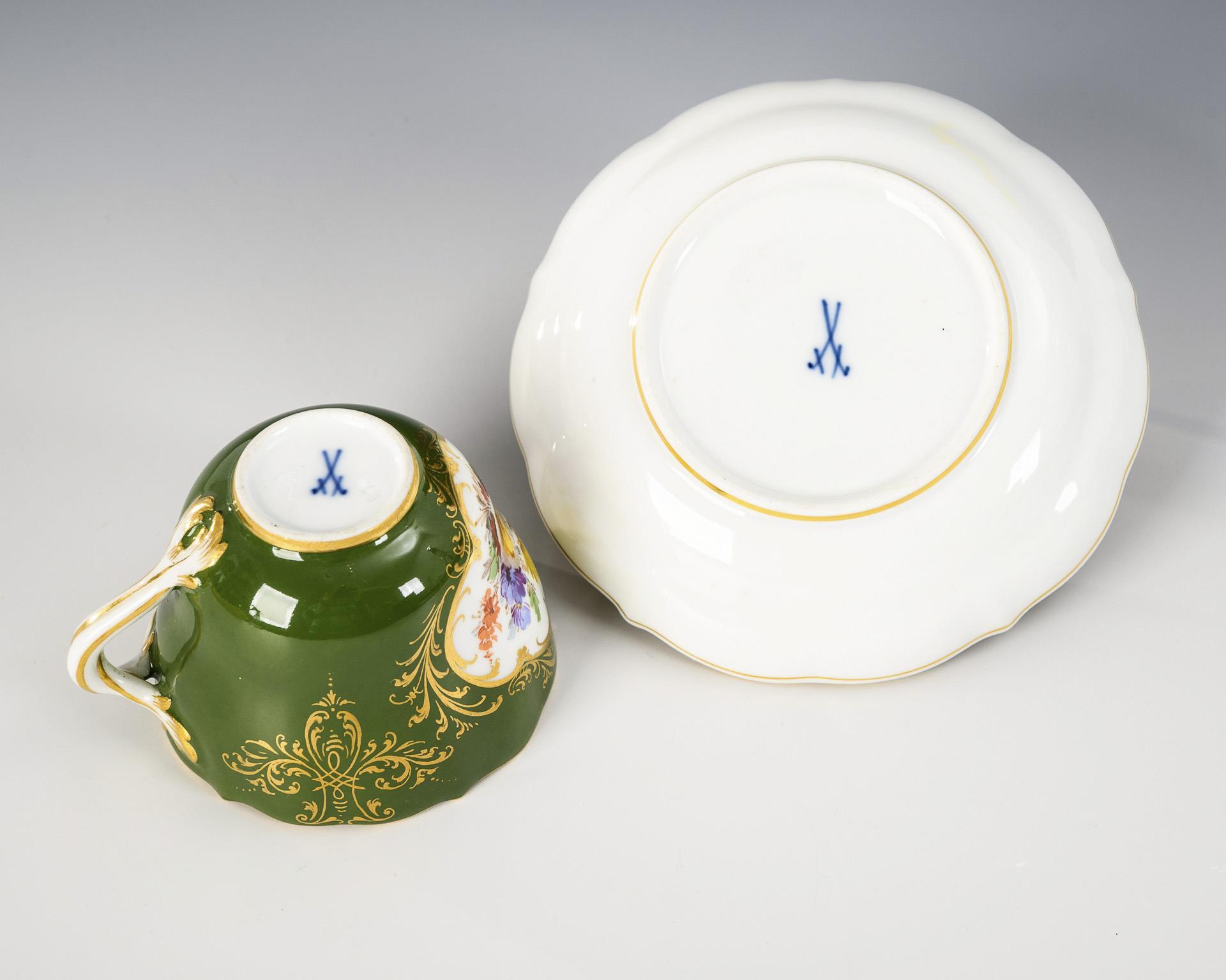 Mokkatasse mit grünem Fond und Blumenmalerei. Meissen.