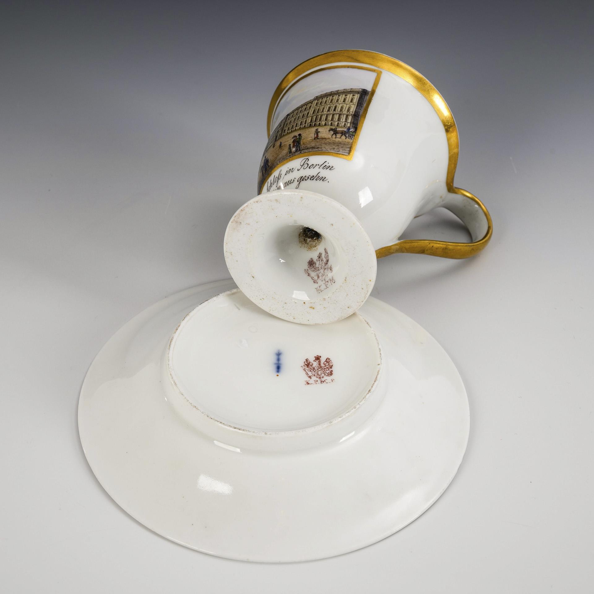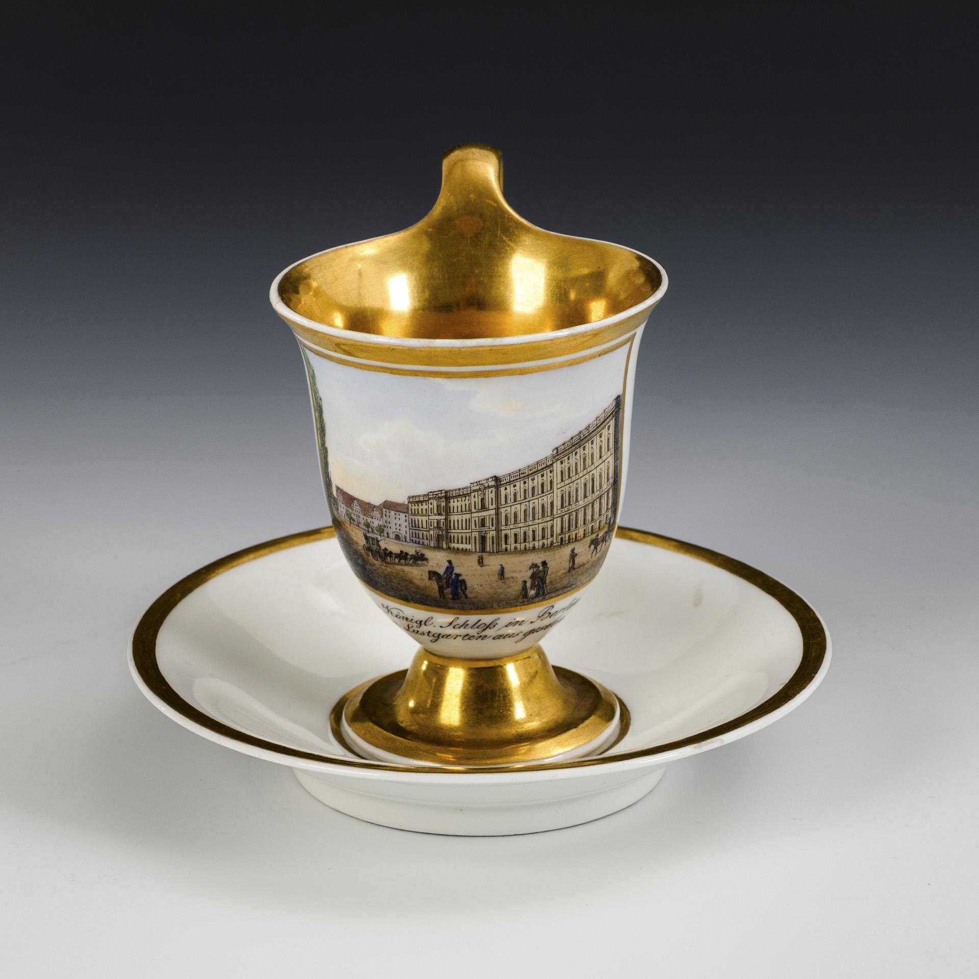 Gefußte Glockentasse mit Campanerhenkel. Schauseitig eine Rechteckkartusche mit der bezeichneten Ansicht des Königlichen Schlosses in Berlin vom Lustgarten her gesehen, innen vergoldet.