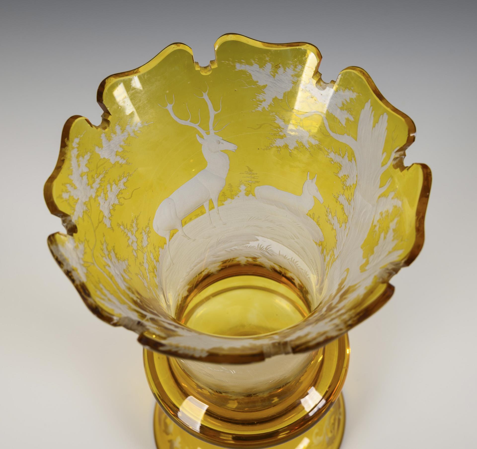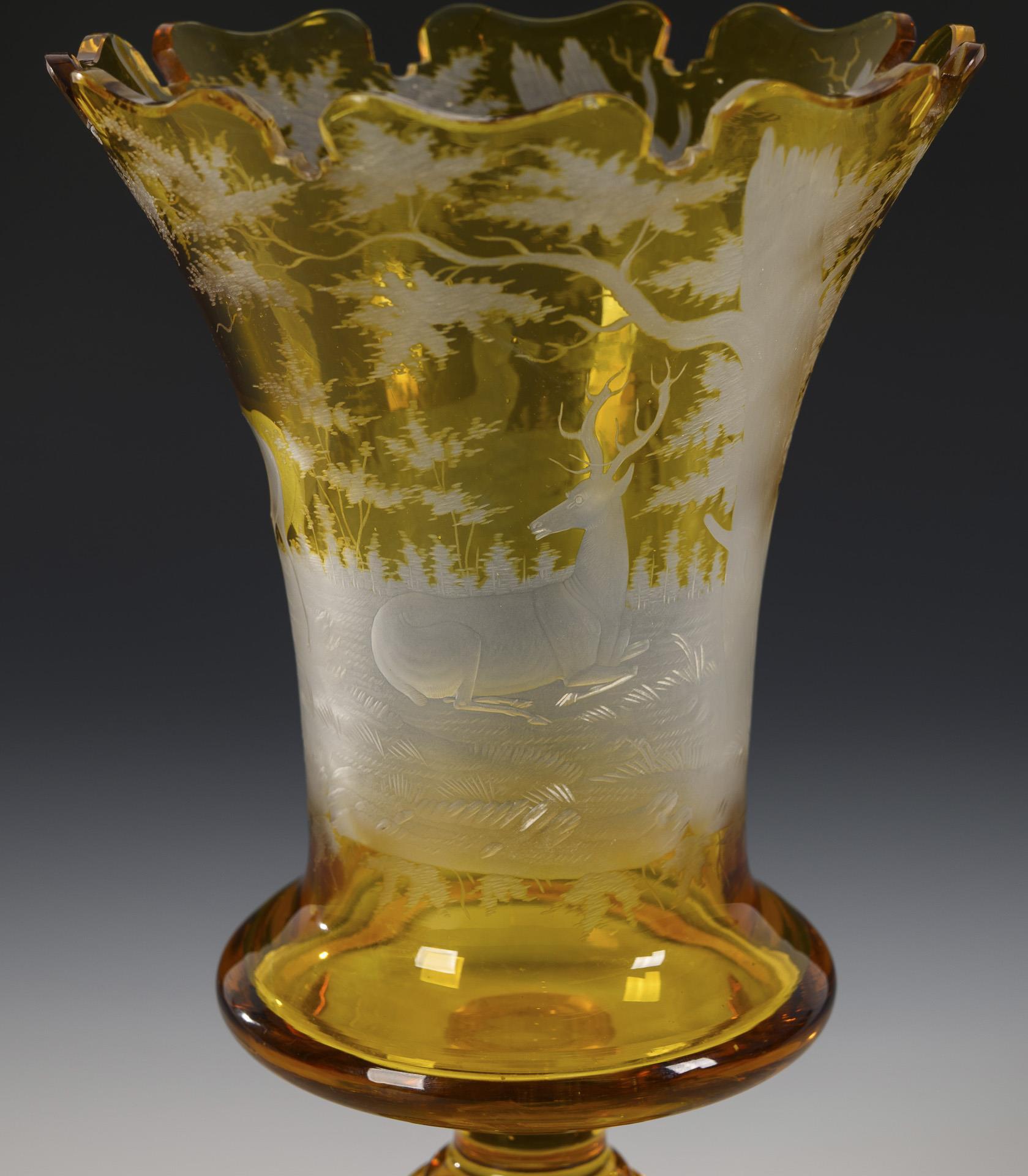 Am Ansatz geweitete Kraterkuppa, kurzer Schaft mit Scheibennodus, glockenförmiger Fuß. Auf der Kuppa eine geschnittene Waldlandschaft mit Hirschen und Hirschkuh.