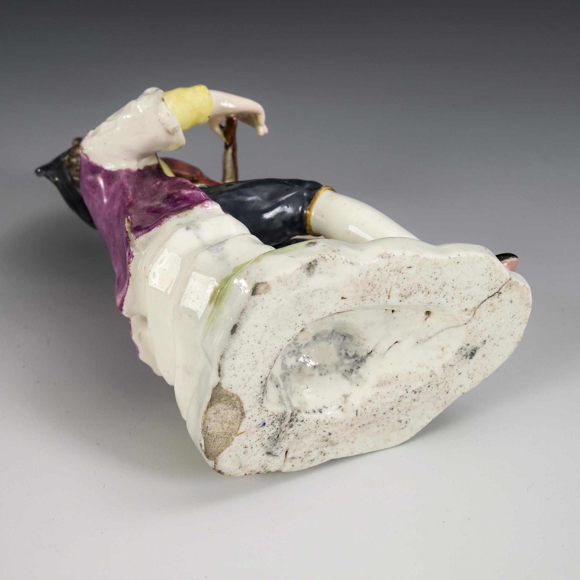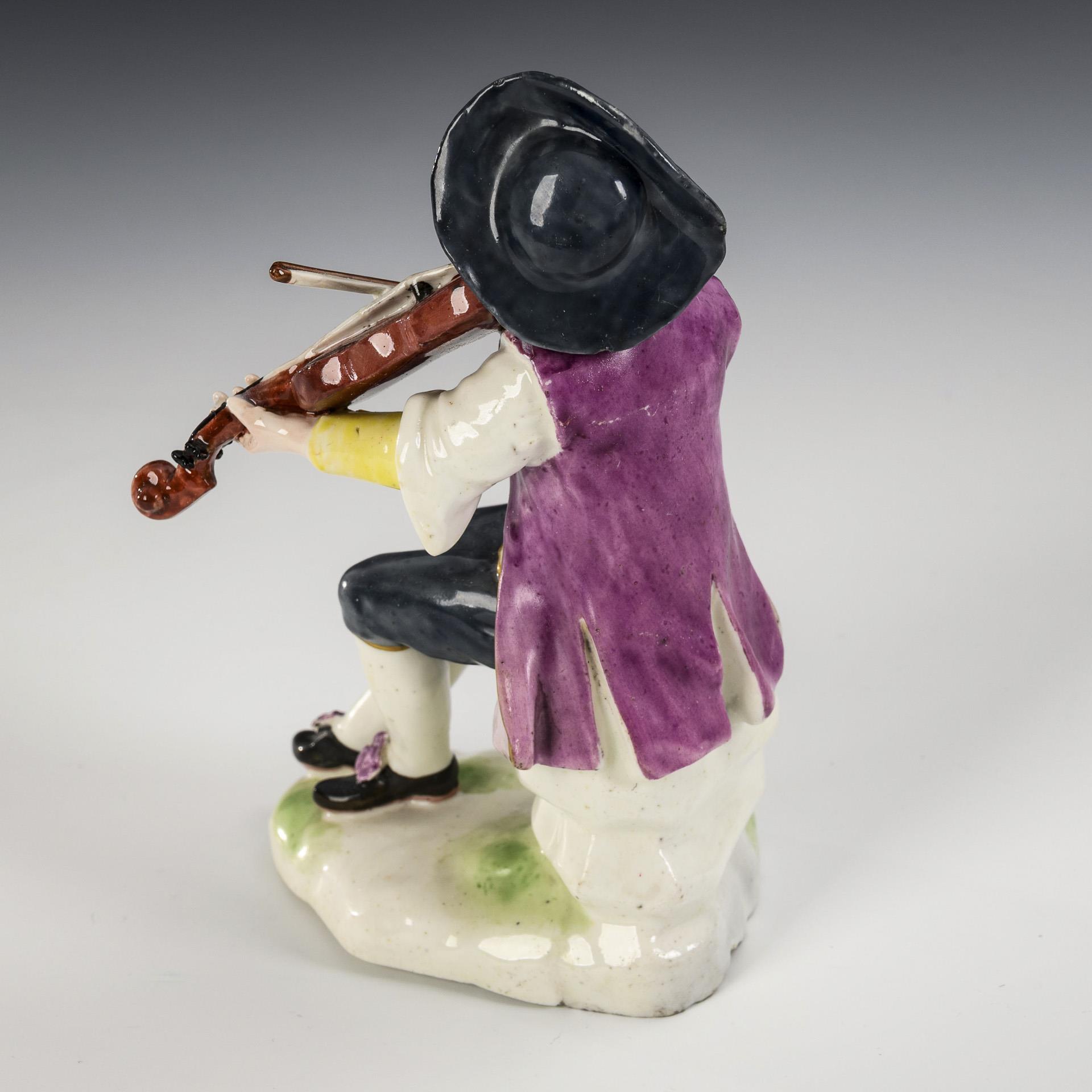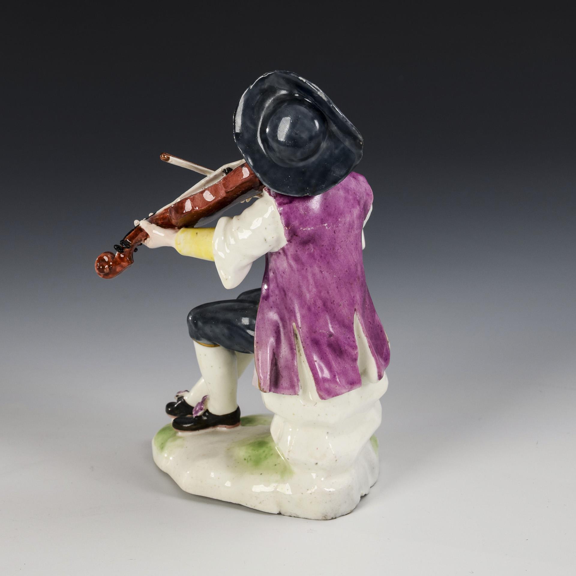 Auf einem Steinsockel sitzender, eine Geige spielender Knabe. 1 Brandrisse im Sockel, unterseitiger Chip am Sockelrand, Hut, rechter und linker Arm, Violine und Bogen restauriert.