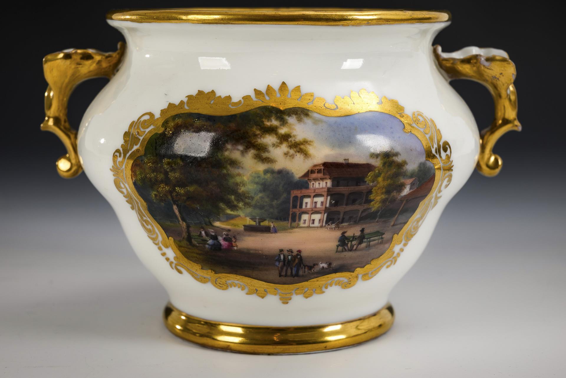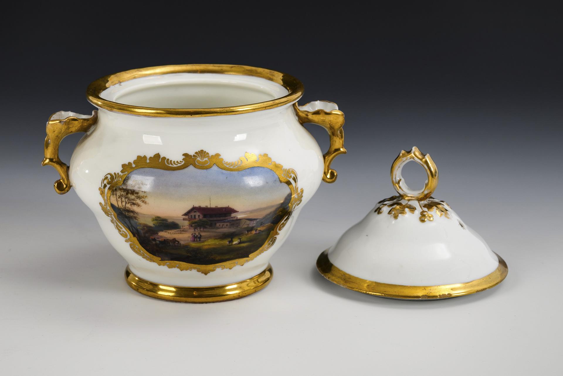 Gedrückt gebauchte Doe mit zwei Blatthandhaben und Ringknaufdeckel. Mit der Ansicht einer Berghauses bzw. eines Parkes mit Haus und Personen. Minimaler Goldabrieb.