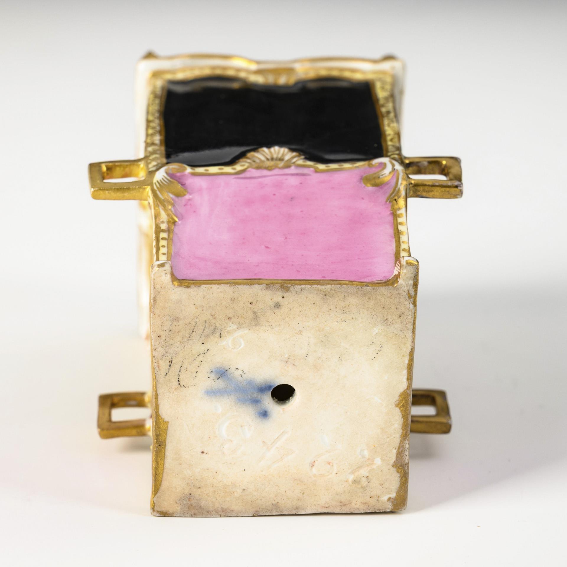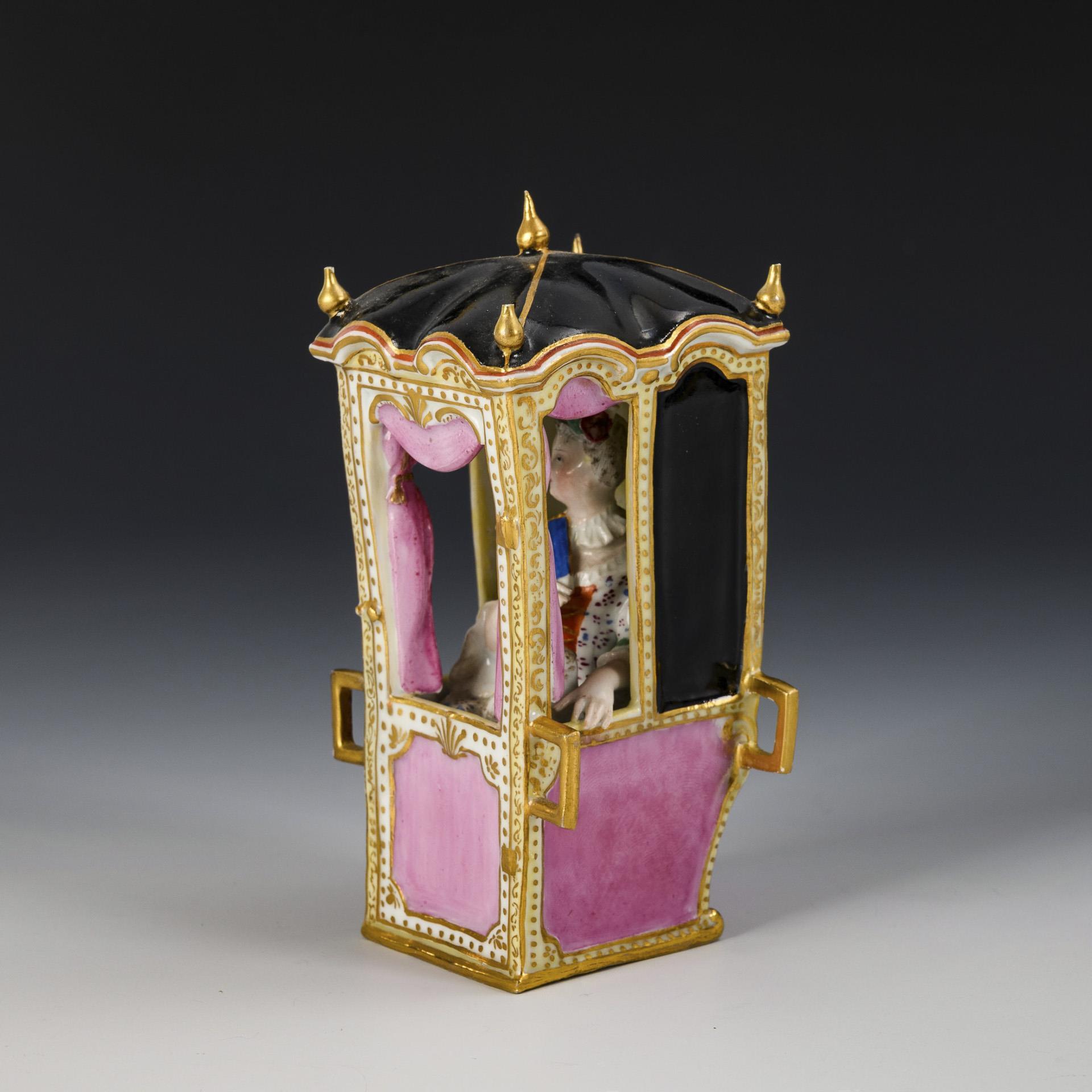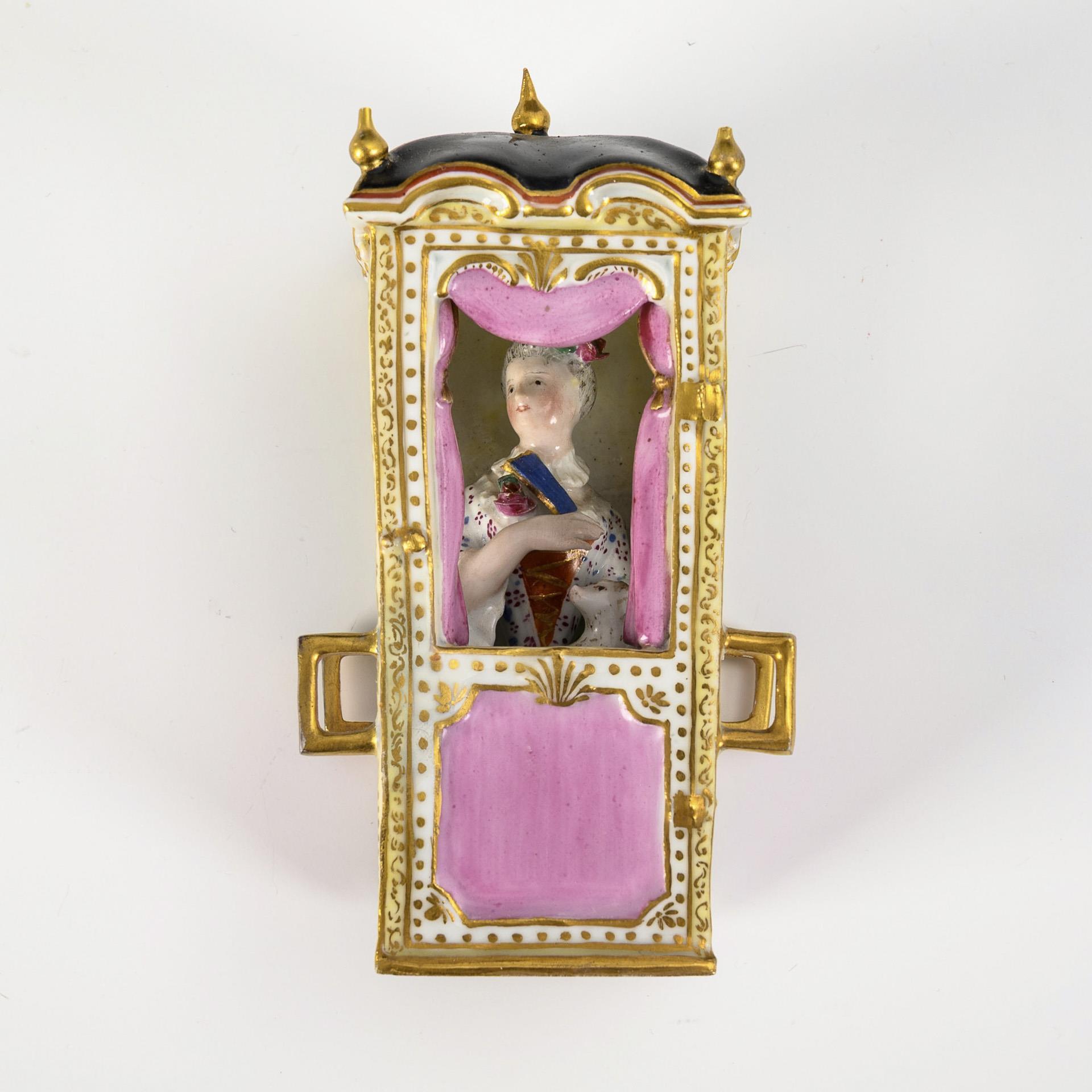 In einer Sänfte sitzende Dame, auf ihrem Schoß ein Hund liegend. Dachspitzen teils bestoßen, Griffe der Sänfte restauriert.
