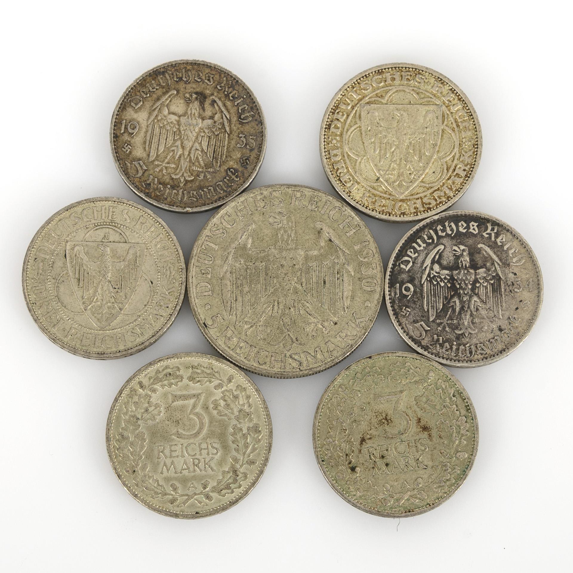 5 Reichsmark 1930, "Graf Zeppelin Weltflug 1919", geriffelter Rand. / 2x 3 Reichsmark, 1925, "Jahrtausenfeier der Rheinlande" Ritter auf ein Schild gestützt. Münzort A. / 2x 5 Reichsmark 1934, 1935, mit der Garnisionskirche Potsdam. / 3 Reichsmark "100 Jahre Bremerhaven", 1927, Münzort A. / 3 Reichsmark 1930, "Der Rhein Deutschlands Strom ...". Zustand: sehr schön.