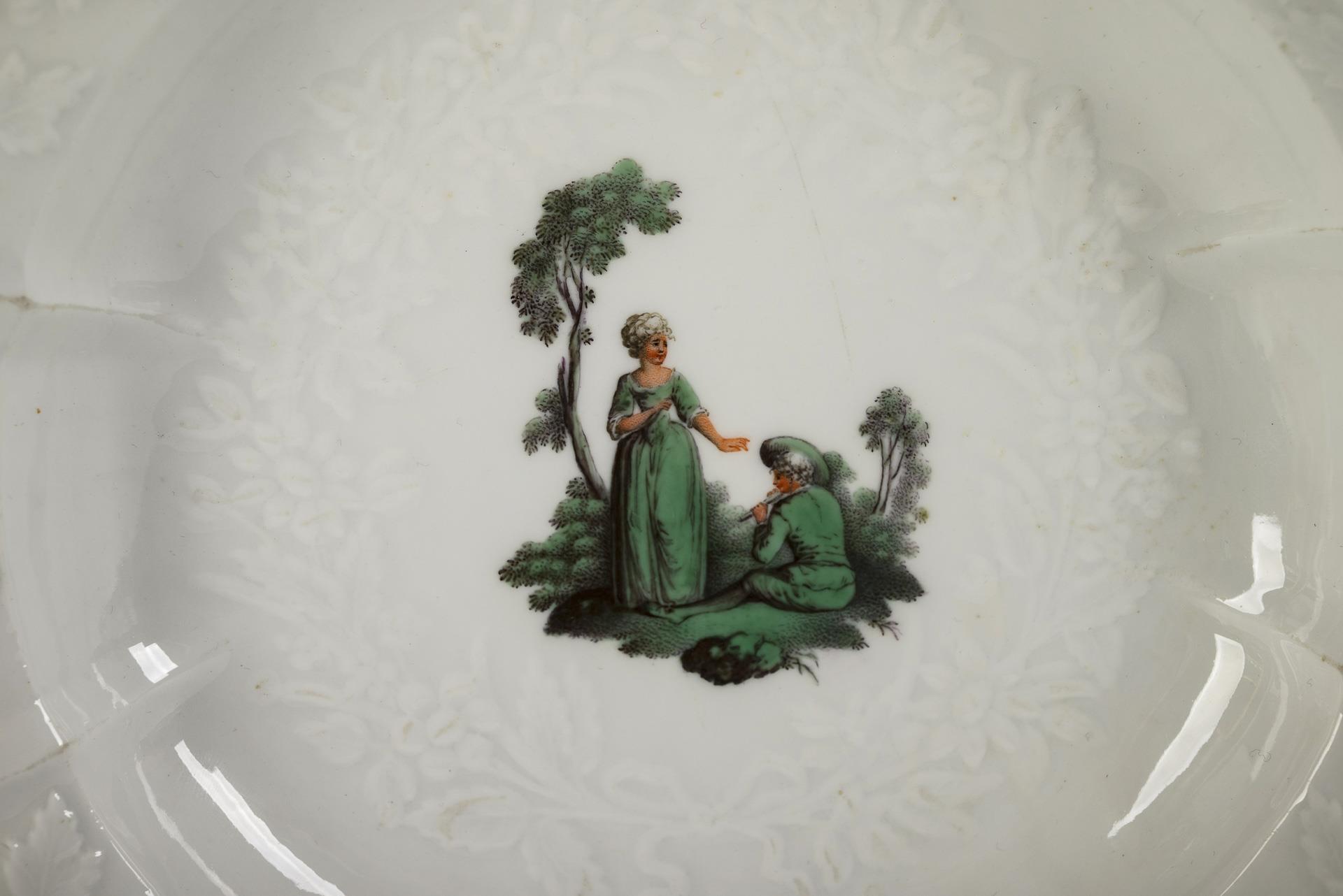 Suppenteller mit Gotzkowsky-Reliefdekor. Im Spiegel die kupfergrüne Darstellung eines galanten Paares in einer Parklandschaft, auf der Fahne kleine Blumenbuketts. Bestoßung am Standring, minimaler Goldabrieb am Rand.
