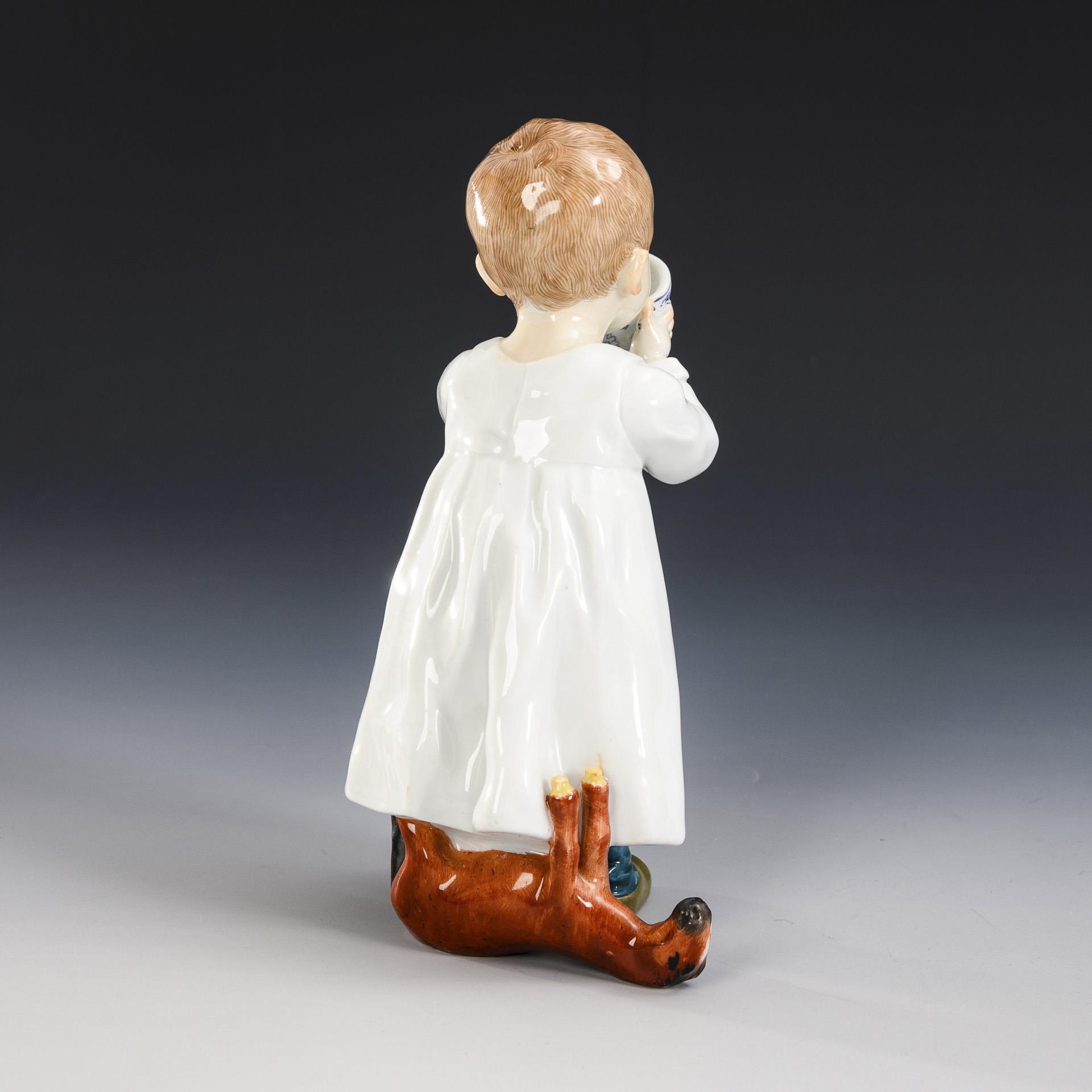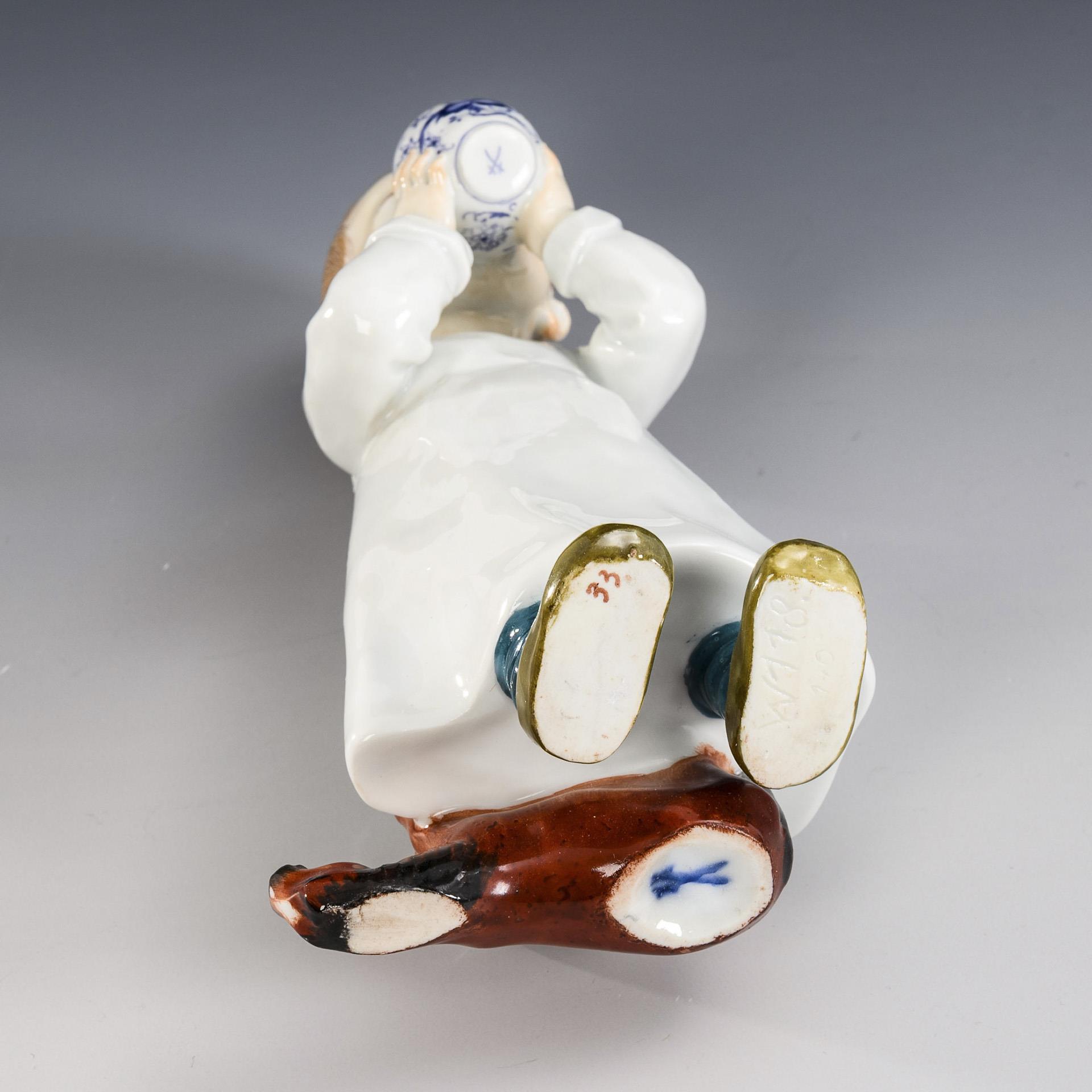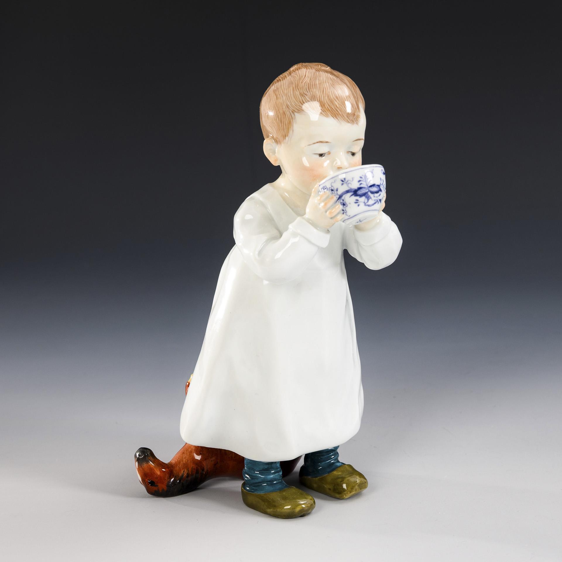 Aus einer Zwiebelmusterschale trinkendes Kind mit Spielzeugpferdchen. Pferd unterseitig und Kleid partiell restauriert.
