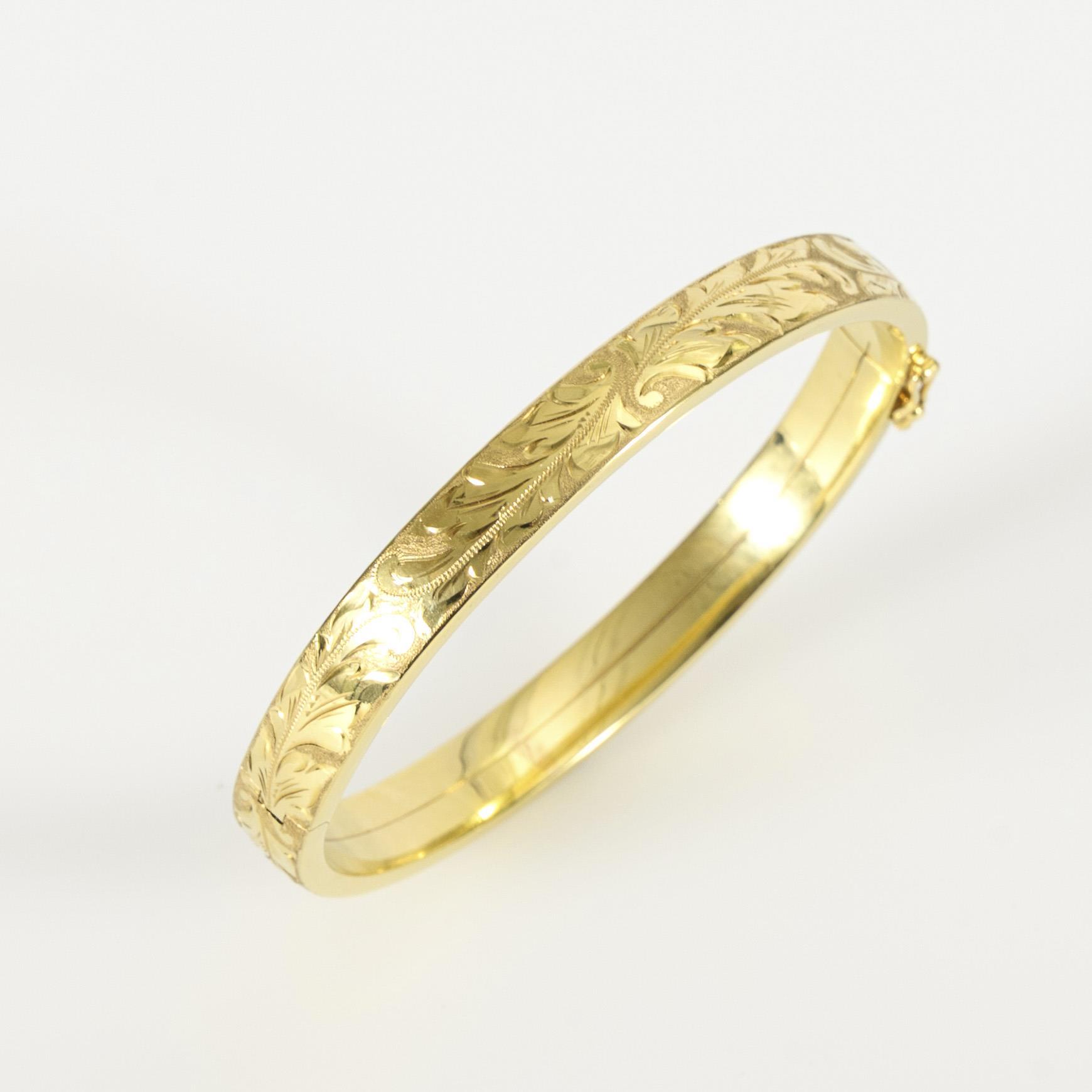 Armreif mit umlaufend blatt- bzw. rankenartigen Gravuren. Rückseitig mit Kastenschloss, dieses mit einfacher Achtersicherung.
