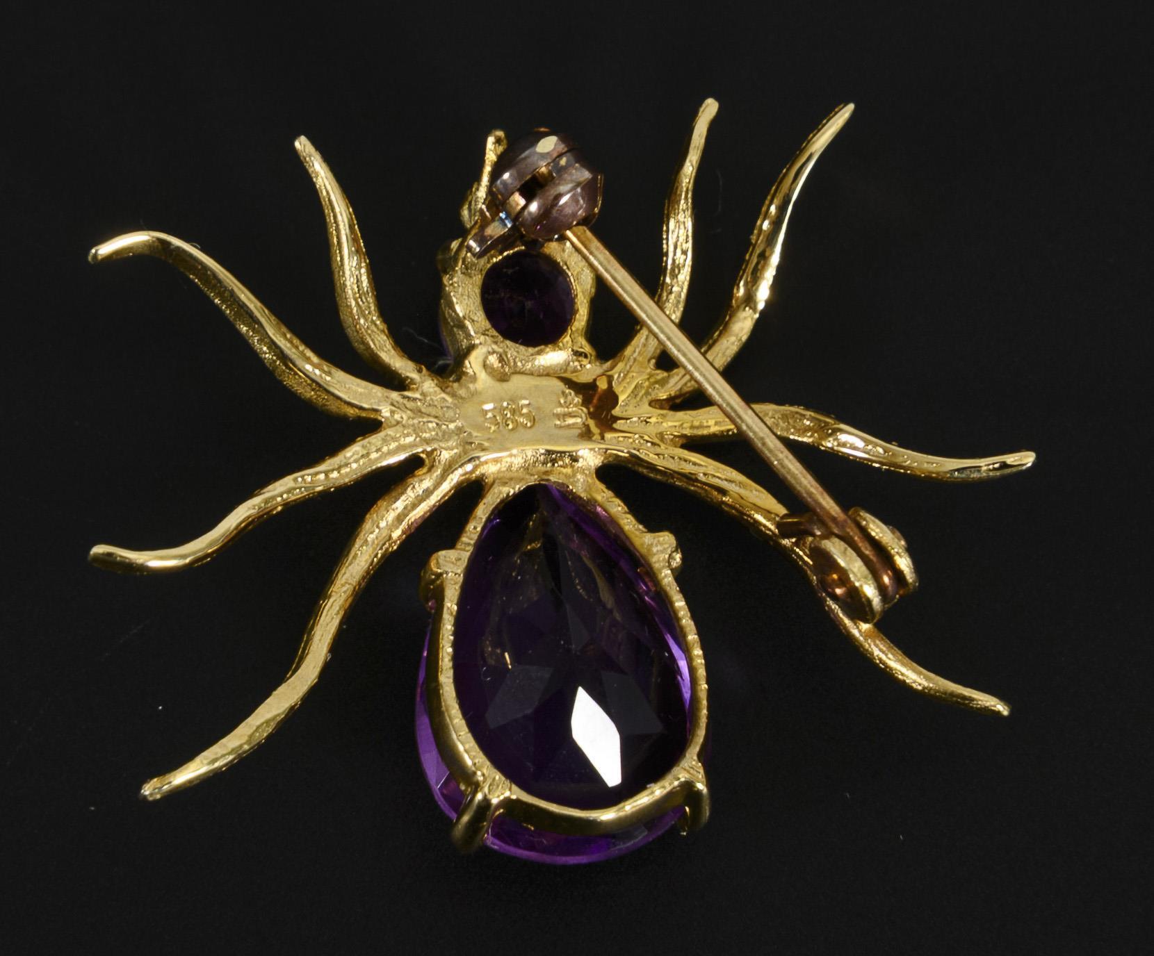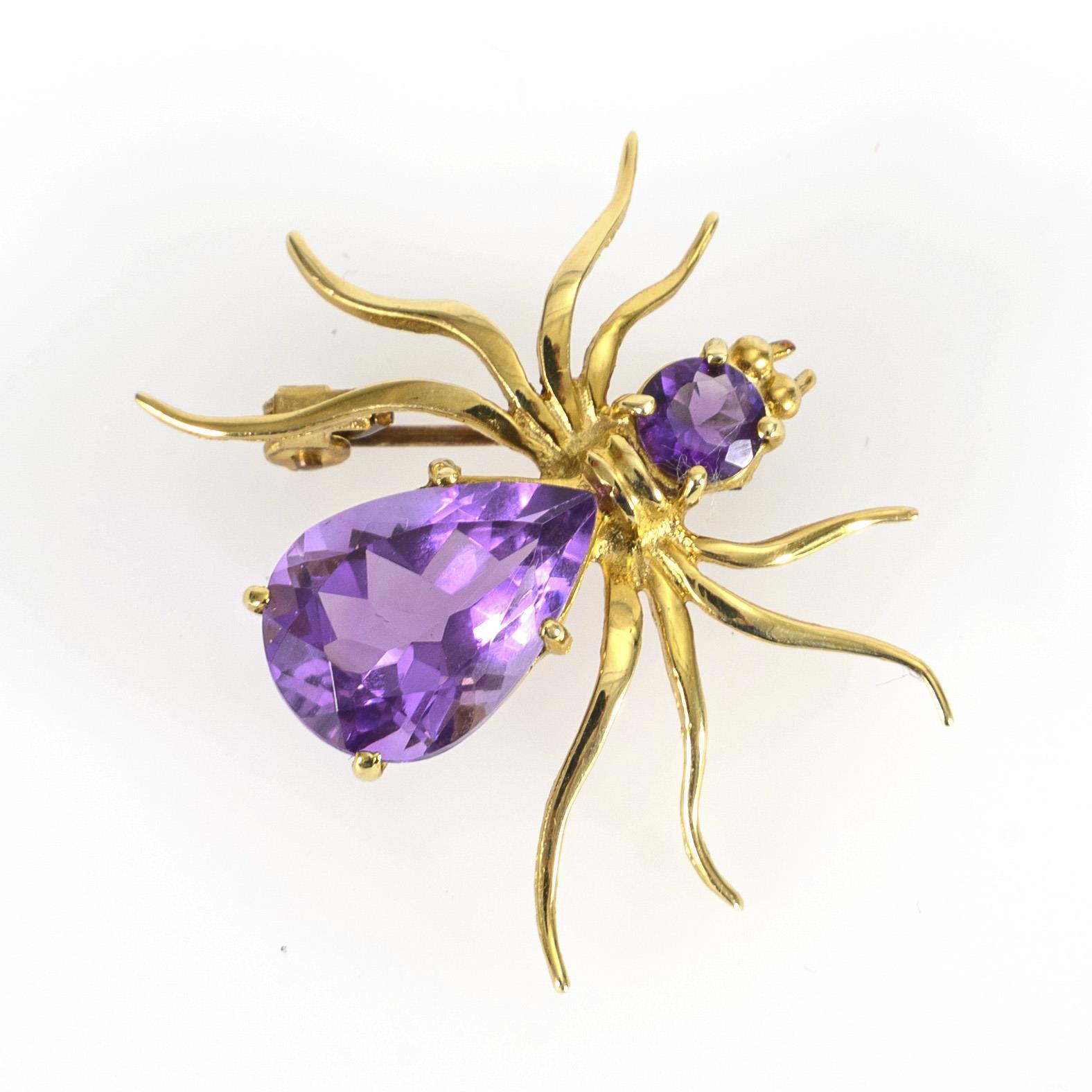 Brosche in Form einer Spinne, Kopf und Körper je ein rund-facettierter beziehungsweise tropfenförmiger Amethyst in Krappenfassung. Kugelhakenverschluss. Der Verschluss mit Oxydationsspuren, wohl reparaturbedingt.