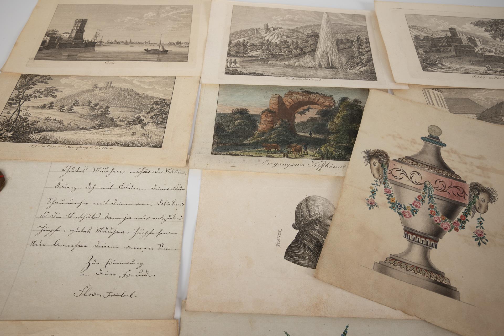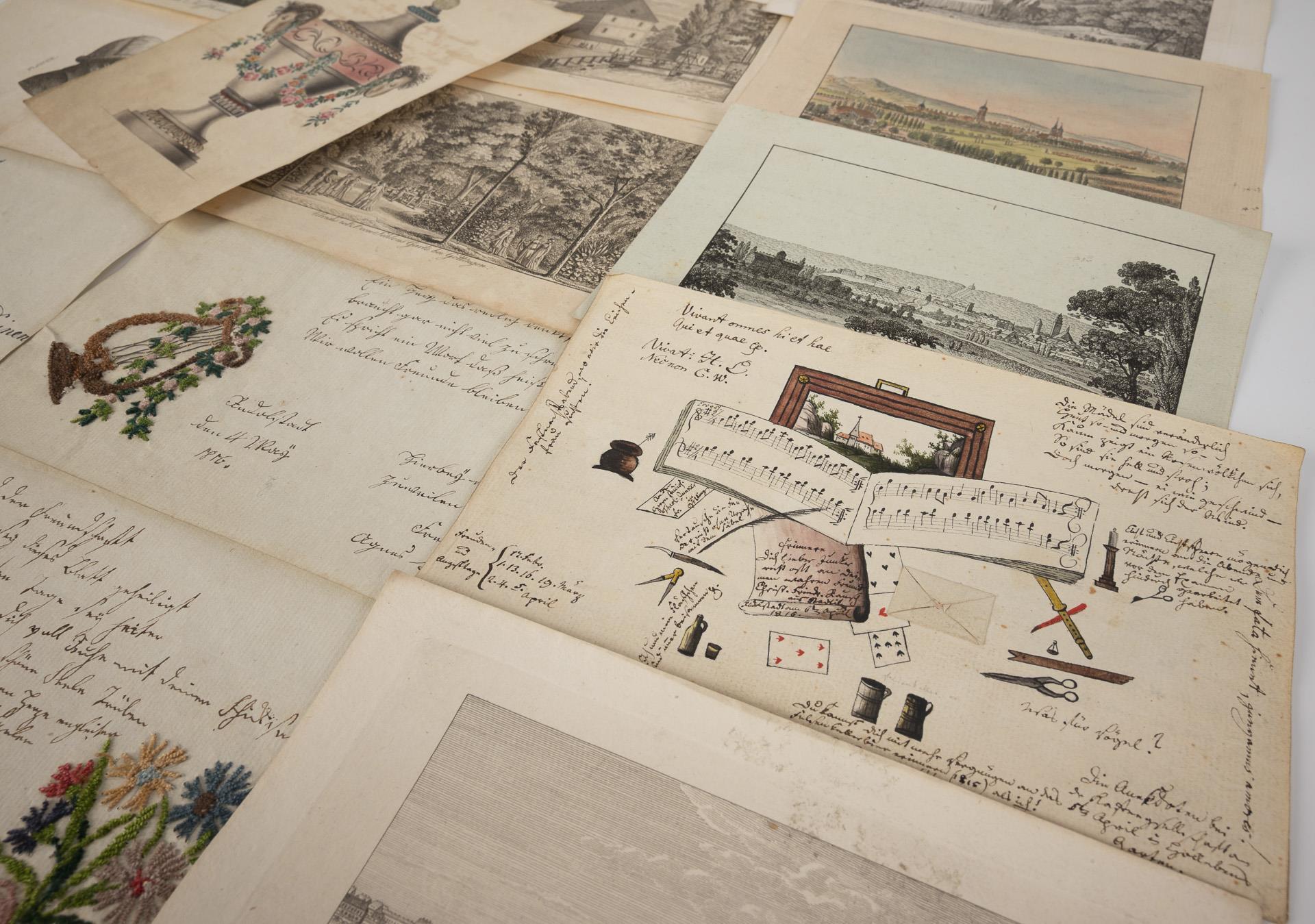 Sammlung loser Blätter eines Freundschaftsalbums zwischen 1813 und 1823, vielfach mit der Ortsbezeichnung Rudolstadt. Beiliegend einige Stiche, teils koloriert, teils rückseitig als Stammbuchblatt genutzt, dazu Blätter mit einigen wenigen Aquarellen, einer teilkolorierten Bleistiftzeichnung und Stickarbeiten. Zwei Blätter mit Aufklappmöglichkeiten.
