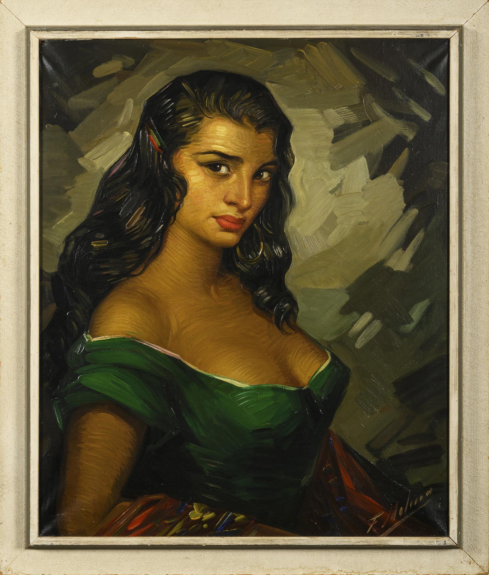 Porträt einer jungen, südländischen Frau im grünen Kleid.