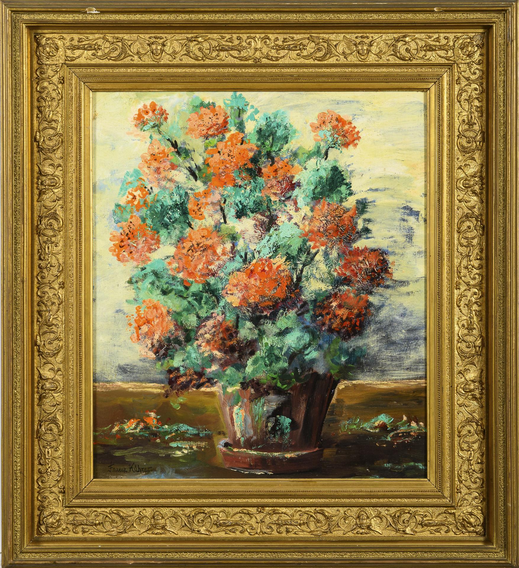 Die Blumen mit den roten Blüten in einem Topf vor heller Wand.