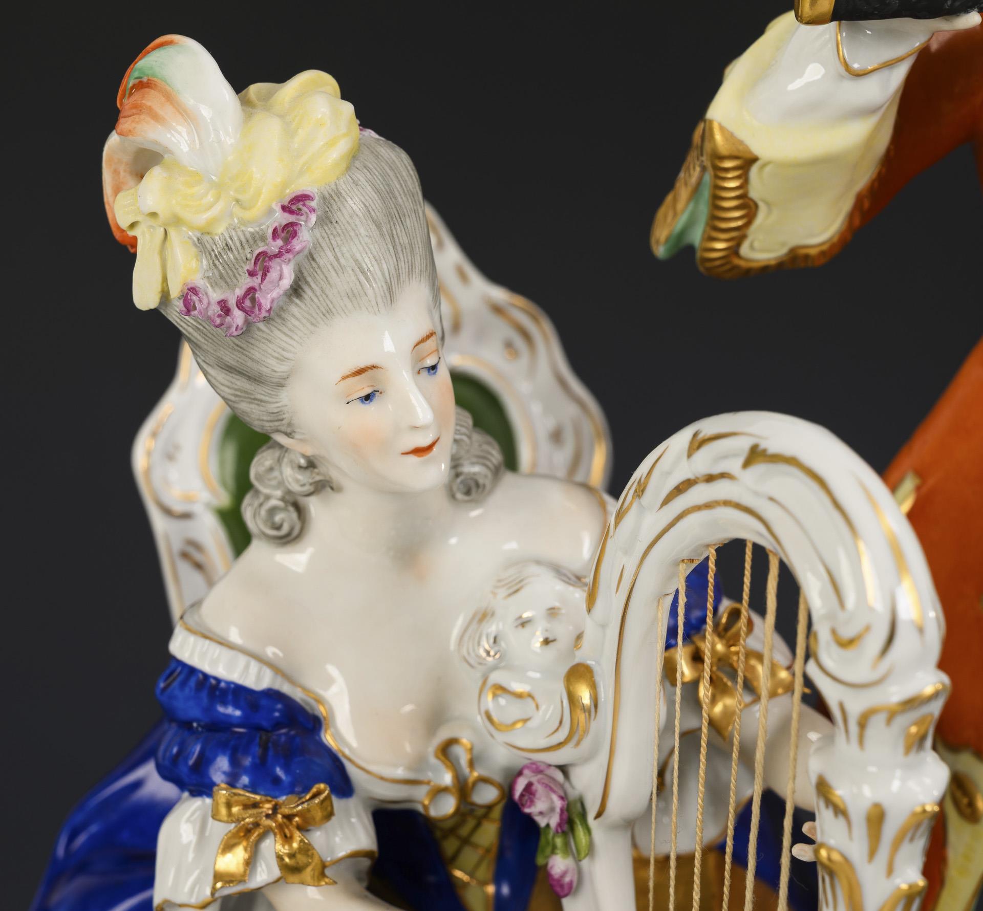 Musizierende Gruppe einer Dame am Spinett, eines flötespielenden Herren, einer harfespielenden Dame und eines tanzenden Mädchens.