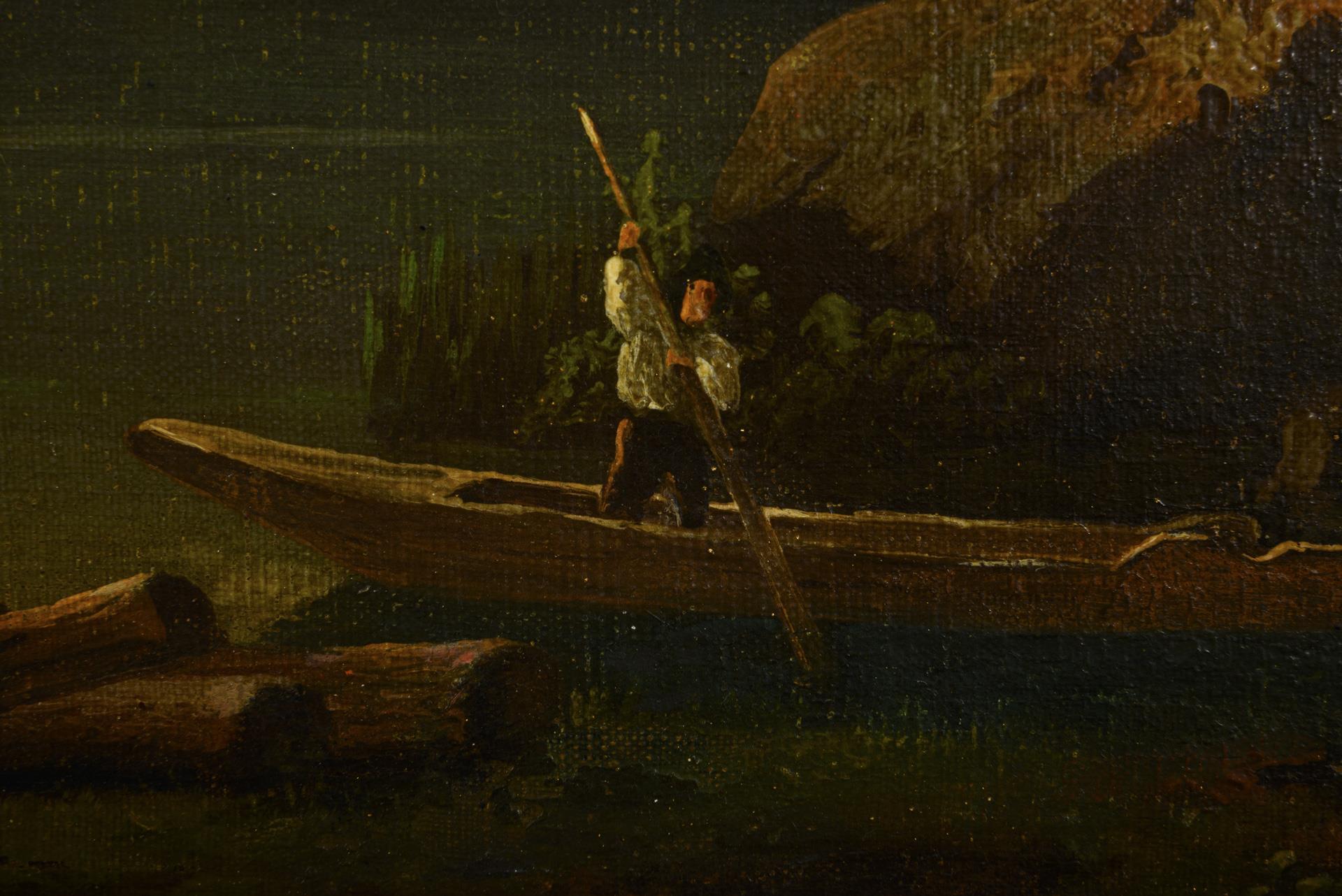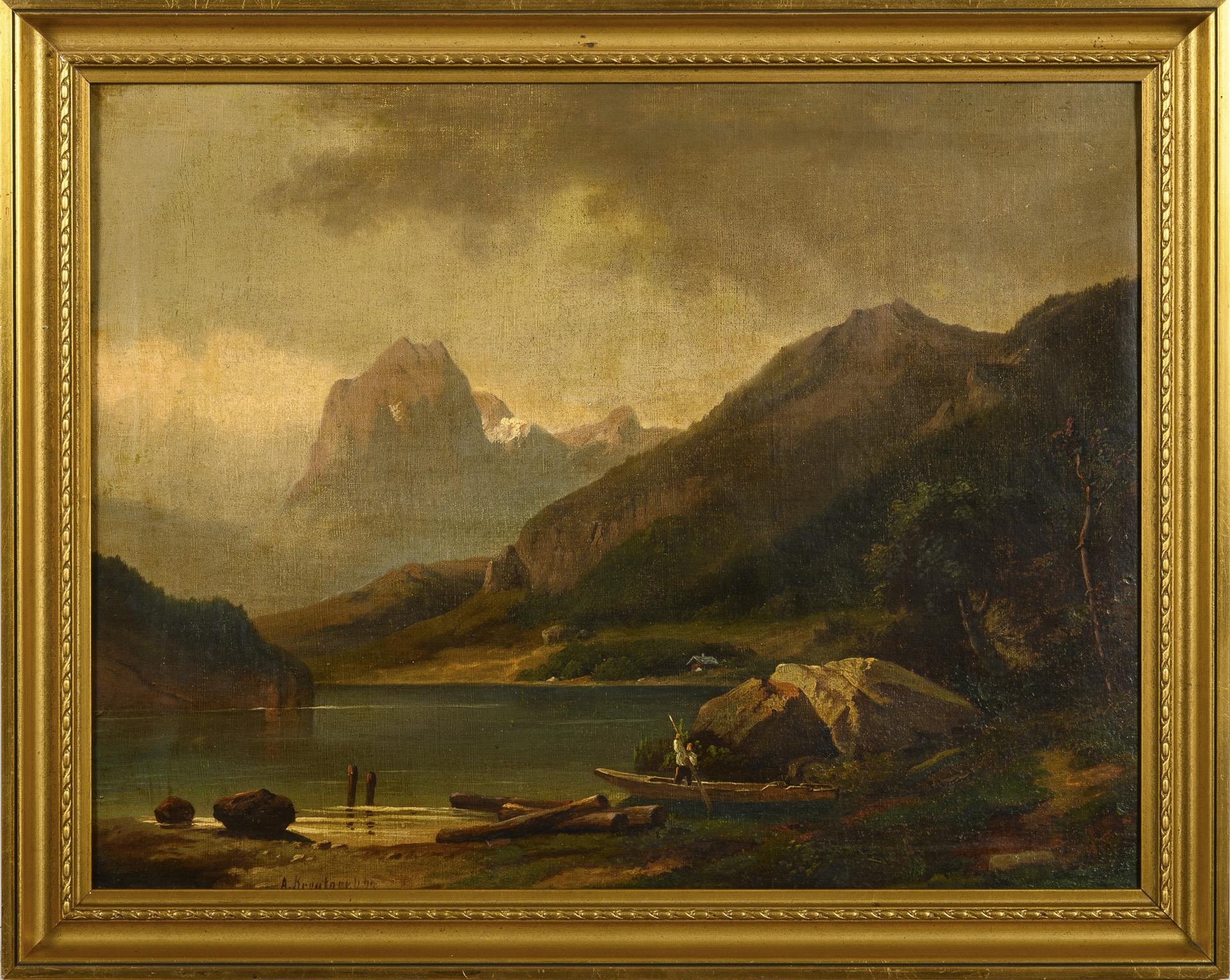 Romantische Gebirgslandschaft mit Kahnfahrer am Seeufer im warmen Sonnenschein. Leichte Altersspuren.
