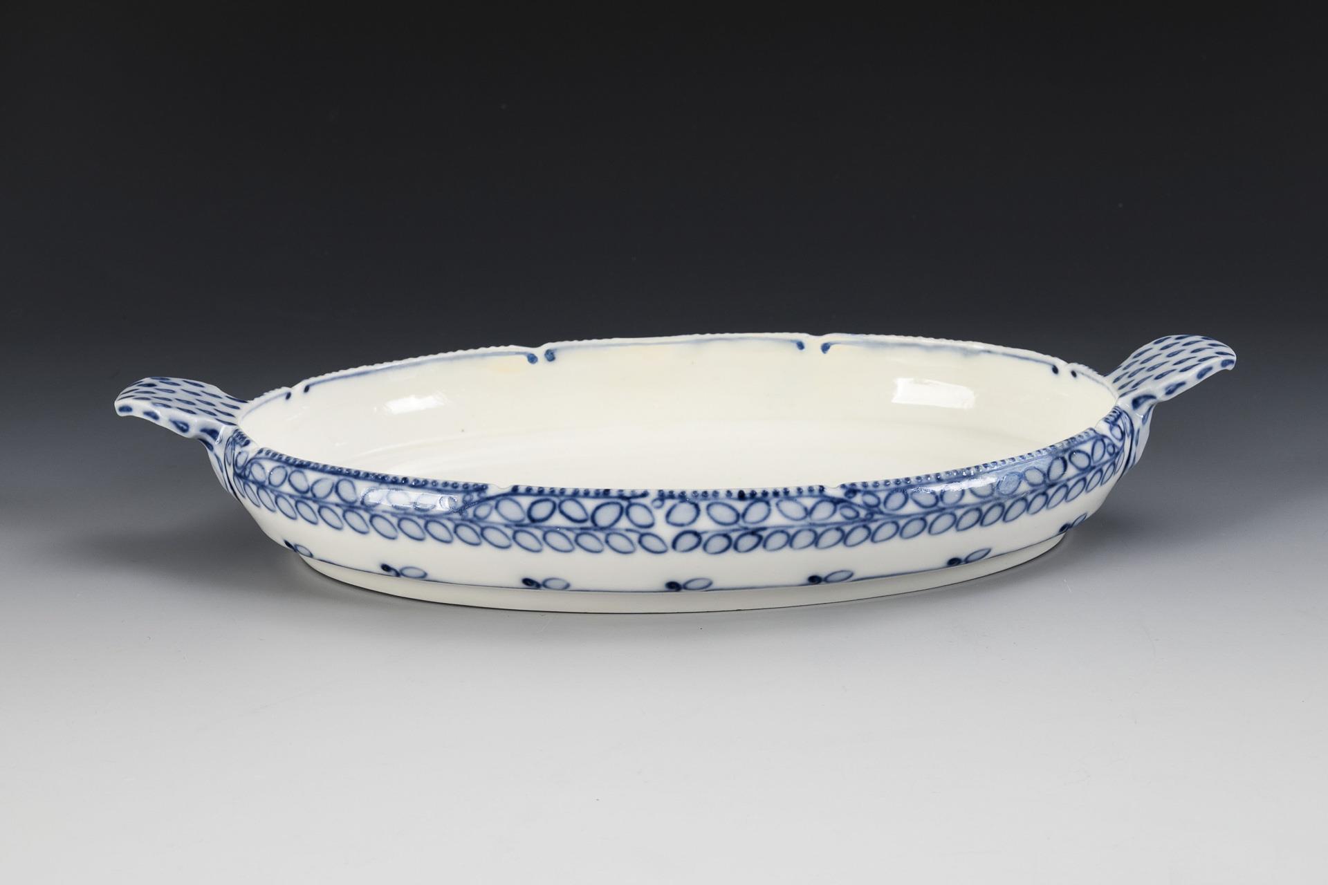 Ovale Schale mit zwei Handhaben und Perlband. 2 Randrestaurierungen.