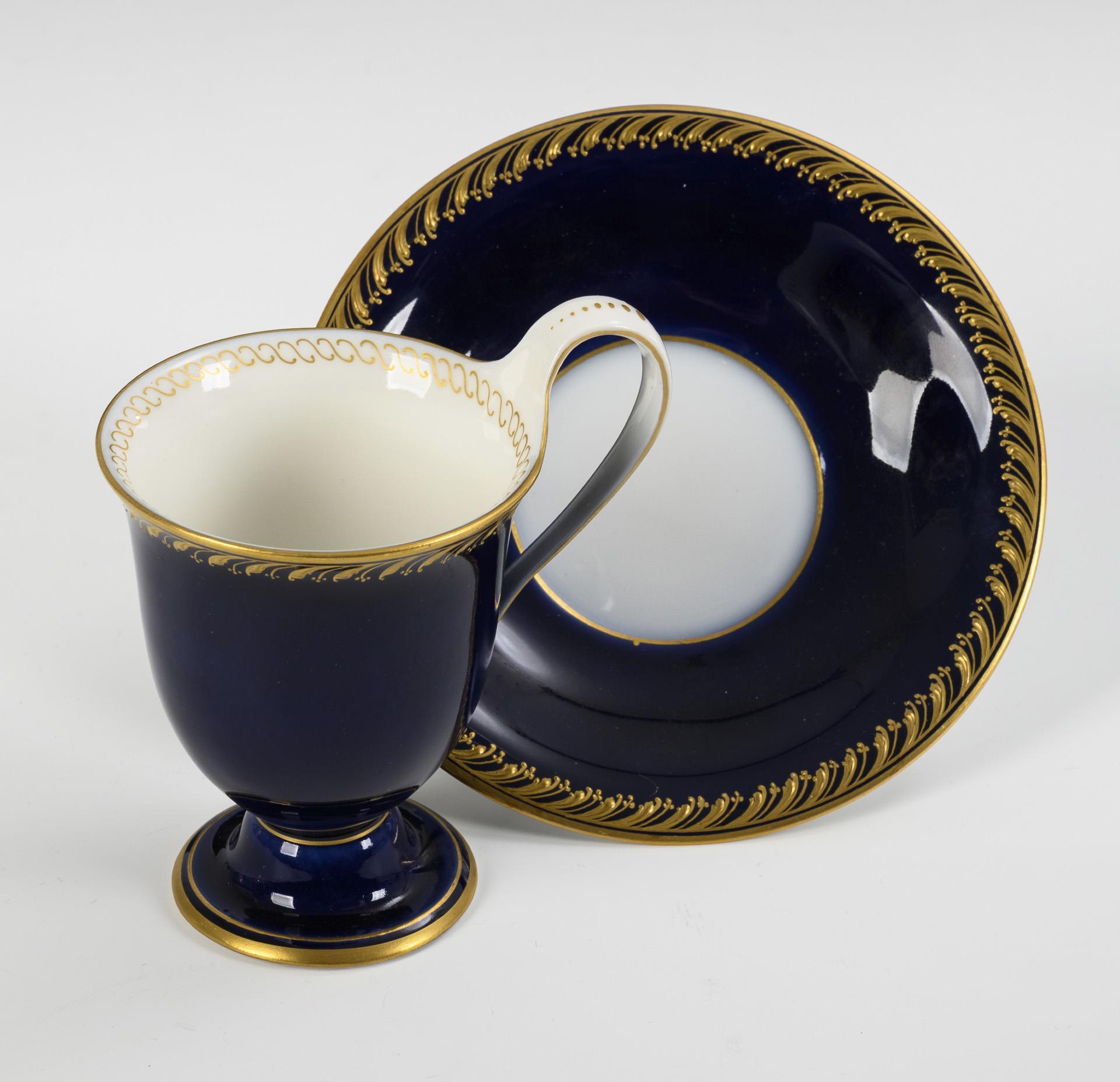 Kobaltblauer Fond, vegetabile Reliefgoldbordüre. Tasse (H 11 cm), originale Untertasse (Ø 14 cm).