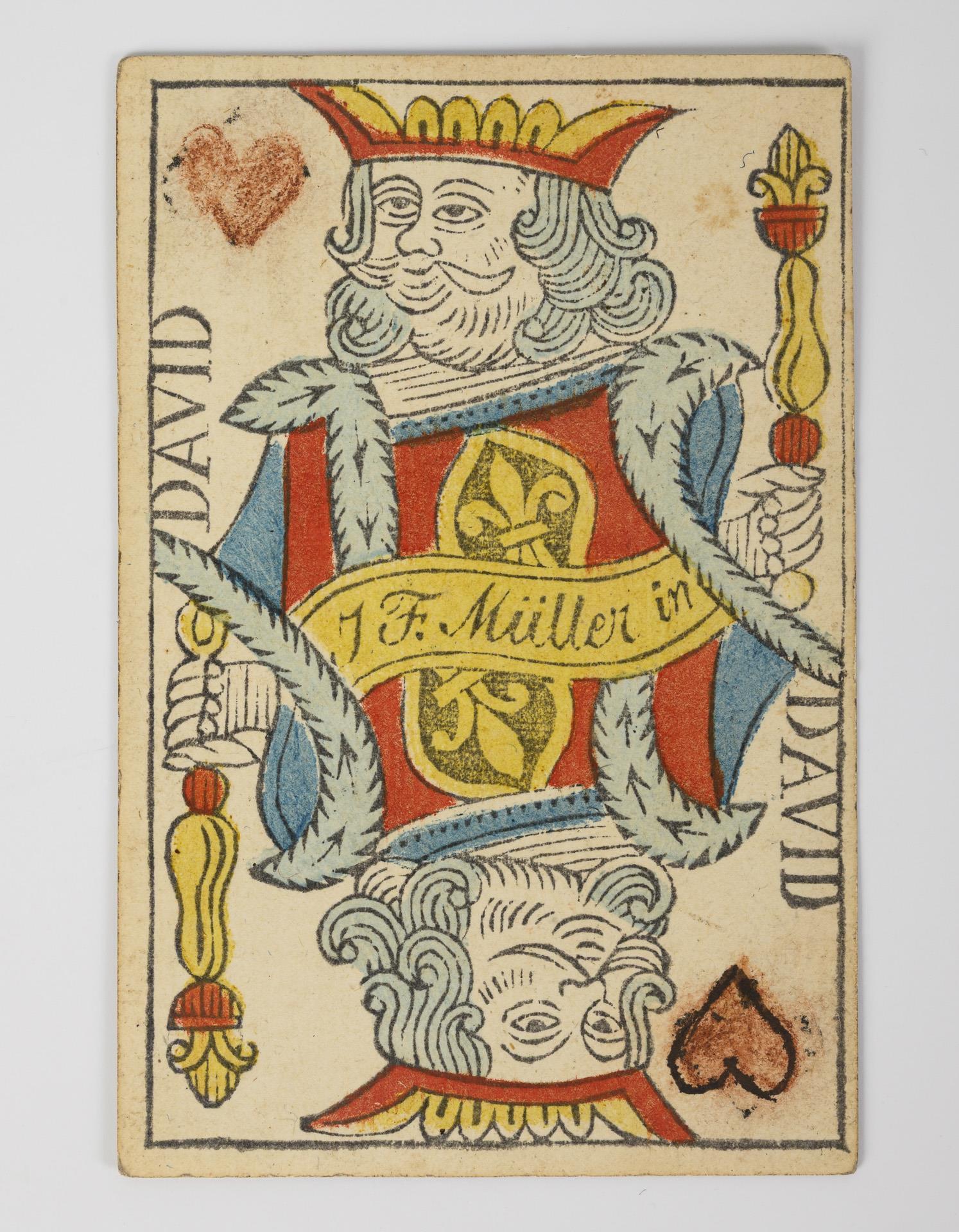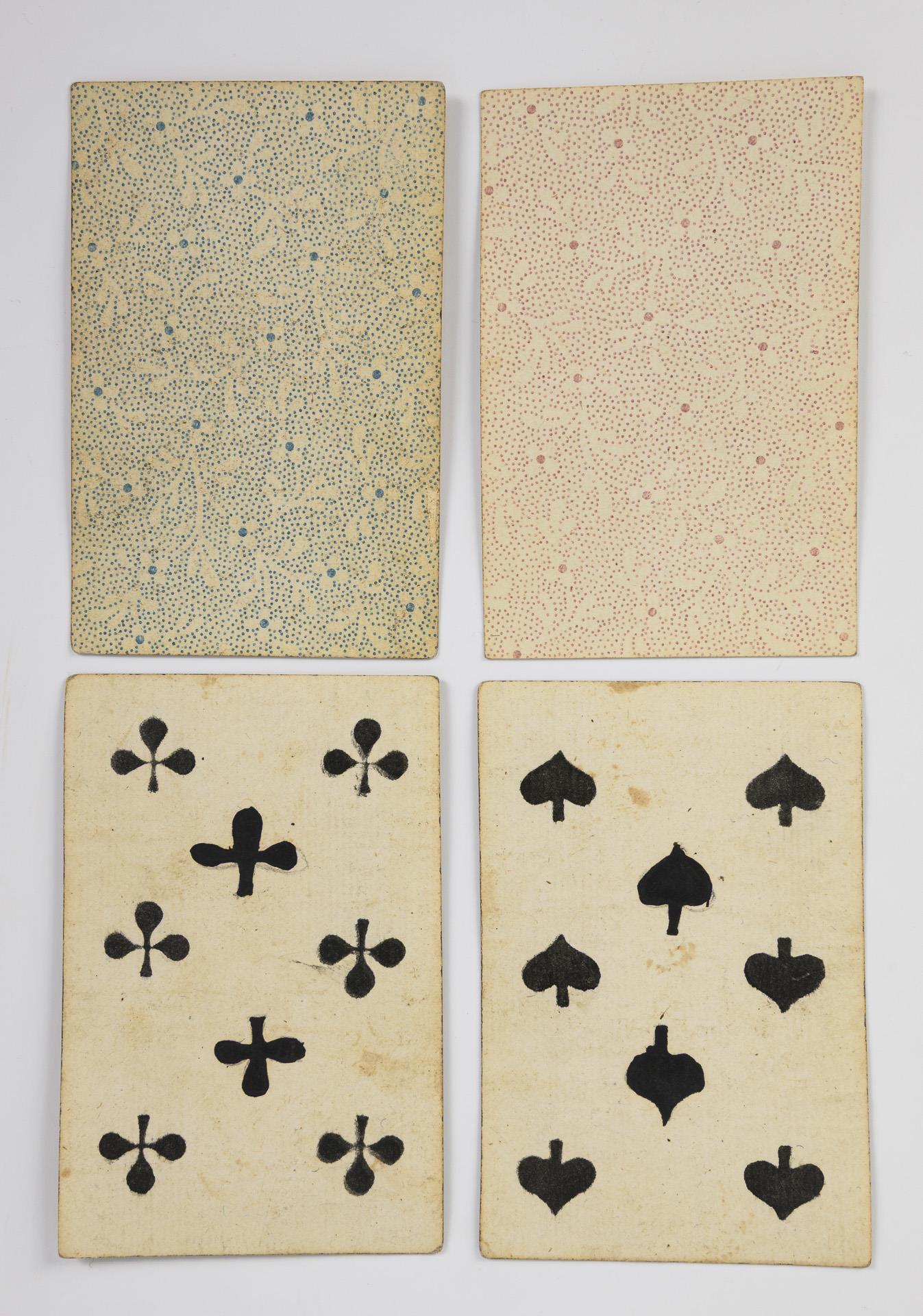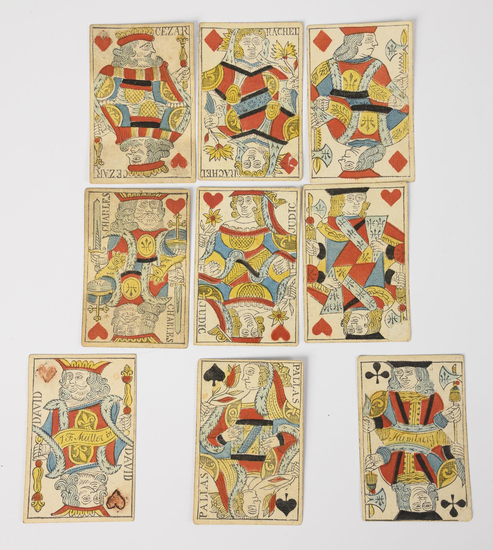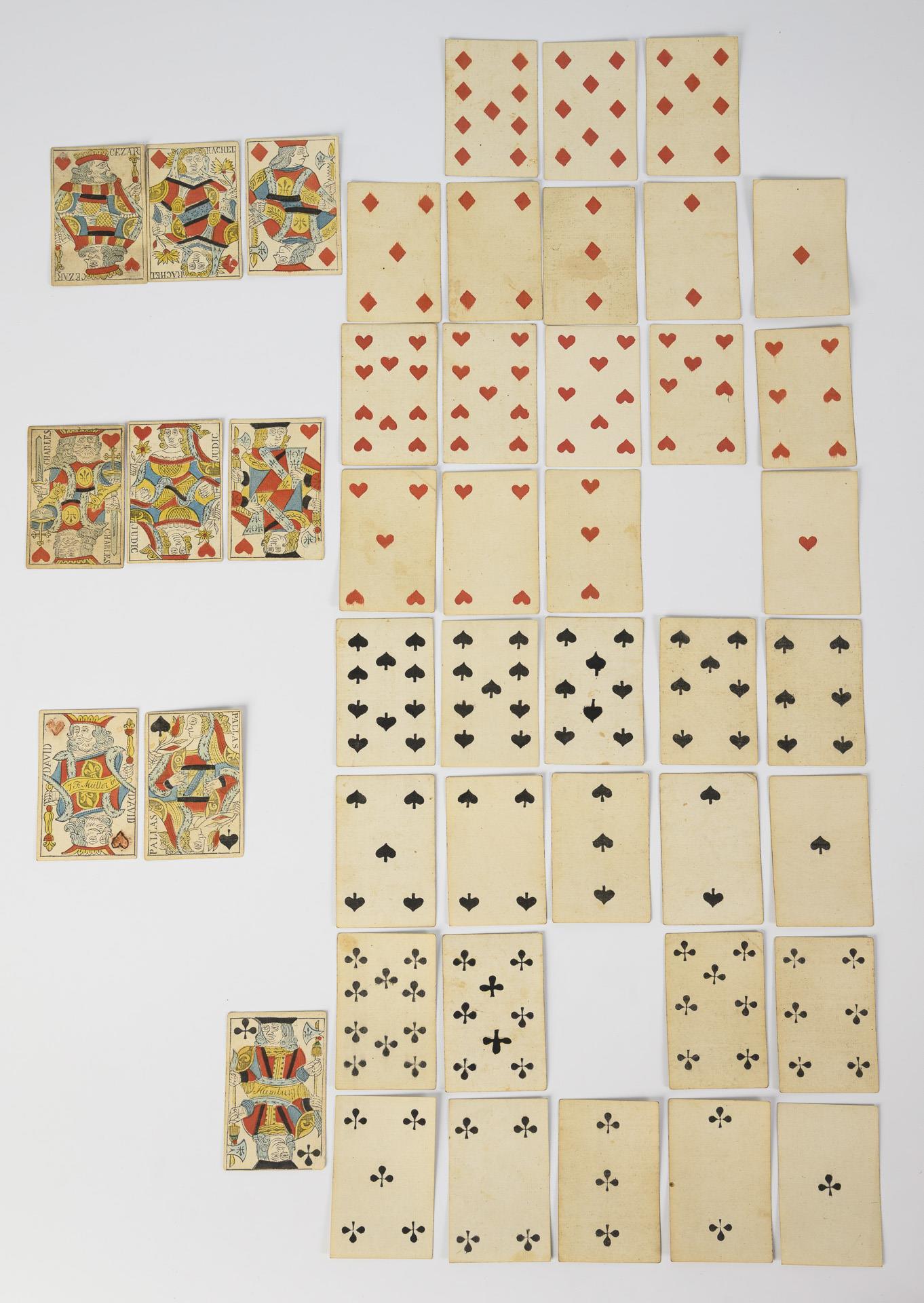 44 von 52 Karten (davon 9 Bildkarten) vorhanden. Hersteller: J. F. Müller (Hamburg, signiert), um 1820. Karten mit Gebrauchsspuren; eine Karte mit Nachzeichnung der Farbe, leichte Flecke, eine Karte mit Randbeschädigung.