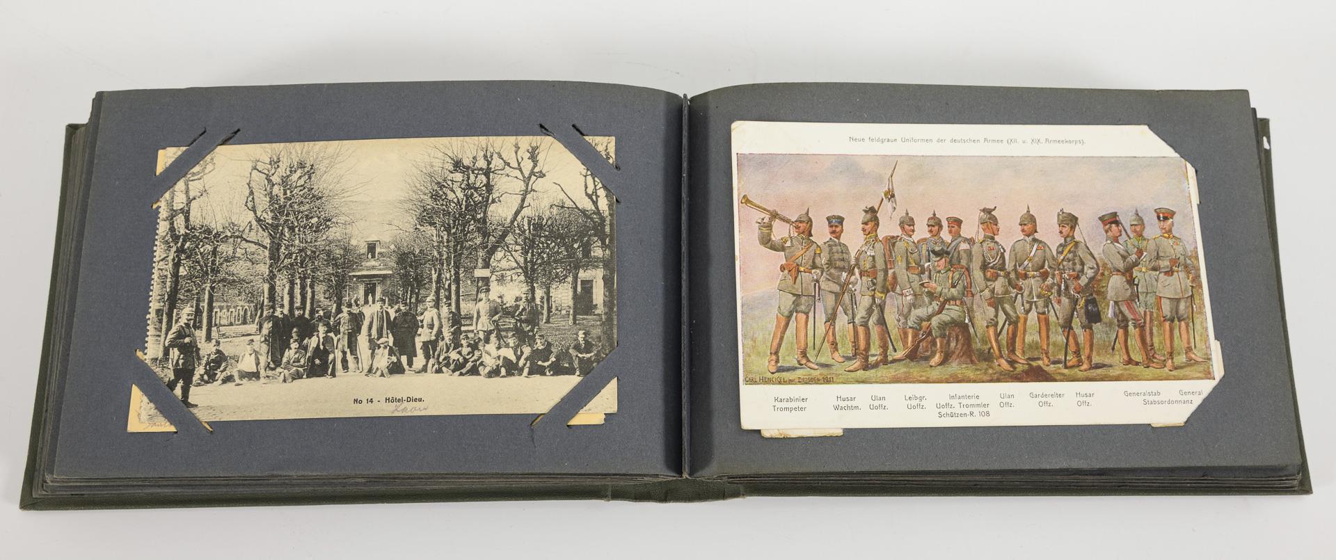 Viele Symbolkarten, aber auch Rückwärtige Dienste (Militärhunde, Bäckerei)), Zeppelin, Eisenbahnbrigade und Studiofotos. Kleines graues Album "Kriegserinnerungen" mit Eisernem Kreuz sowie grüner Ordner.
