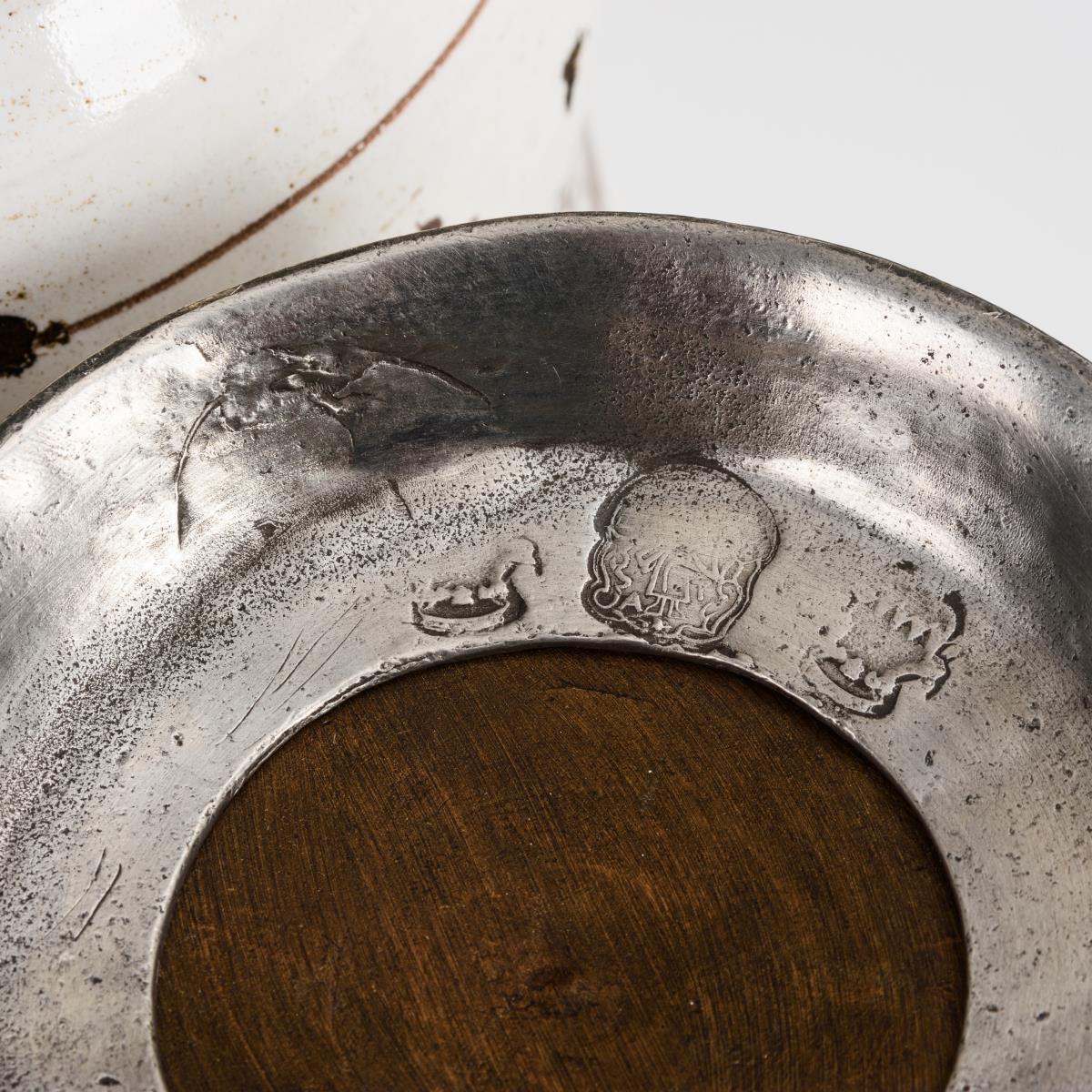 Zylindrische Albarelli mit leicht eingeschnürtem Bauch, schauseitig gemalte Rollwerkkartuschen mit Vögeln und Bezeichnung. Gewölbte Zinndeckel mit Kugelknauf, innen undeutlich gepunzt, Zinnstandring. Glasurdefekte, Gebrauchsspuren am Zinn.