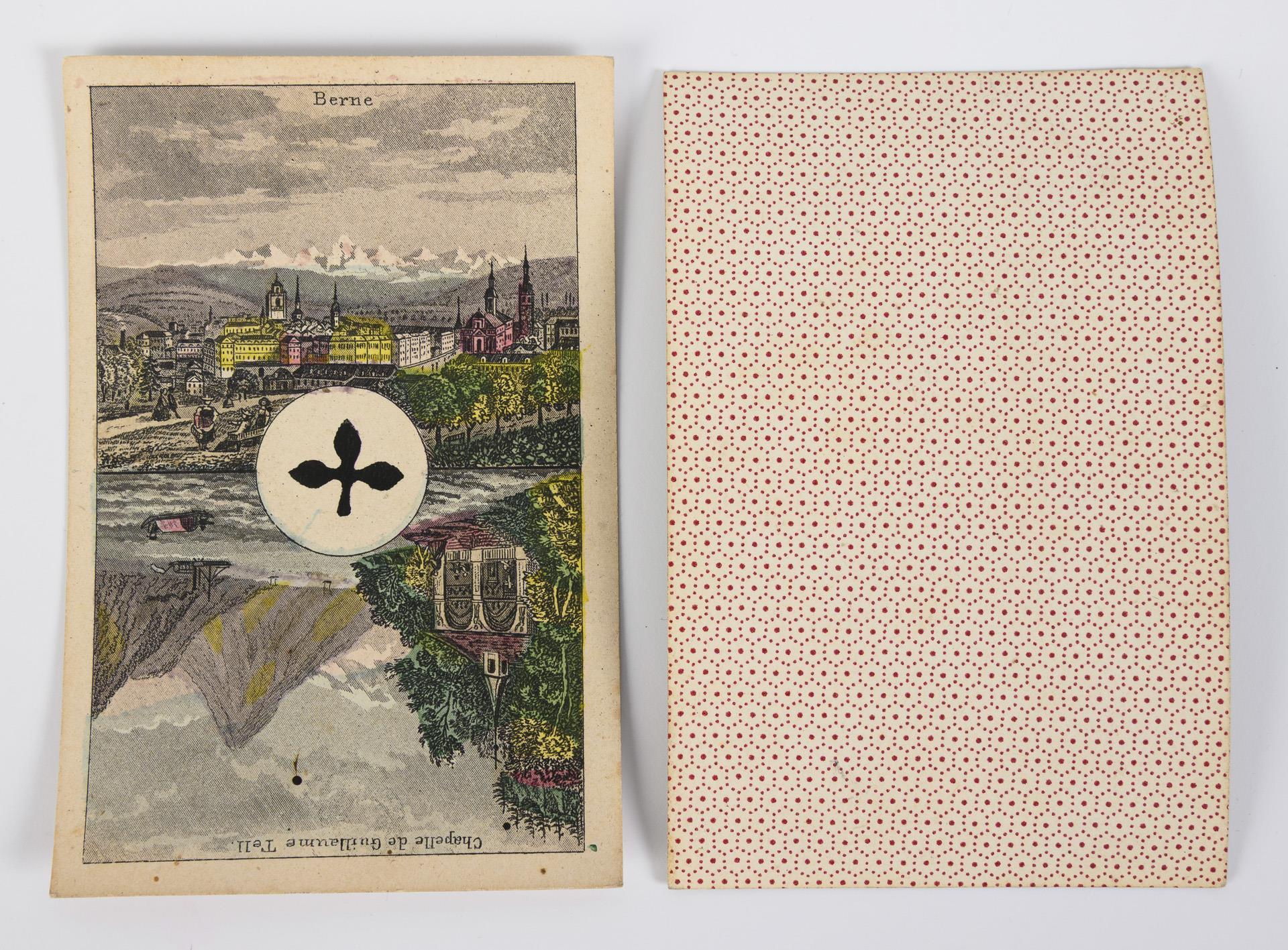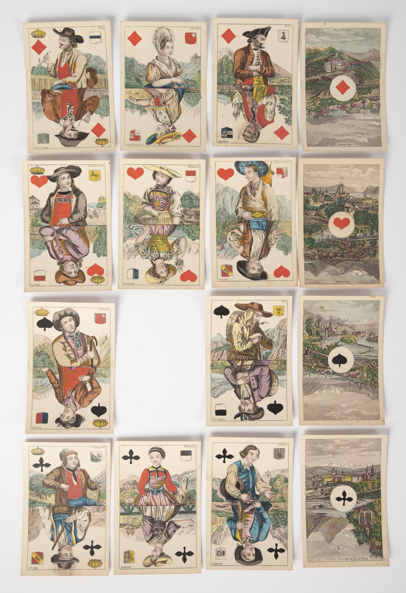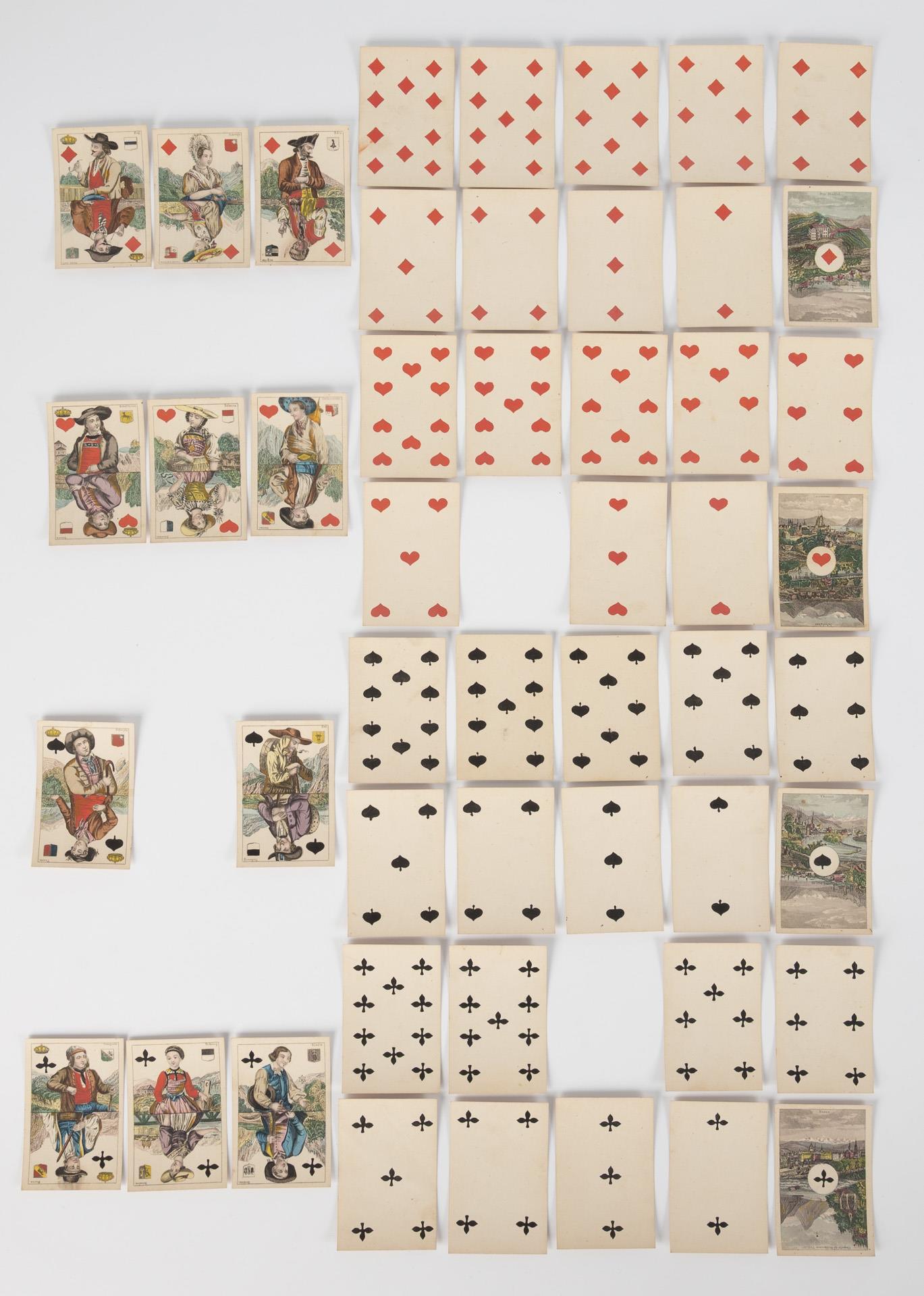 52 Blatt, Hersteller: C. L. Wüst (Frankfurt a. M.), um 1840. Französisches Blatt. Spielkarten mit Schweizer Trachtenmotiven. Die As-Karten jeweils mit 2 Schweizer Ortsansichten. 49/52 Spielkarten, es fehlen Pik Dame, Kreuz 8 und Herz 4.