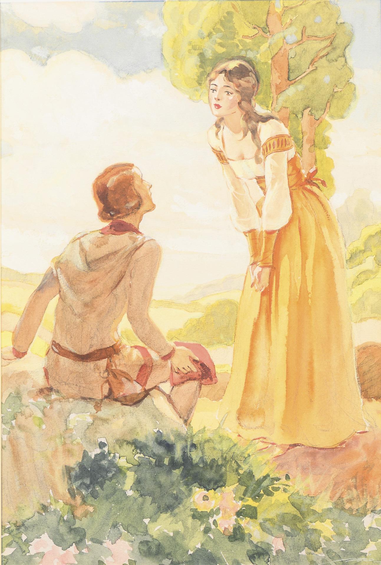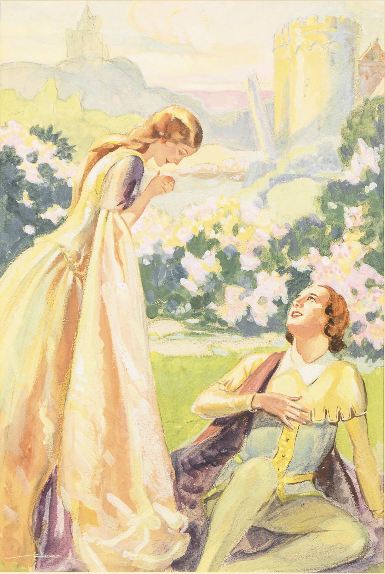 Zwei Darstellungen mit jungem Liebespaar in sonniger Landschaft, ein von einem geflügelten Fabelwesen gezogener Streitwagen mit junger Frau über einem Schloss sowie wohl eine Darstellung aus Hänsel und Gretel mit dem Vater und den Kindern im Wald.