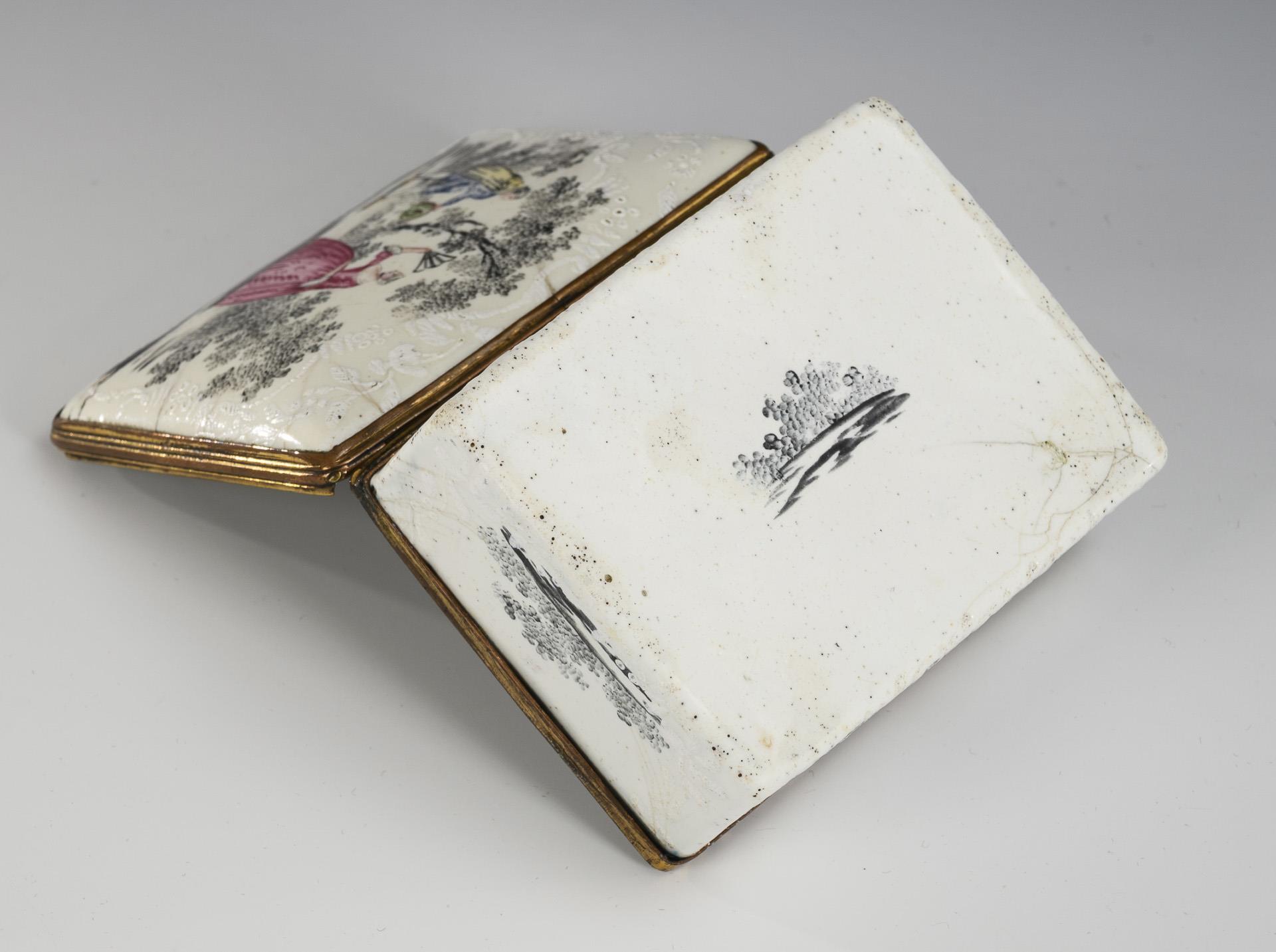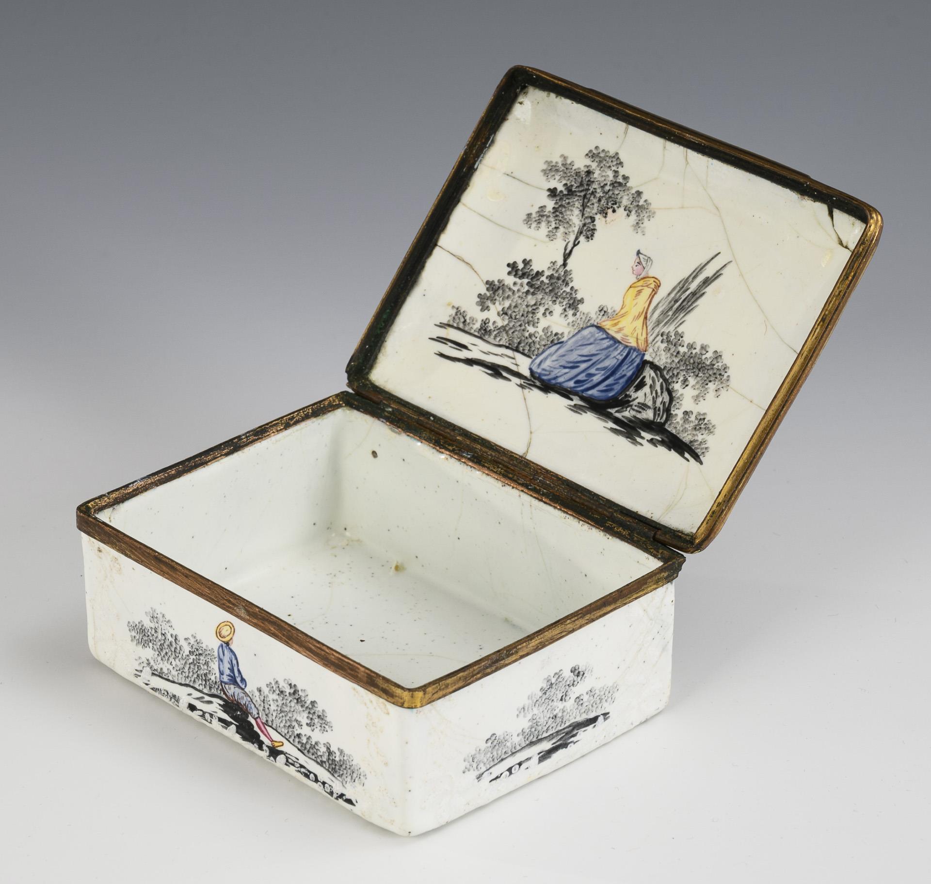 Quaderdose außen allseits und auf dem Boden sowie auf und im Deckel bemalt. Zumeist farbig gestaltete Personen in Grisaille-Landschaften; auf dem Deckel ein Paar. 1 kleiner Abplatzer, Haarrisse, Email de Saxe berieben.