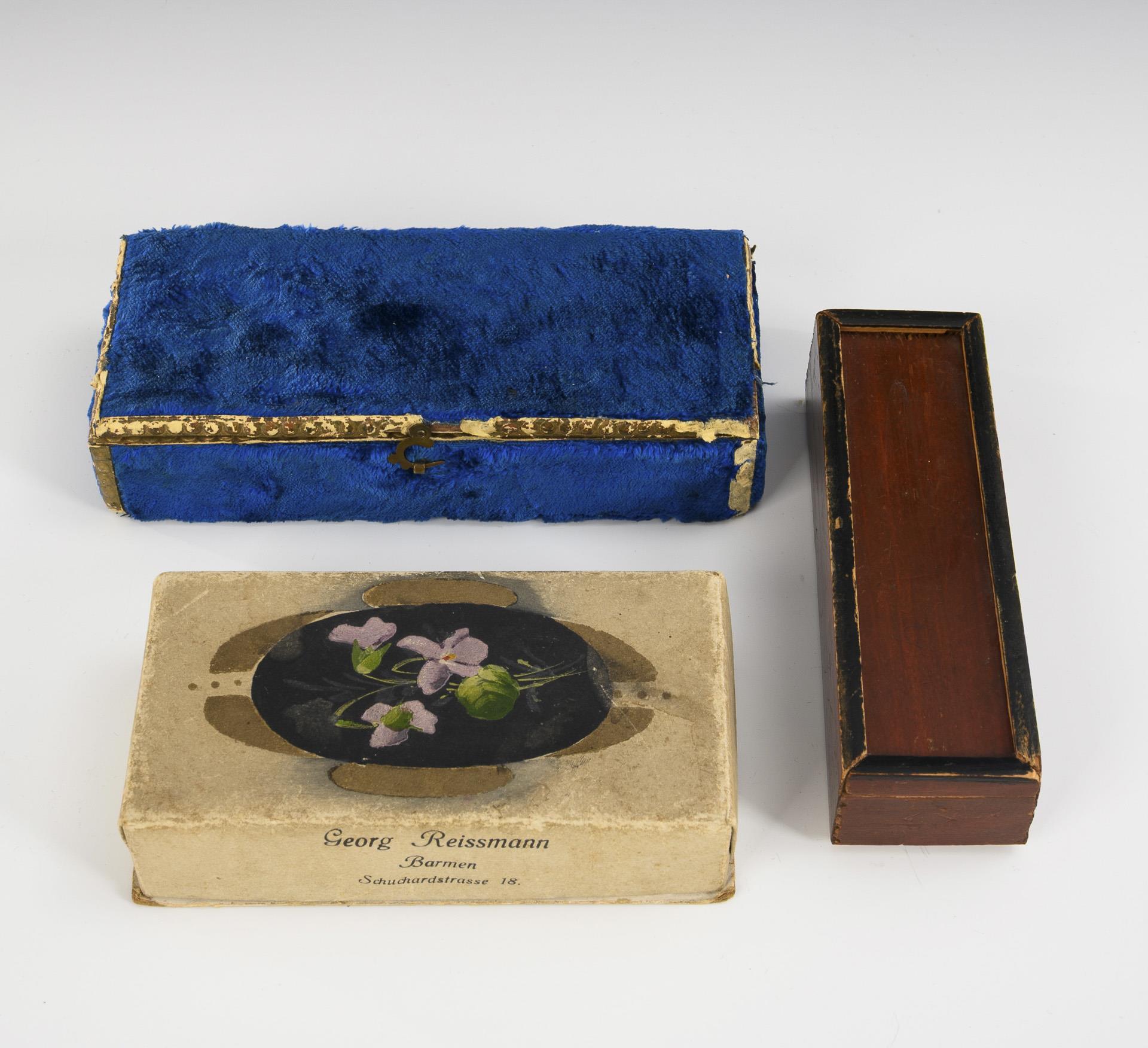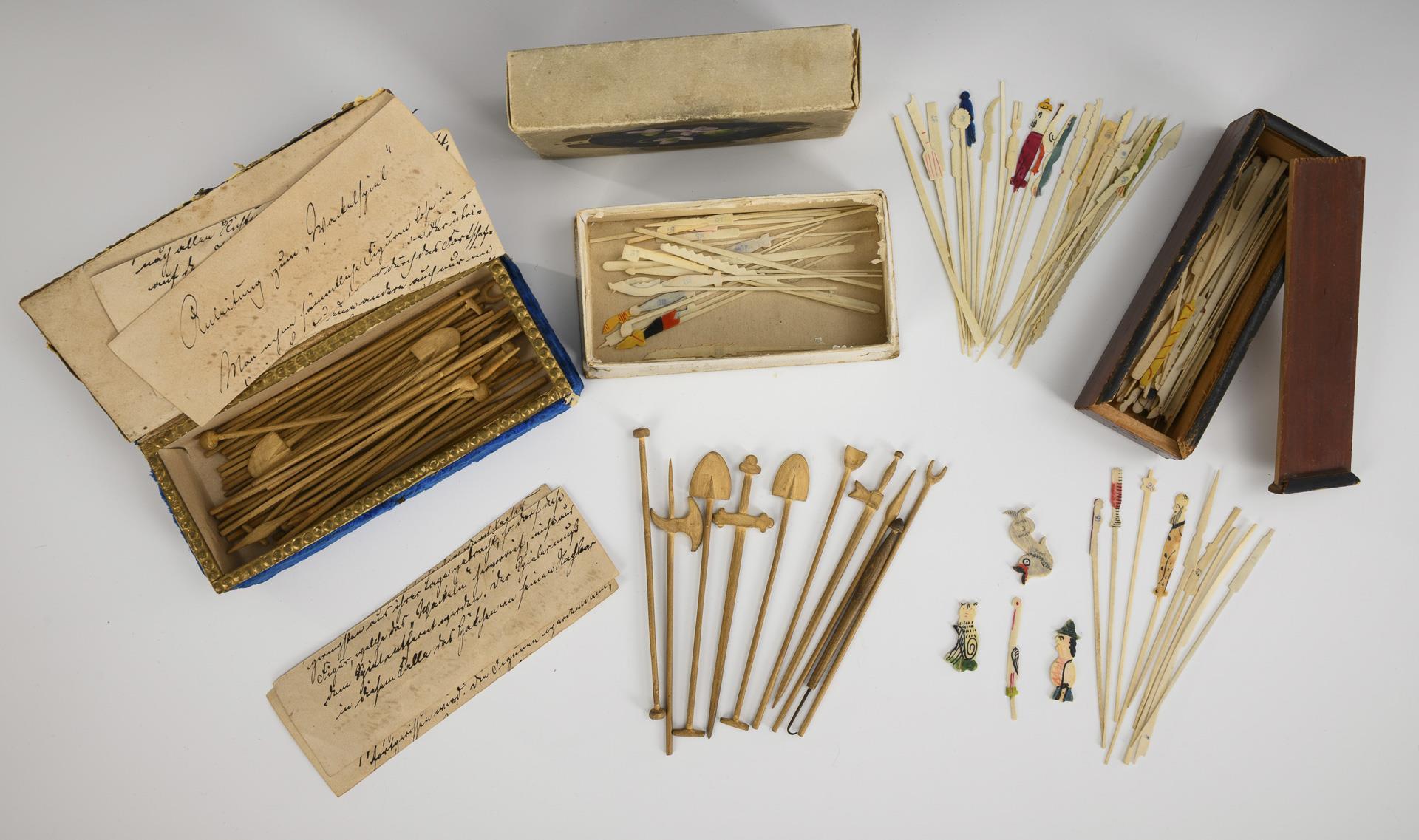 Drei Feder- oder Zitterspiele, 2 aus teilweise bemaltem Fischbein, ein Spiel aus Holz mit geschnitzten Figuren, dieses in einem Samtetui aus der Zeit um 1890. In diesem beiliegend eine zeitgenössische handschriftliche Anleitung für das "Wackelspiel". Den beiden anderen Spielen ist jeweils eine Kopie einer gedruckten zeitgenössischen Anleitung beigegeben.