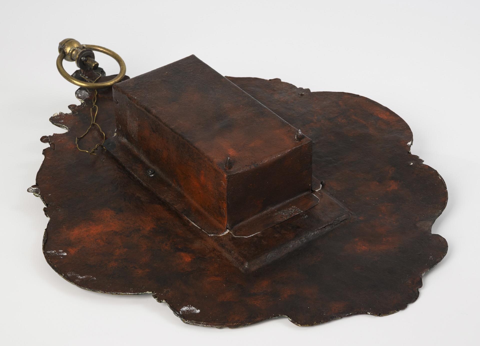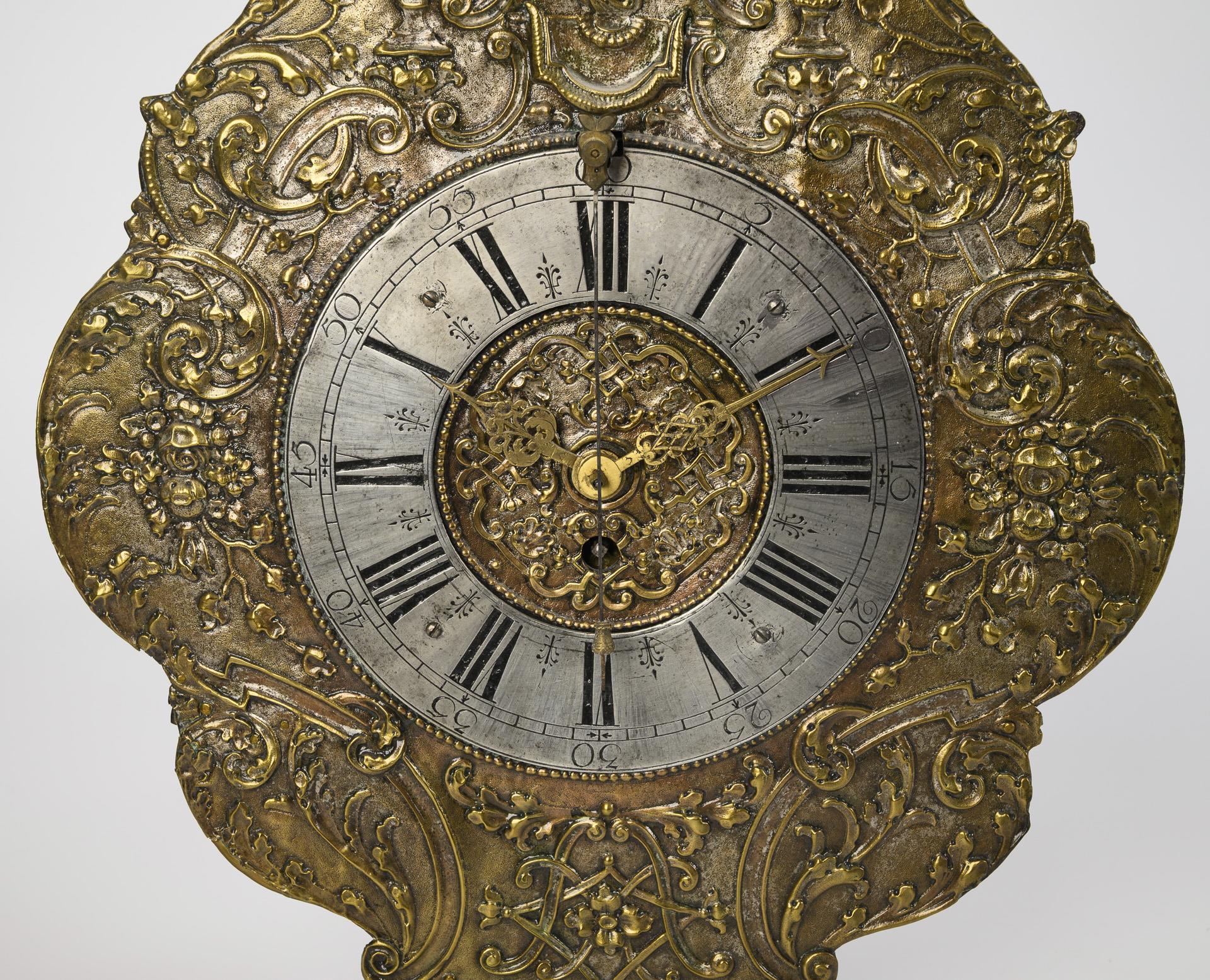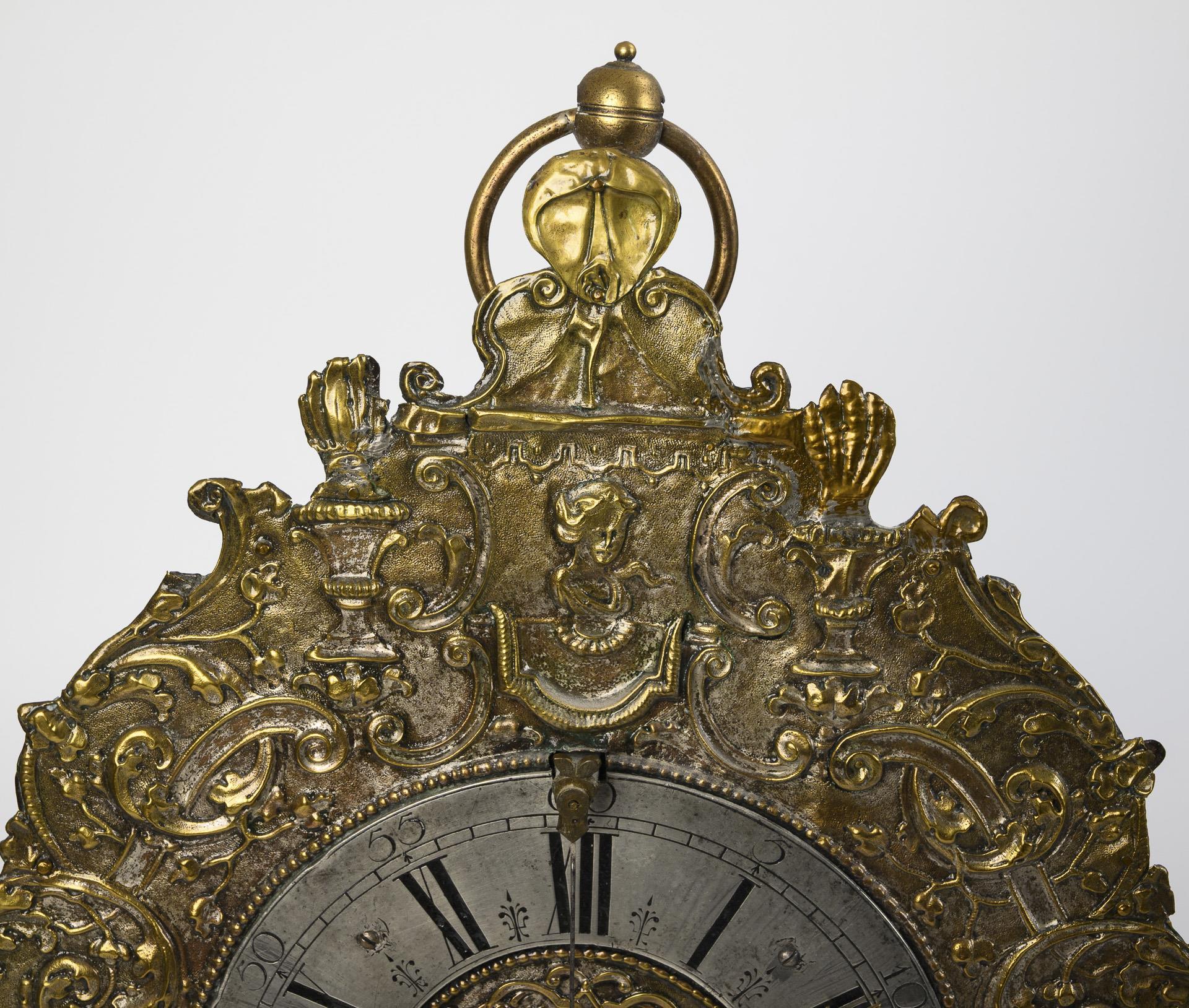 Barocke Wanduhr mit geschweift geschnittener und floral reliefierter Front, verziert mit Rocaillen, Blattwerk und einem kleinen weiblichen Porträtkopf. Altersspuren, Bereibungen, Lötspuren an älteren Rissen und Defekten an der Front.