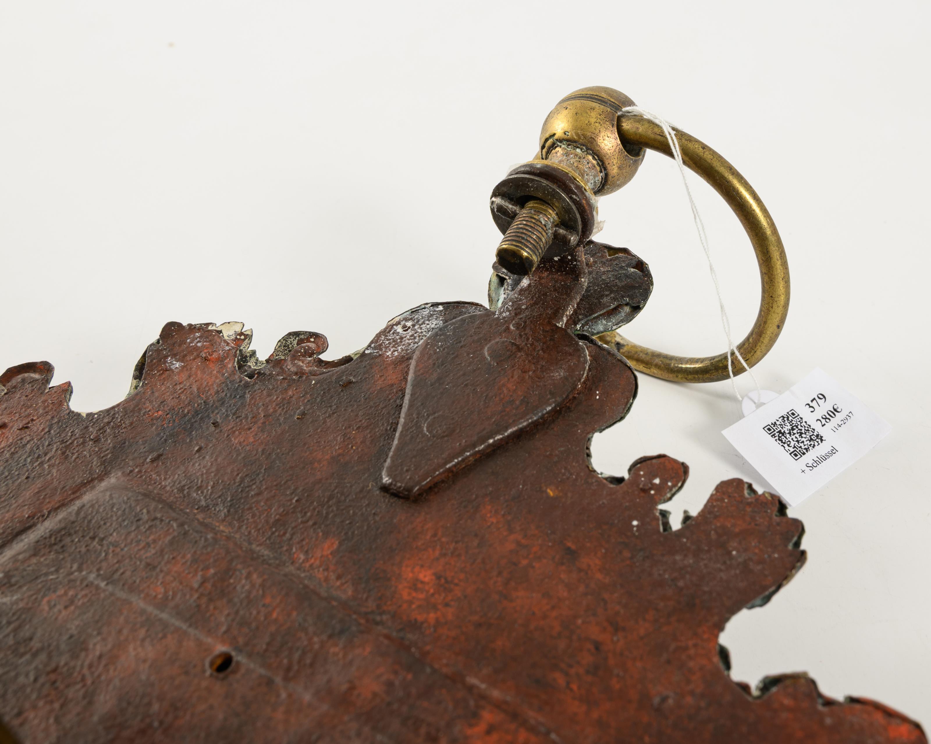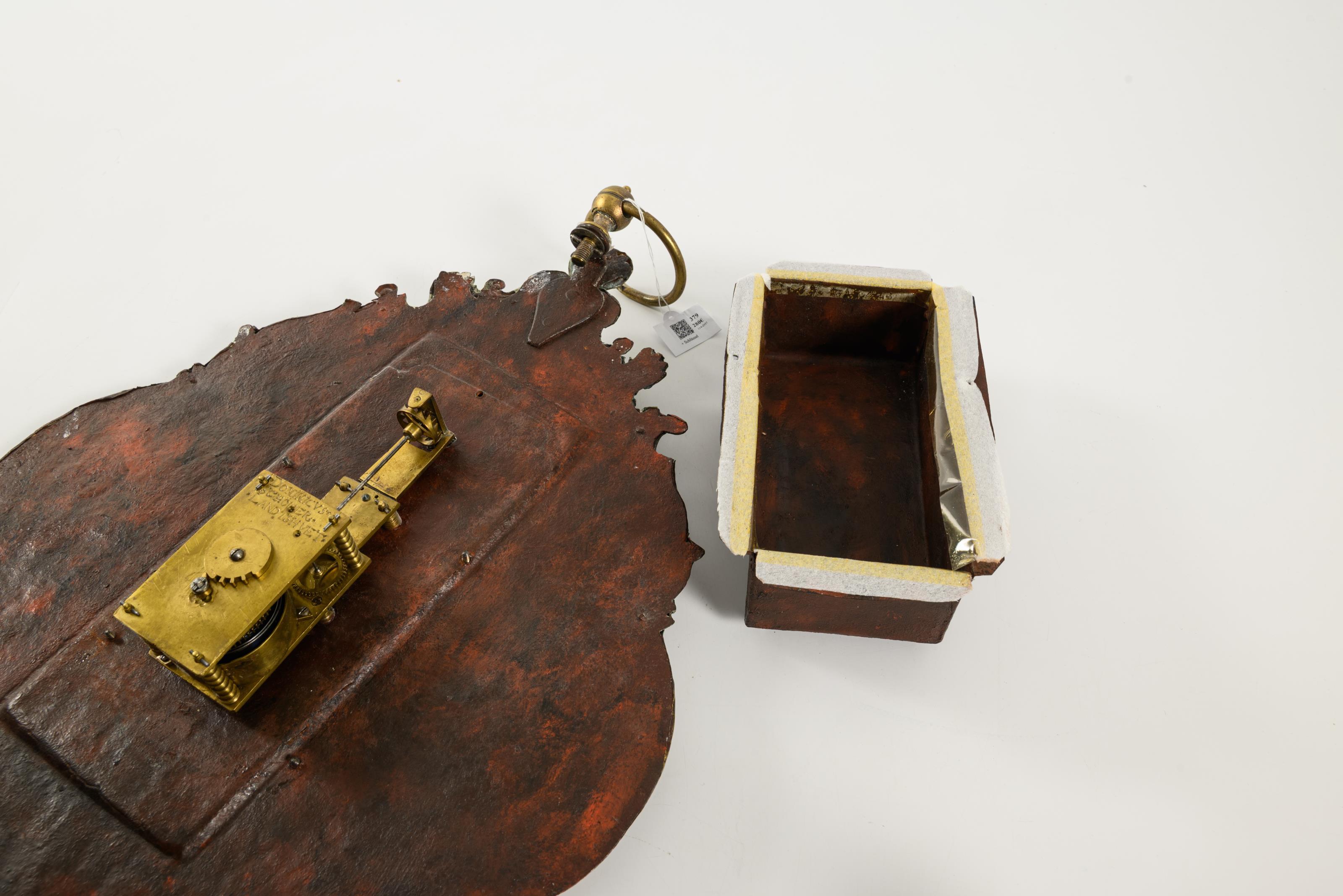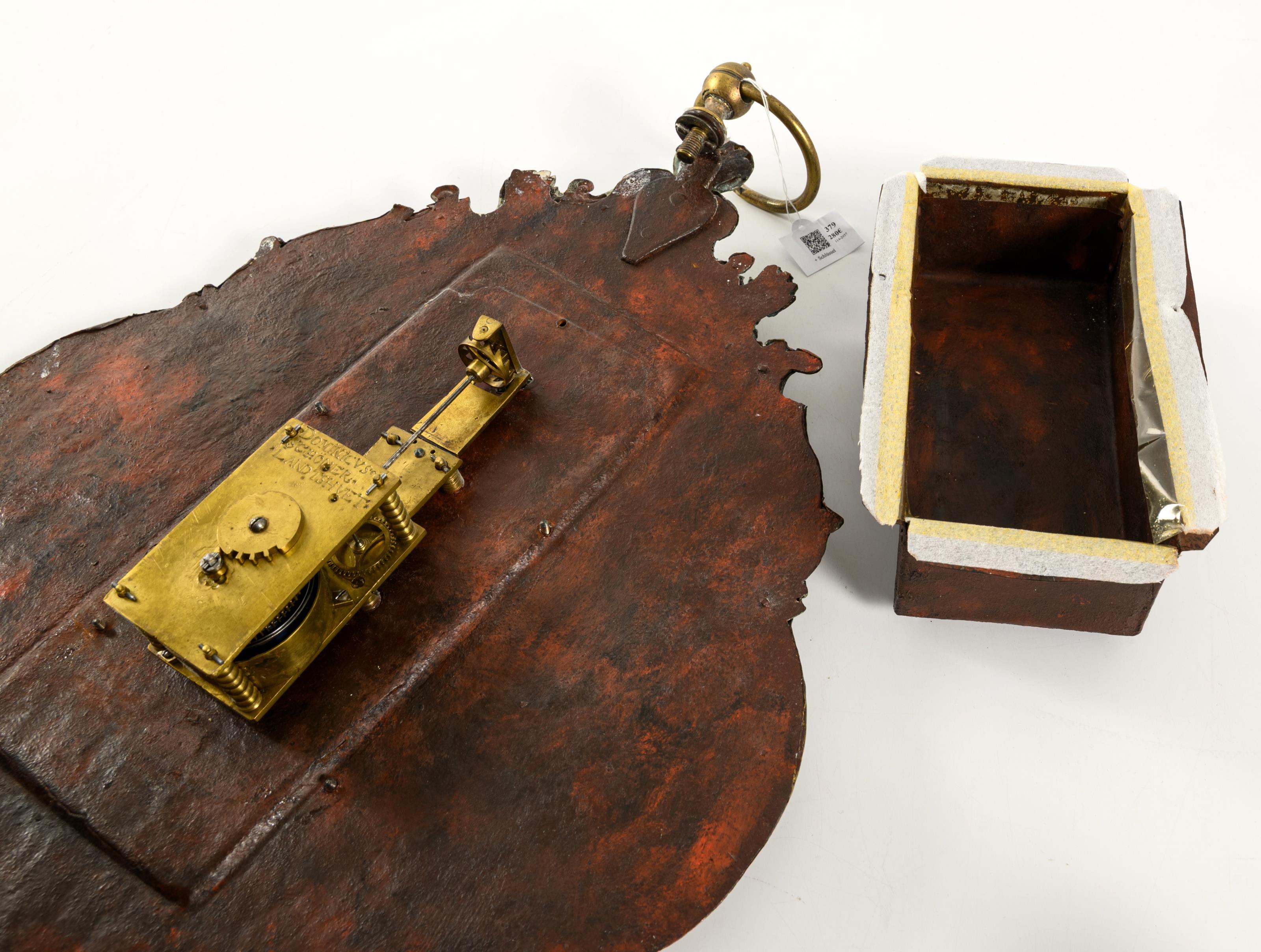 Barocke Wanduhr mit geschweift geschnittener und floral reliefierter Front, verziert mit Rocaillen, Blattwerk und einem kleinen weiblichen Porträtkopf. Altersspuren, Bereibungen, Lötspuren an älteren Rissen und Defekten an der Front.