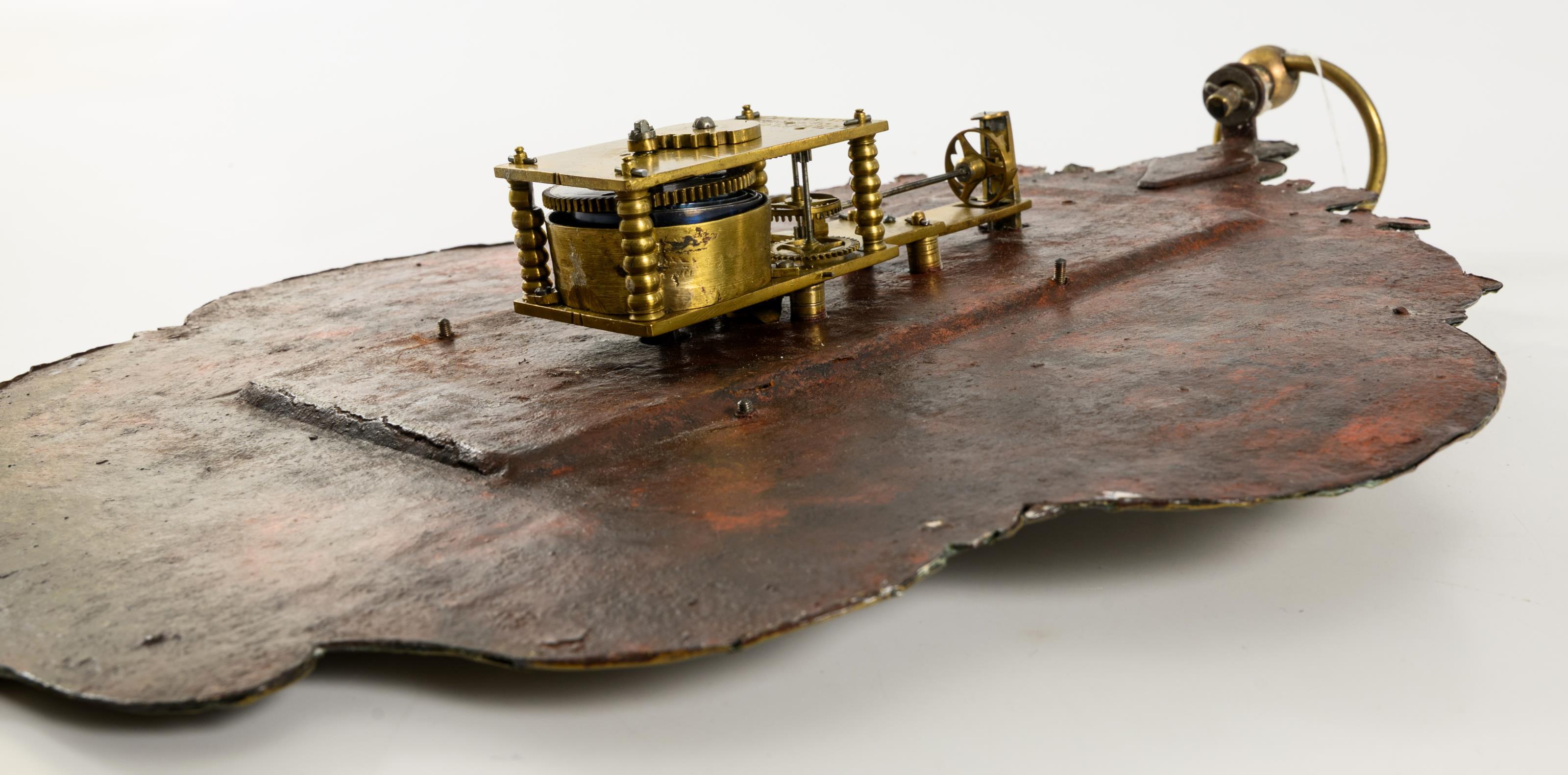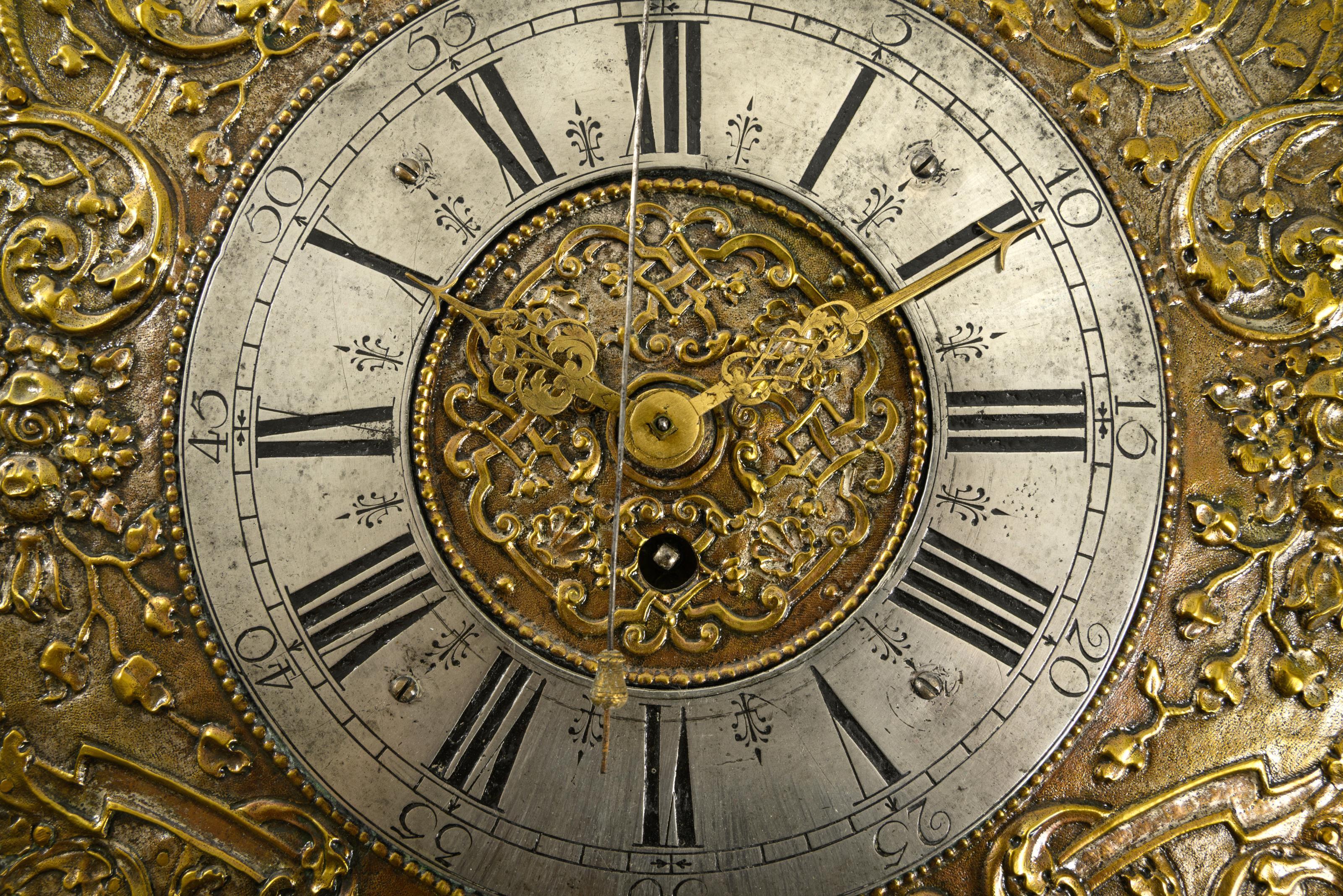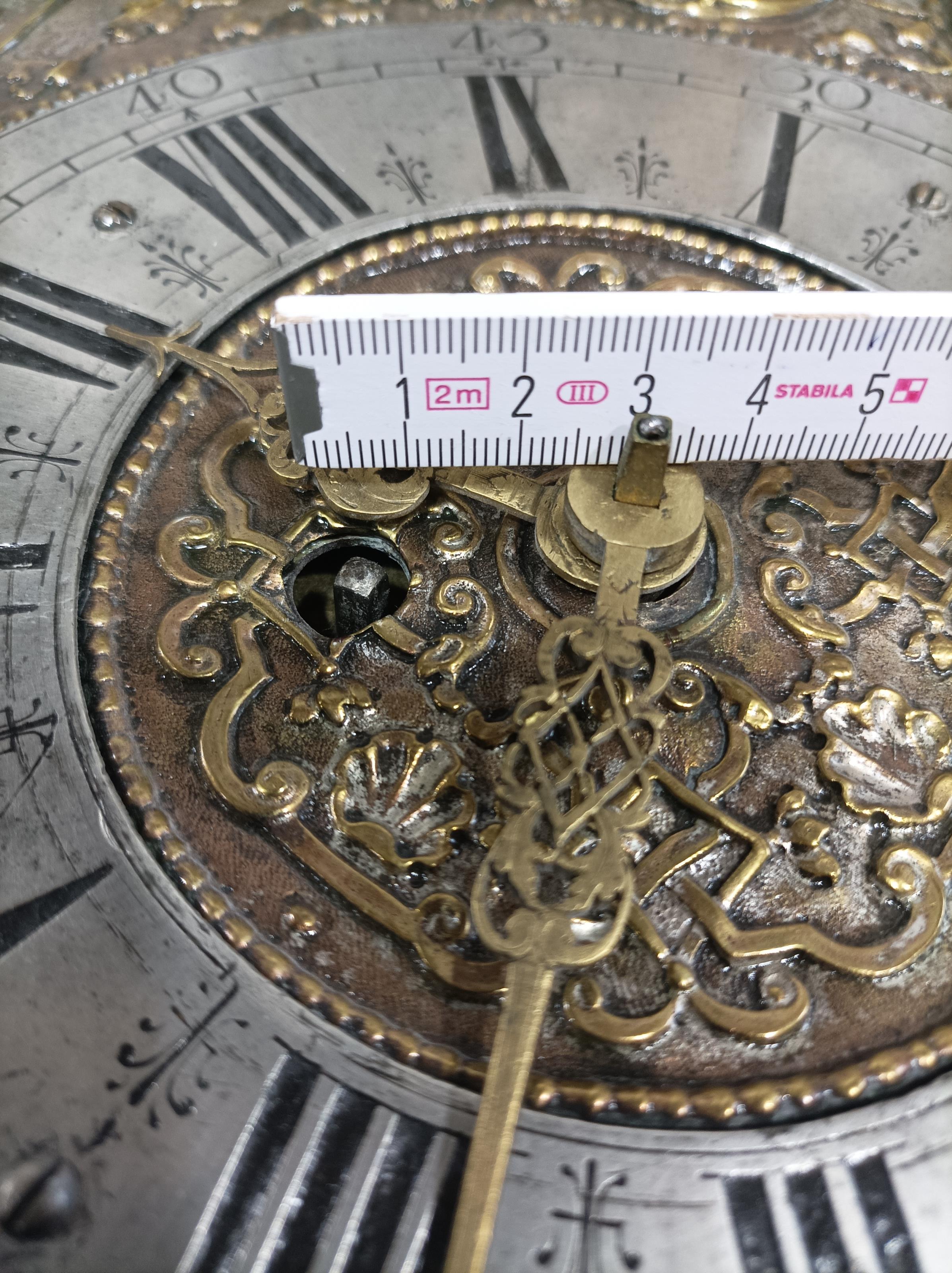 Barocke Wanduhr mit geschweift geschnittener und floral reliefierter Front, verziert mit Rocaillen, Blattwerk und einem kleinen weiblichen Porträtkopf. Altersspuren, Bereibungen, Lötspuren an älteren Rissen und Defekten an der Front.