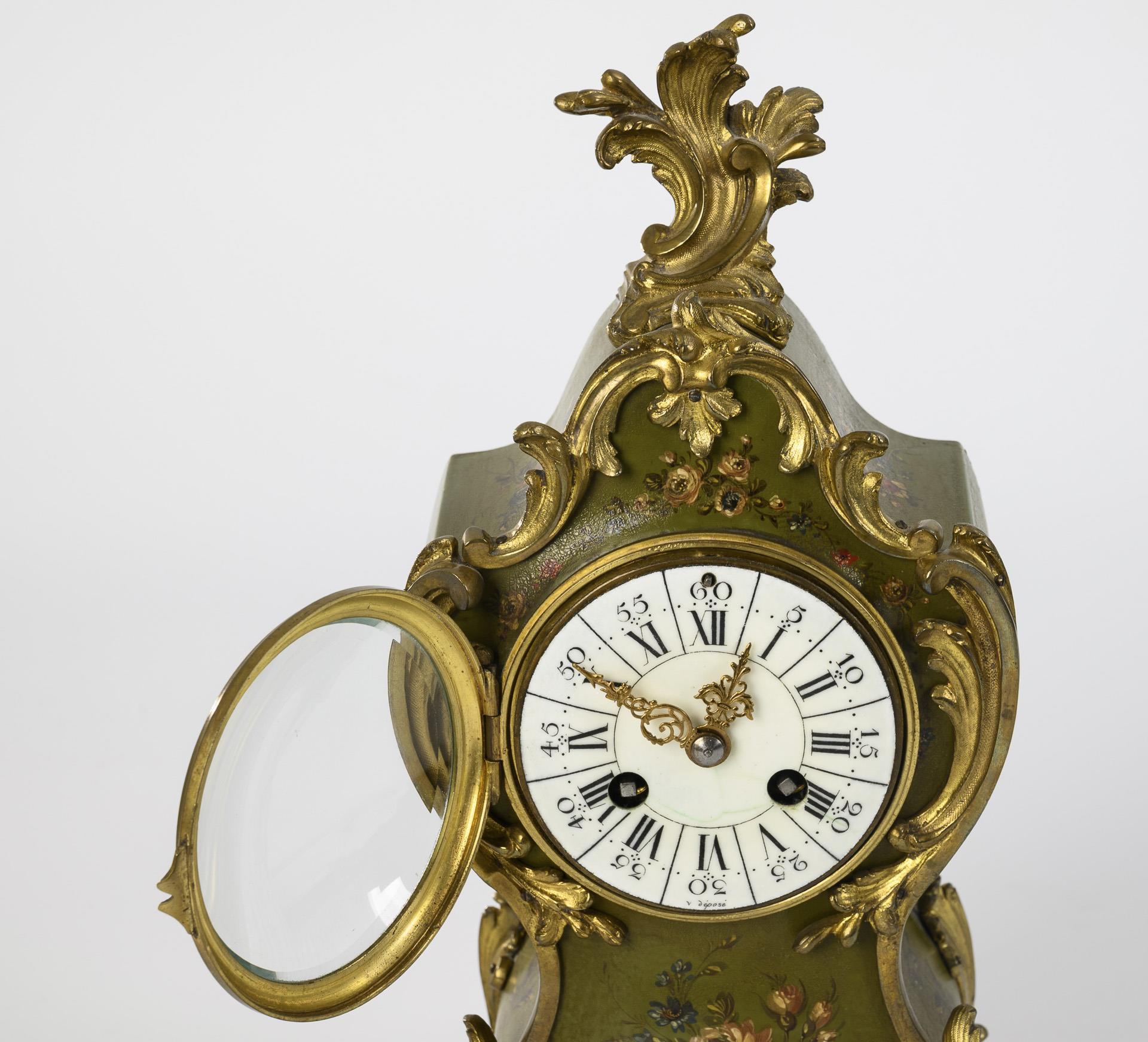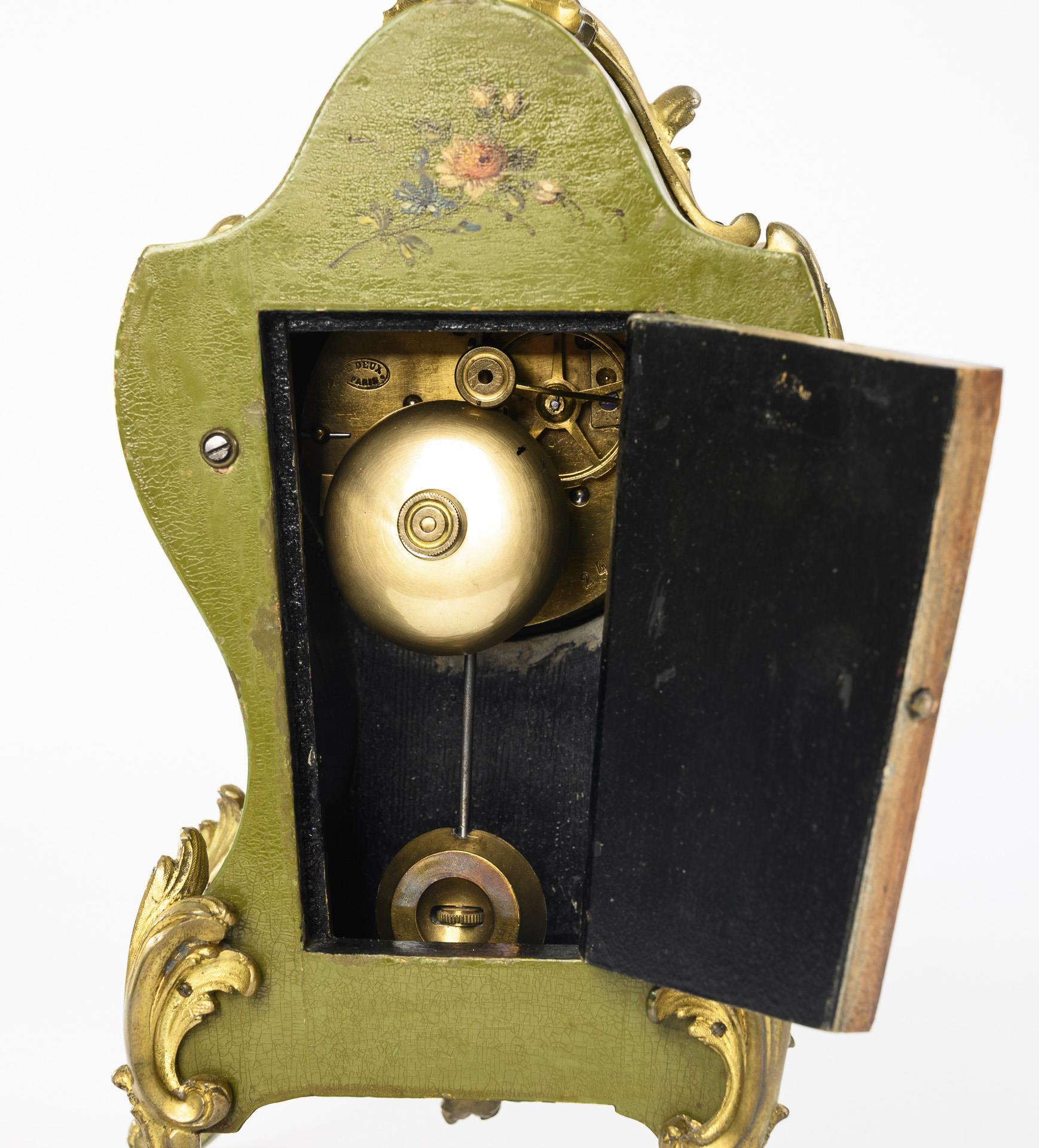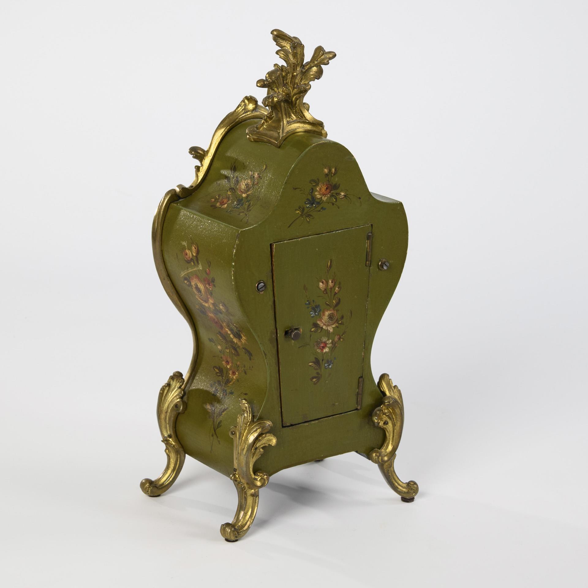 Rocailliertes Gehäuse mit moosgrünem Fond, farbiger Blumenmalerei und rocailliertem Bronze-Blattbeschlag, auf 4 Füßchen. Leichte Alters- und Gebrauchsspuren, Ziffernblatt etwas haarrissig.