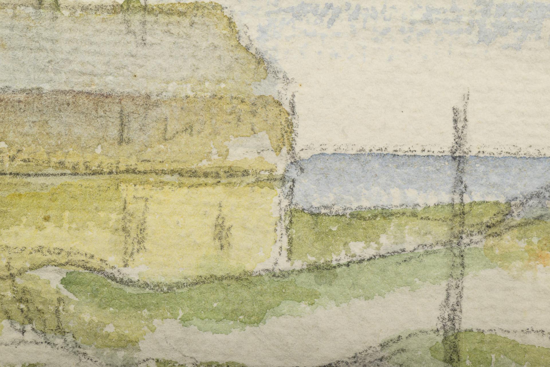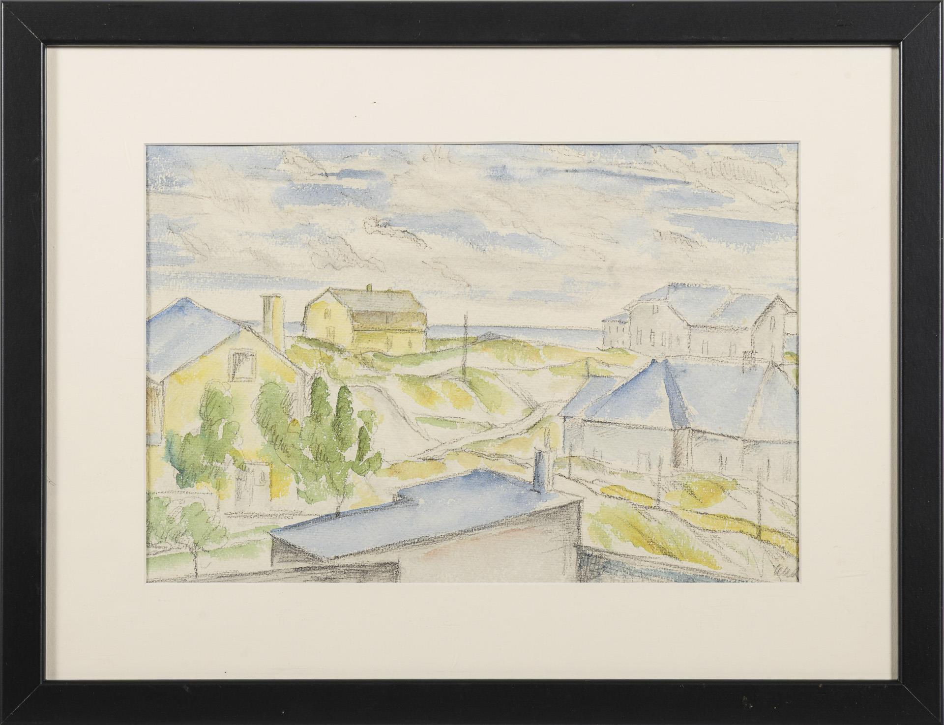 Blick über die Häuser in der hügeligen Landschaft mit dem Meer am Horizont.