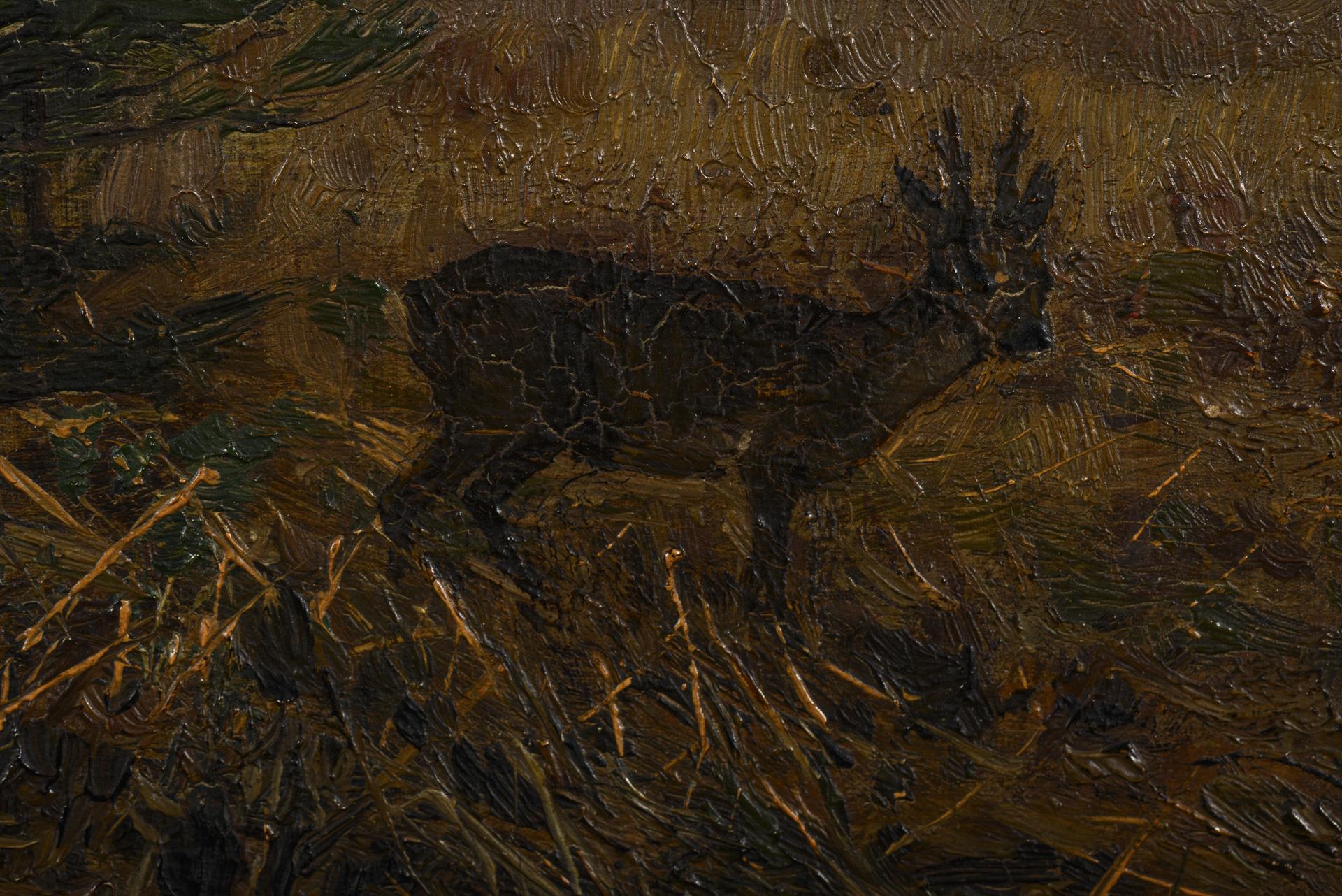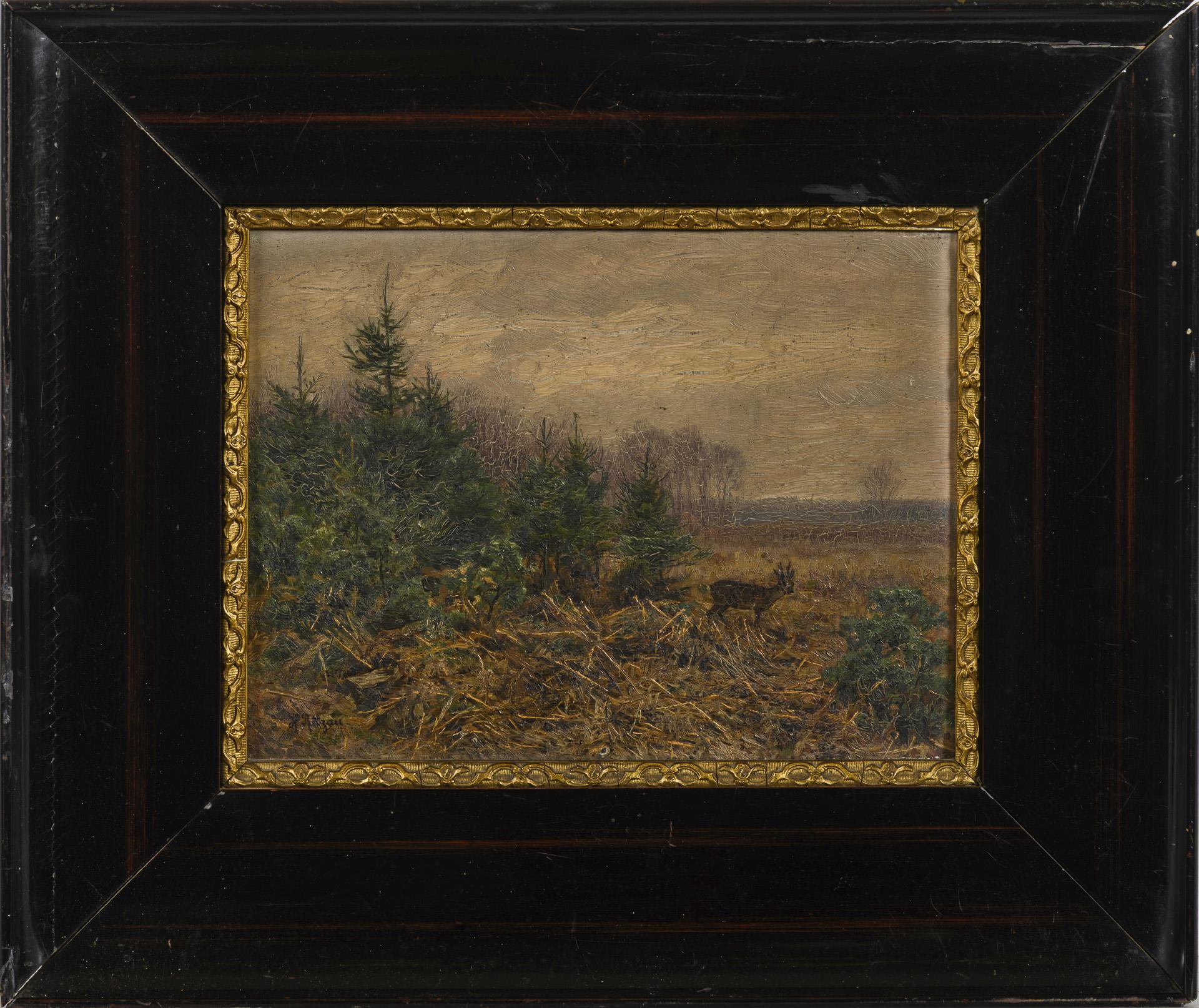Das Tier bei den Tannen im braunen Gras unter grauem Himmel.