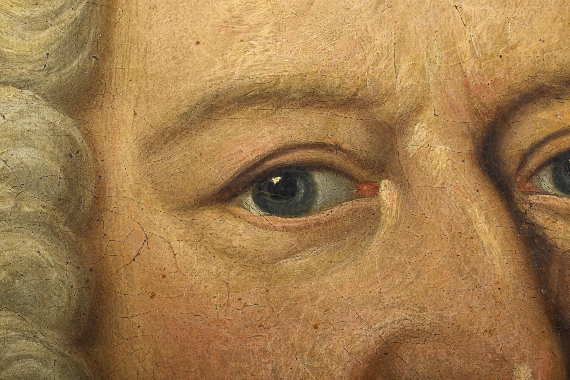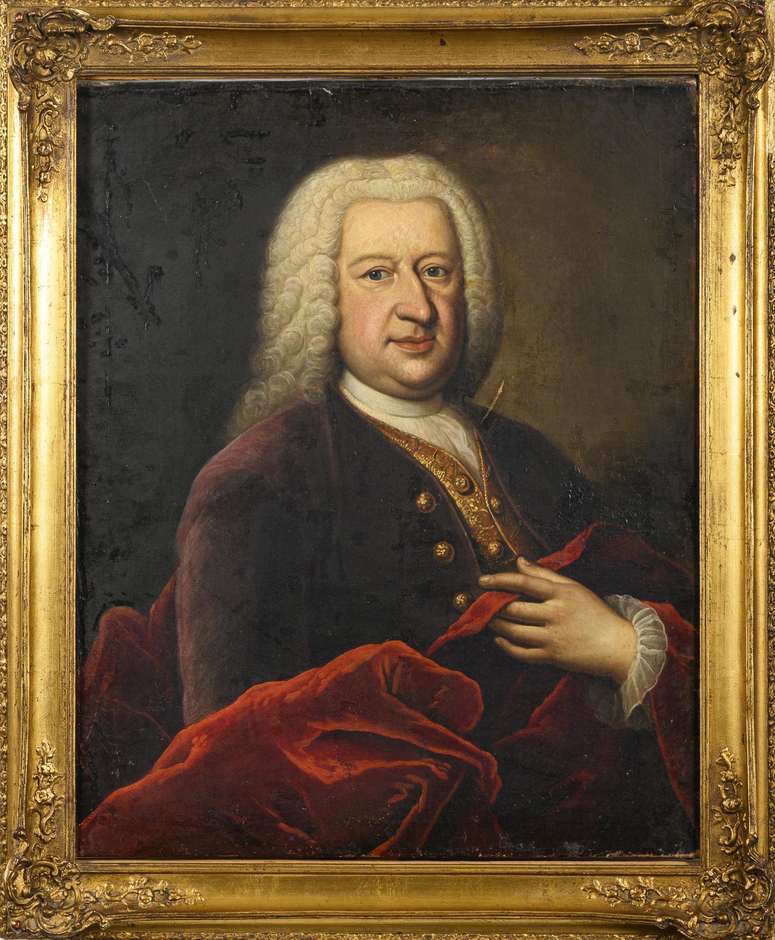 Porträt eines älteren Mannes mit grauer Allongeperücke und in samtenen Gehrock mit rotem Mantel. Leinwand doubliert.