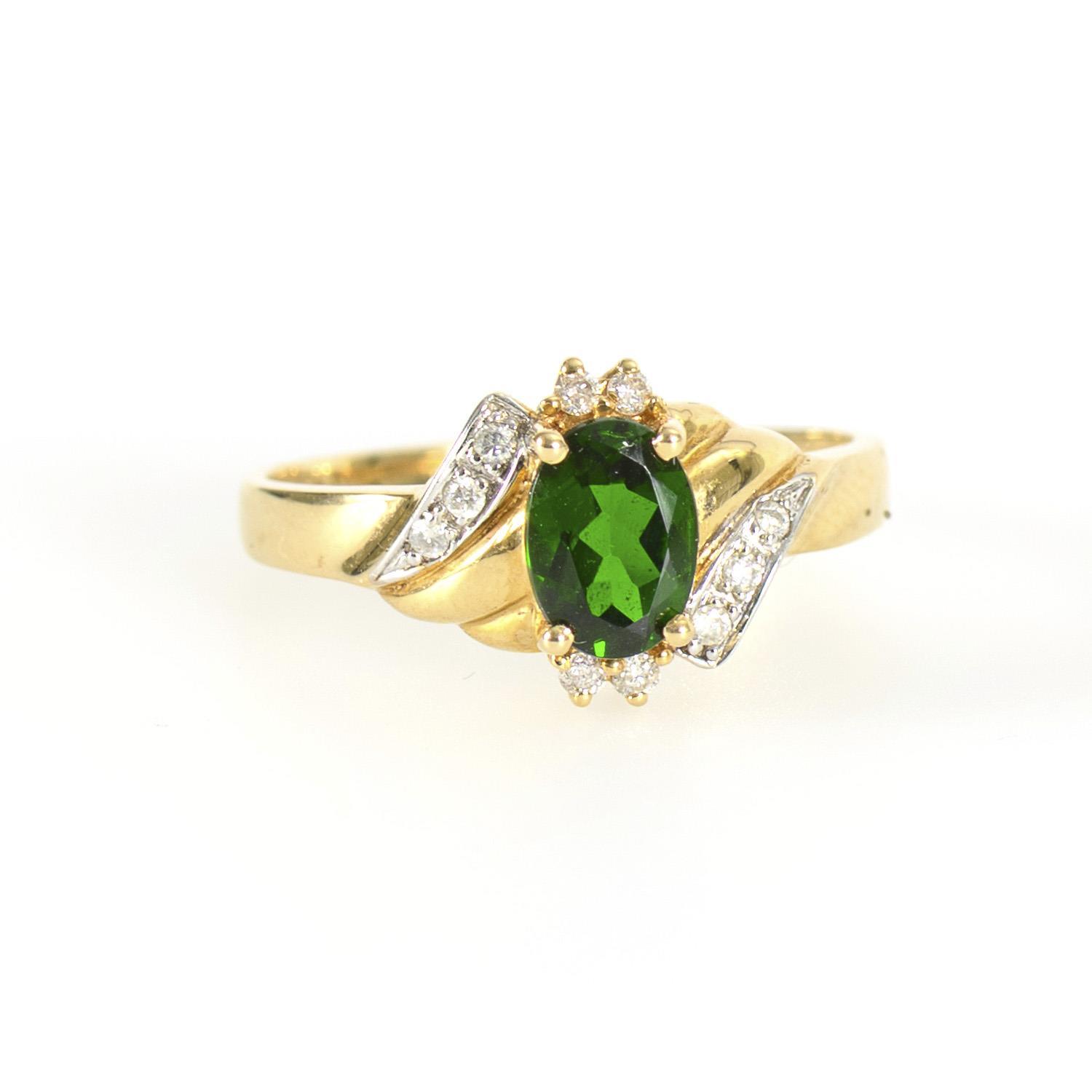 Ring mit ovalfacettiertem, grünen Farbstein in Krappenfassung, von insgesamt 4 größeren und 6 kleineren je in Weißgold gefassten Brillanten eingerahmt.