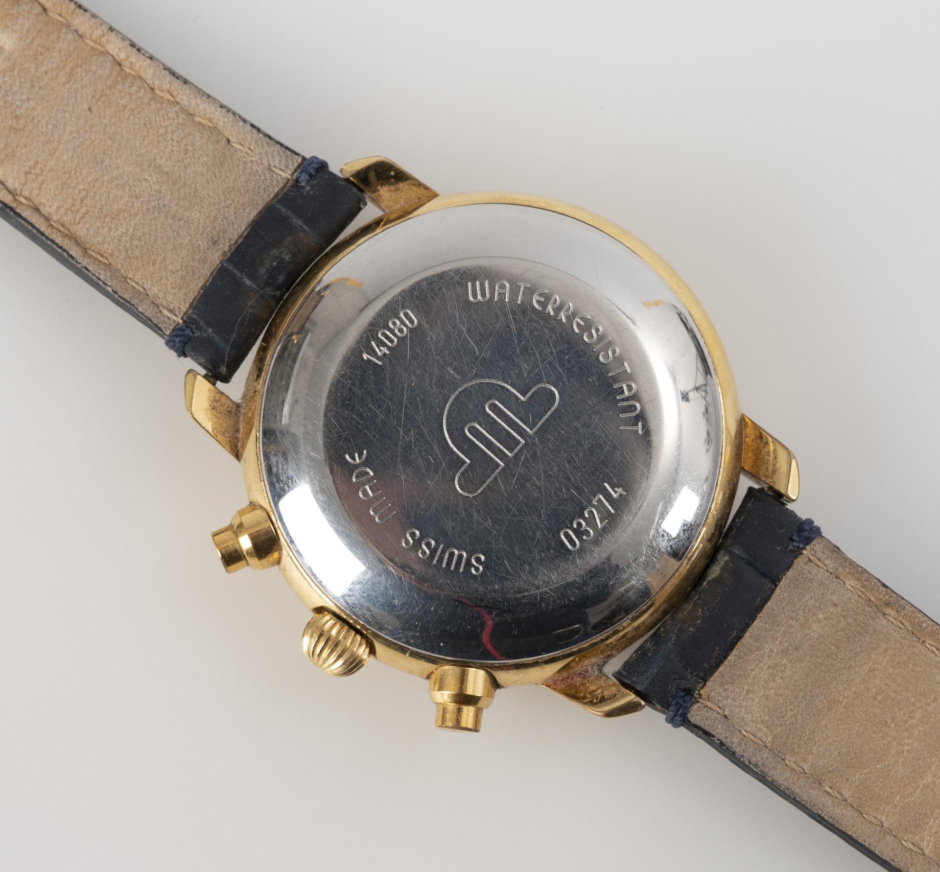 Rundgehäuse mit gestufter Lünette, nachtblauem Ziffernblatt, römischen Stundenindizes, Minutenkranz und 1/5-Sekundeneinteilung, 3 Perlmutt-Hilfsziffernblätter für kleine Sekunde, 30-Minuten und 12-Stunden, Datum bei der 3 mit Schnellschaltung, äußere Tachymeter-Skala bis 500, Messing-Lochzeiger, Chronograph mit Zentralsekunde und seitlichen Stellknöpfen. An blauem Krokodillederband. Leichte Gebrauchsspuren.