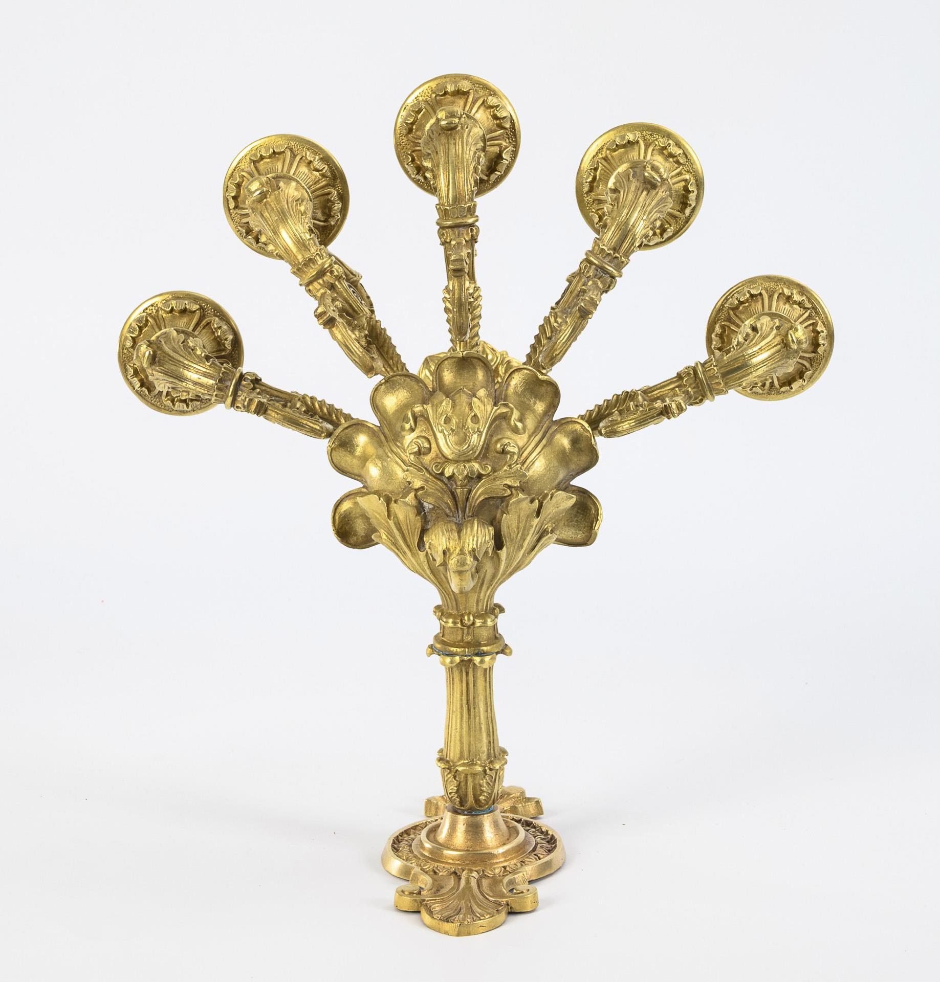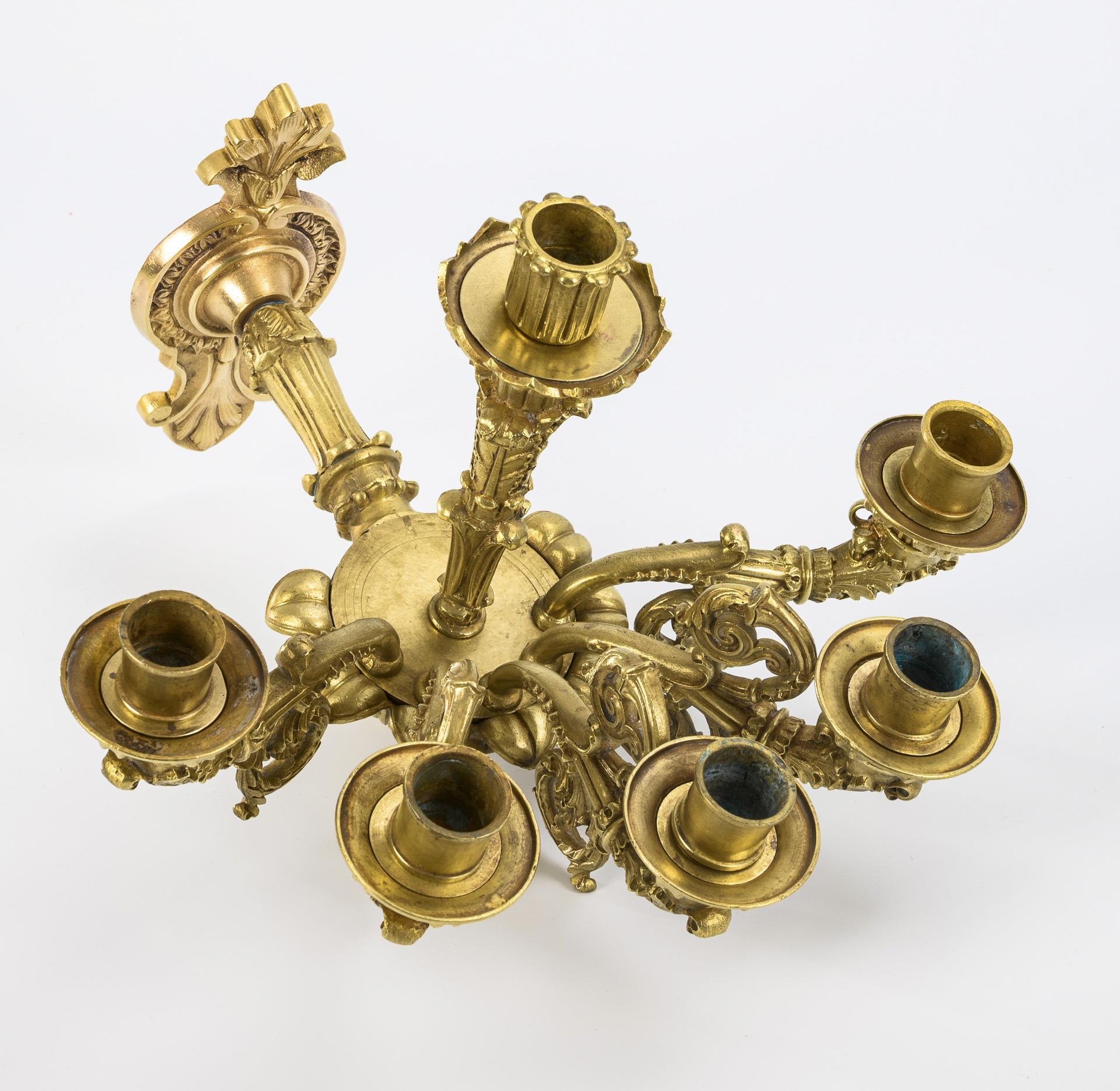 Sechsflammiger Wandkerzenleuchter mit einem Mittelschaft und fünf akanthusverzierten Leuchterarmen mit Tüllen und Tropfschalen. Kleine Haarrisse.