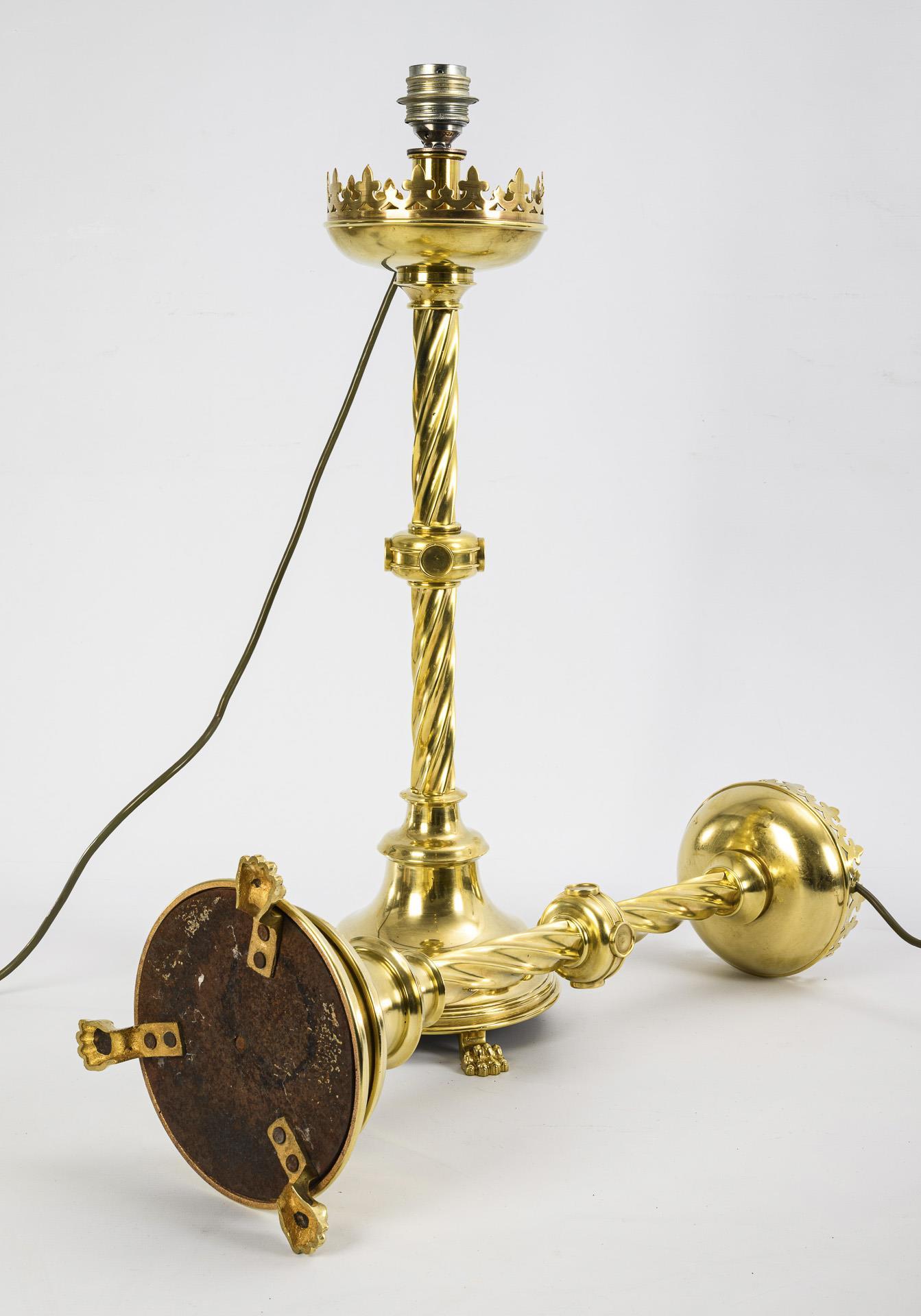 Leuchter in neogotischer Form mit mehrfach profiliertem, rundem Fuß auf drei Tatzenpfoten. Der gedrehte Säulenschaft ist durch einen Nodus unterbrochen. Der Fuß ist mit einer Eisenplatte beschwert. Später elektrifiziert und mit einer Fassung für handelsübliche Lampenschirme (E27). Alt elektrifiziert. Kleinere Kratzer und Dellen, teils leicht rötlich verfärbt. Funktion nicht geprüft.