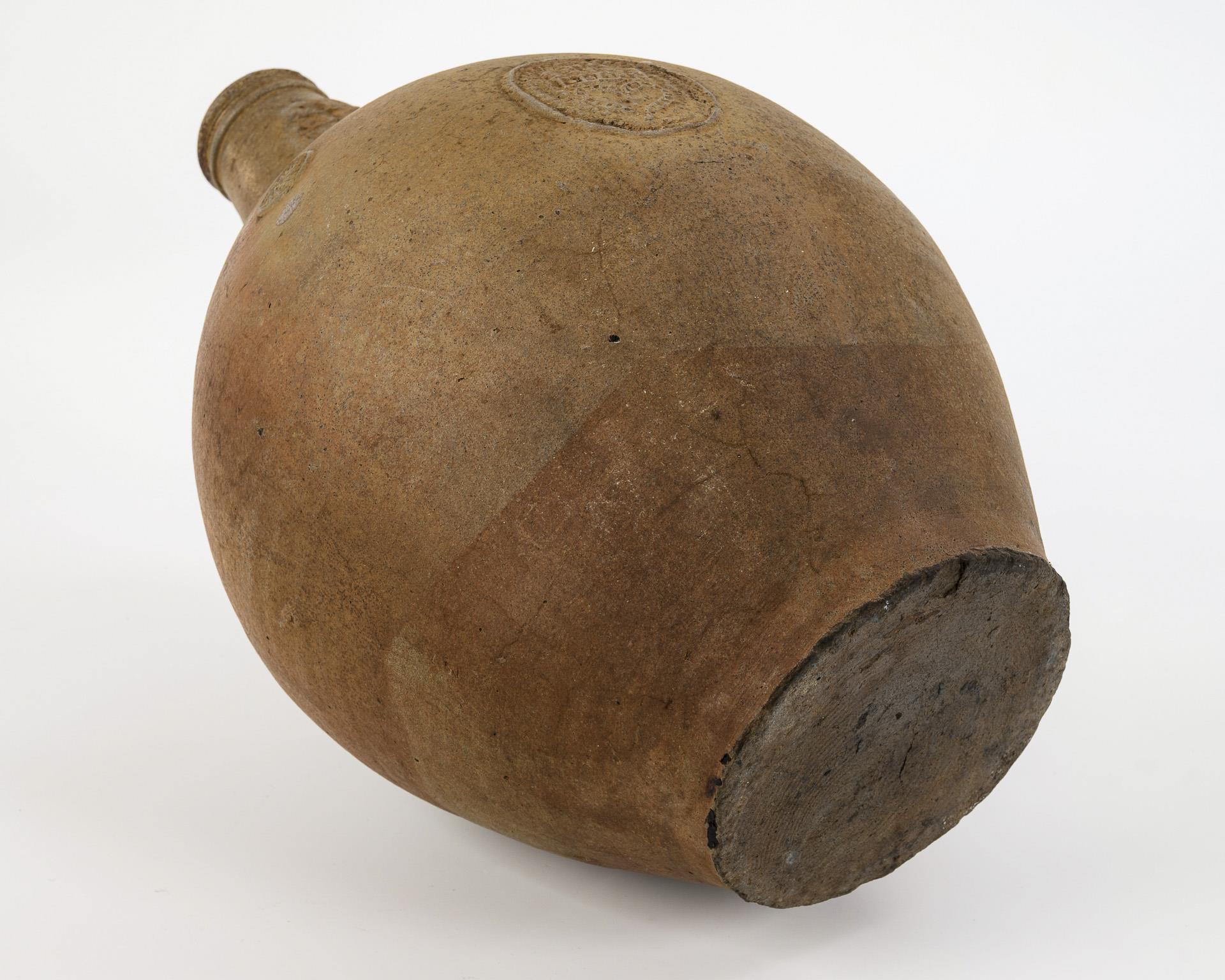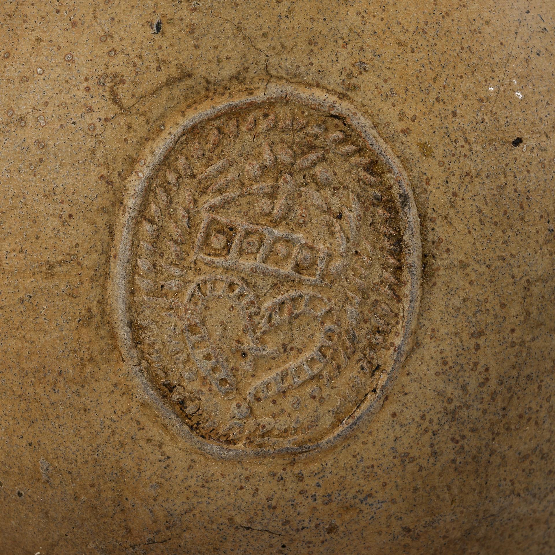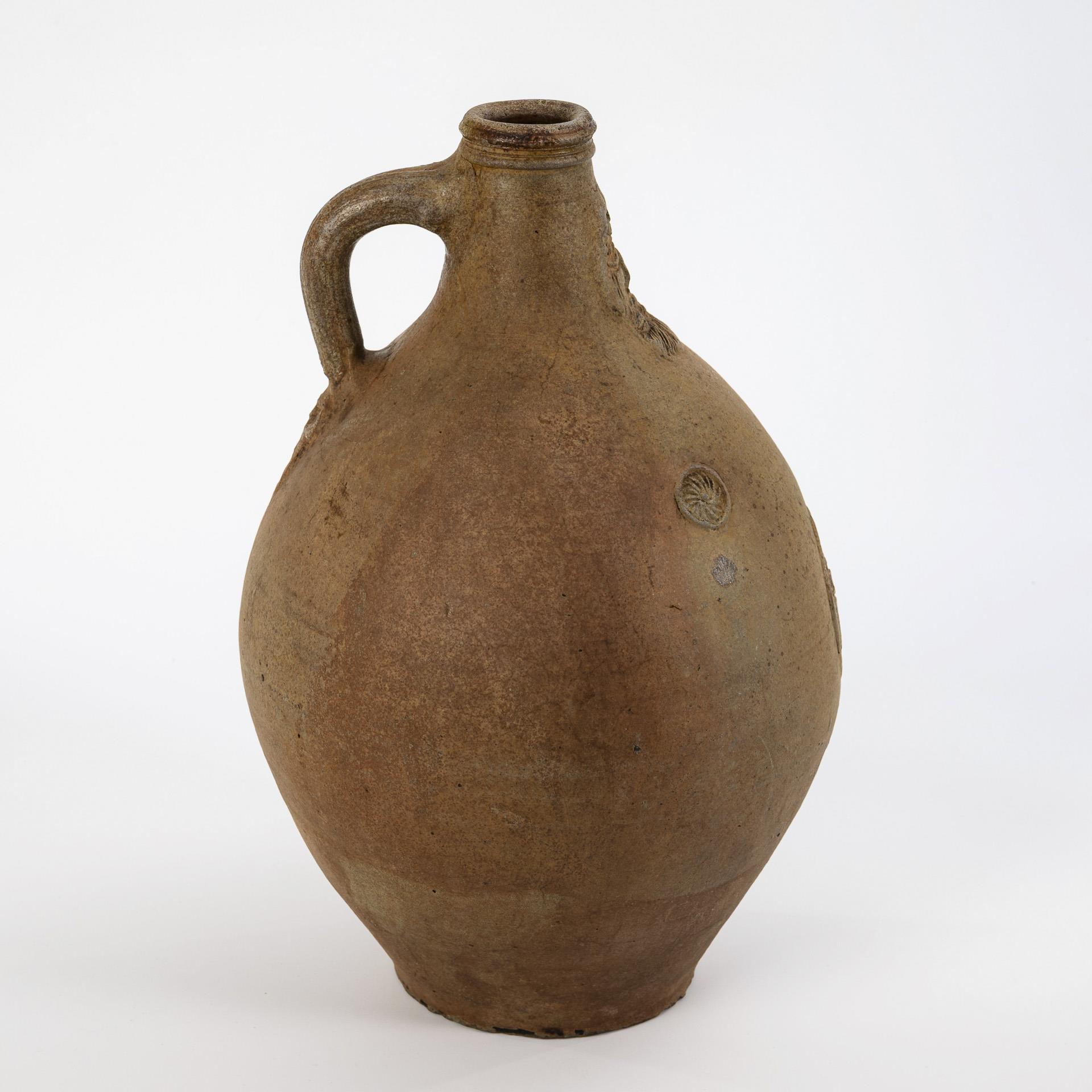 Ovoider Gefäßkörper mit geplattetem Stand, gerilltem Enghals und gekehltem Henkel mit spitz auslaufendem Ansatz und Daumenabdrücken. Auflagendekor mit Bartmaske und einem Ovalmedaillon mit einem bekrönten Herz, flankiert von 2 kleinen Rosetten. Altersspuren, Wandungsrisse, Fußrand bestoßen.