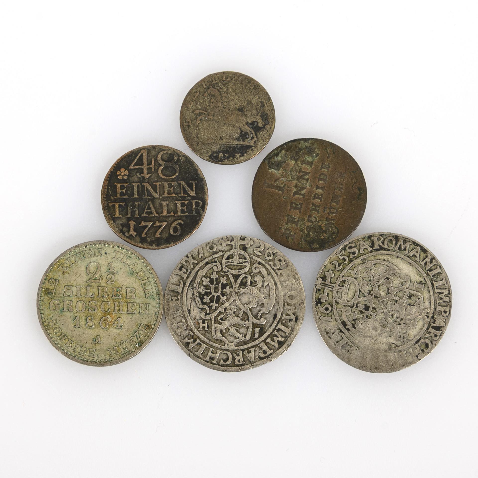 2x 1 Groschen Sachsen, "Johann Georg D G Dux Sax Iul Cl et M", 1625 und 1626, Zustand: sehr schön+ / 2 1/2 Silbergroschen 1864, "Wilhelm Koenig von Preussen", Münzstätte A, Zustand: sehr schön - vorzüglich. / 48 einen Thaler 1776, bekröntes Monogramm FR, Münzstätte A, Kupfermünze, Zustand: vorzüglich. / I Pfennig Scheidemünze, Hannover, 1827, Kupfer, Zustand: sehr schön. / "VI Pfenn 1823 C.v.C.", Braunschweig, Zustand: fast sehr schön.