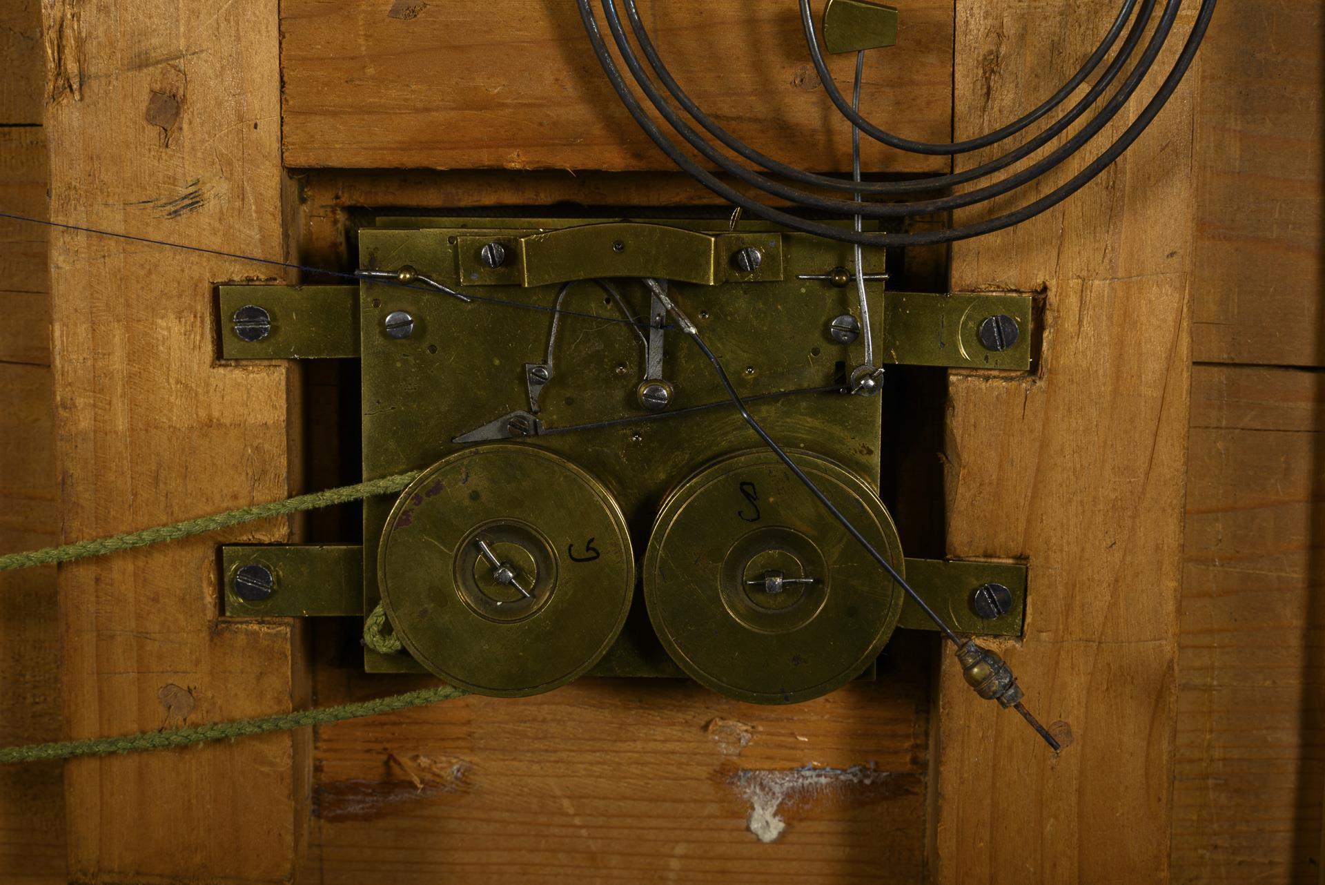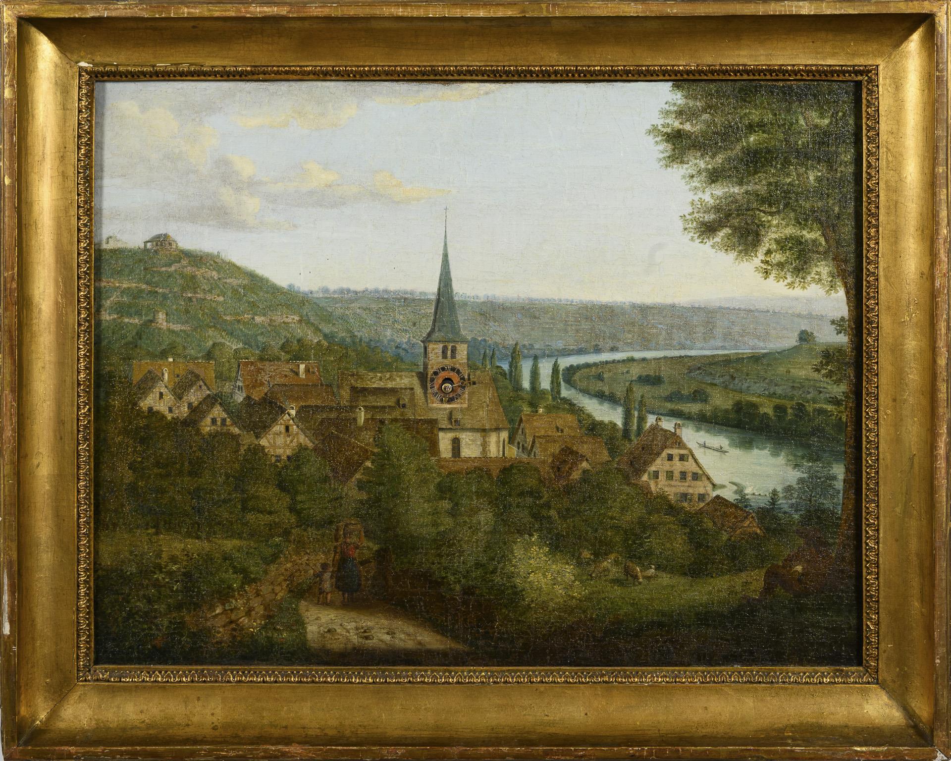 Bergige Gegend mit einer Stadt an einer Flussbiegung. Die Zeiger der Uhr ragen aus dem gemalten Ziffernblatt des Kirchturms heraus. Retuschiert, Uhrwerk läuft an, Dauerfunktion nicht getestet, Teile des Pendels fehlen.