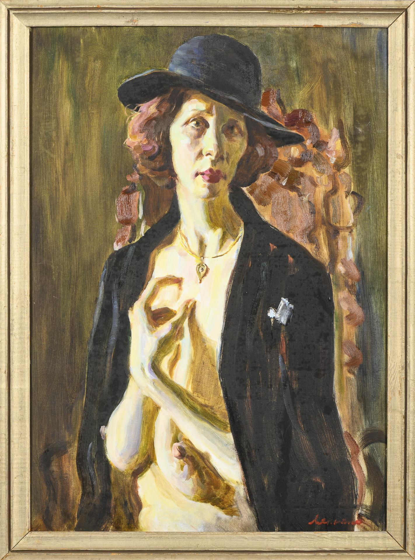 In Anlehnung an die Neue Sachlichkeit gemalte ältere Frau mit entblößtem Busen auf einem Stuhl.