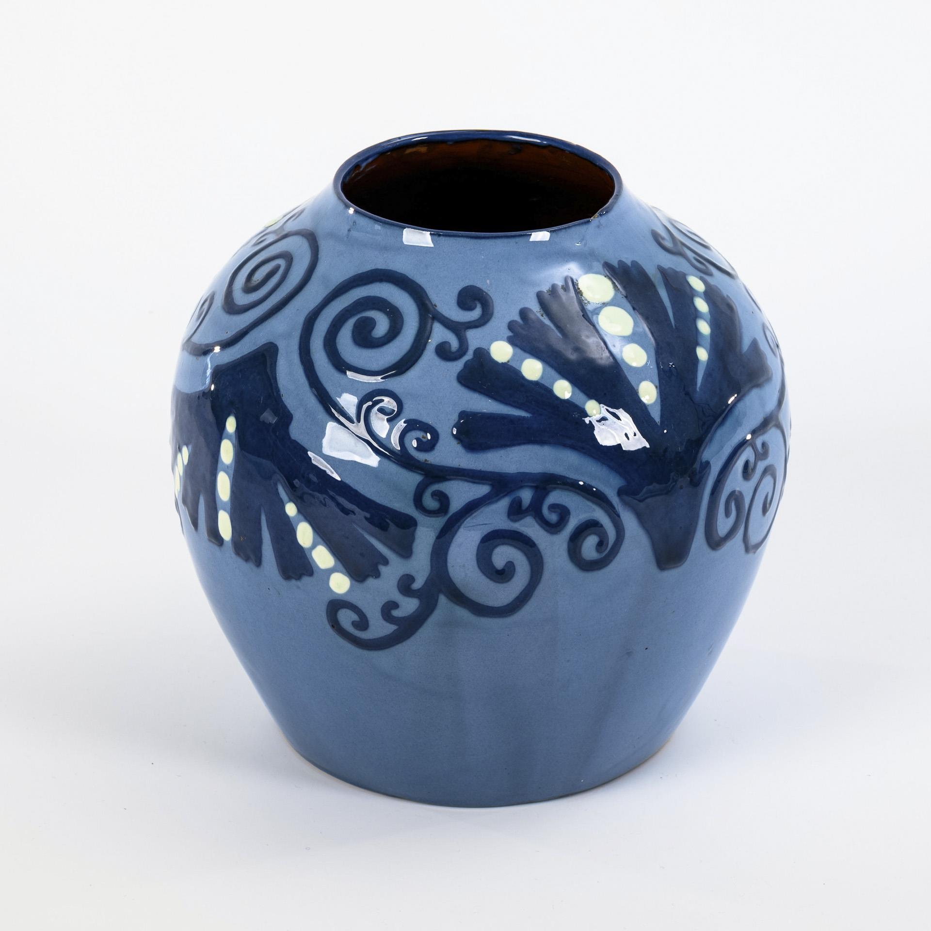 Bauchig ovoide Form mit leicht eingezogenem Hals, umlaufend im Schulterbereich ein stilisierter Floraldekor. 1 kleiner Produktionsfehler und 1 kleiner Glasurchip am Rand.