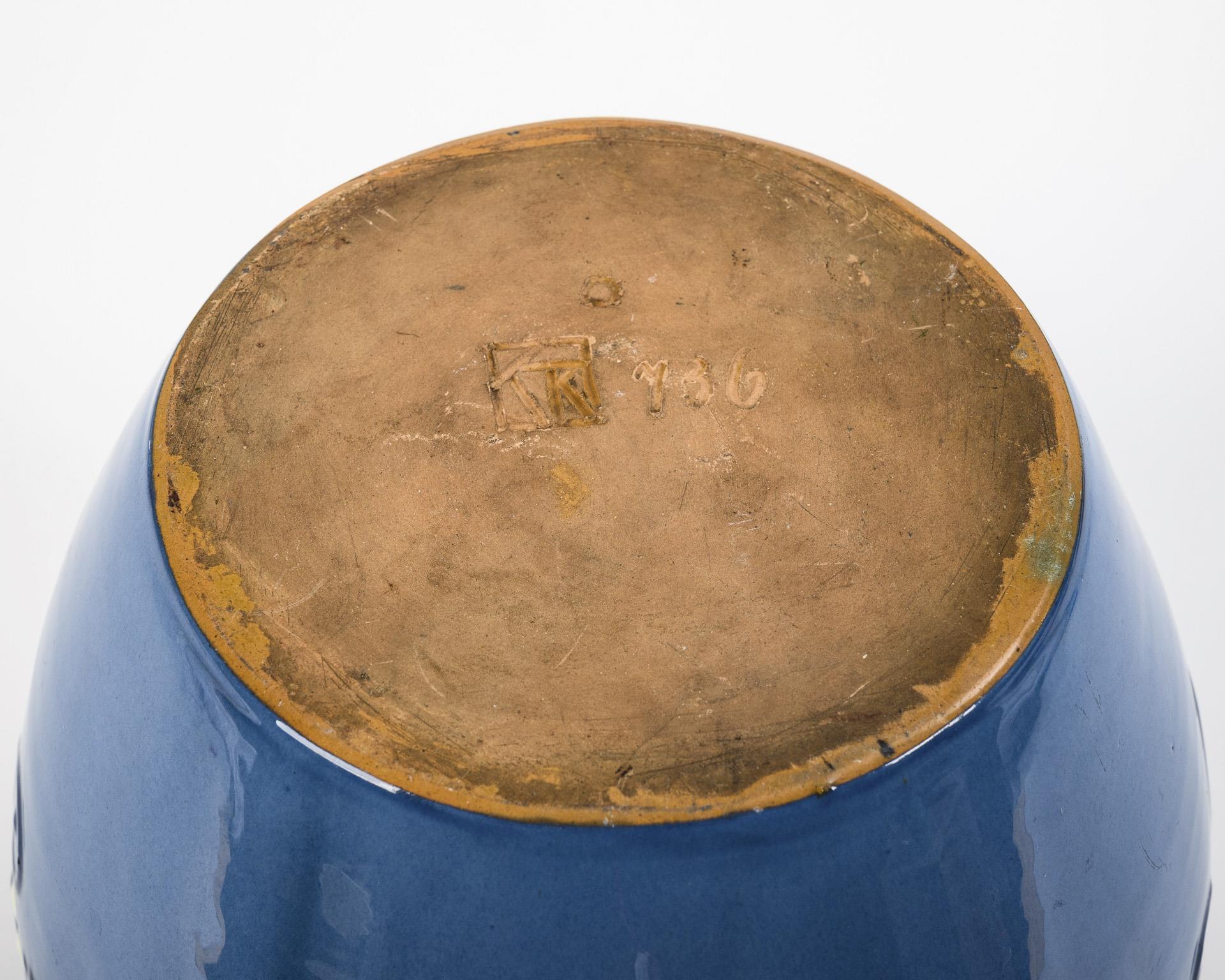 Majolika, blau glasiert und mit Schlicker in Dunkelblau und Weiß bemalt. H 20 cm.